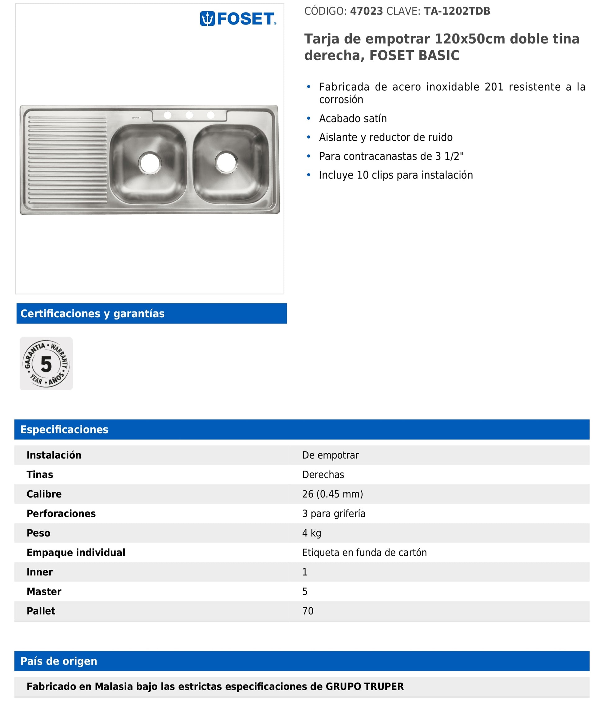 Fabricada en acero inoxidable 201, resistente a la corrosión. Cuenta con acabado satín, aislante reductor de ruido y diseño con tinas derechas. Es compatible con contracanastas de 3 1/2" e incluye 10 clips para instalación.