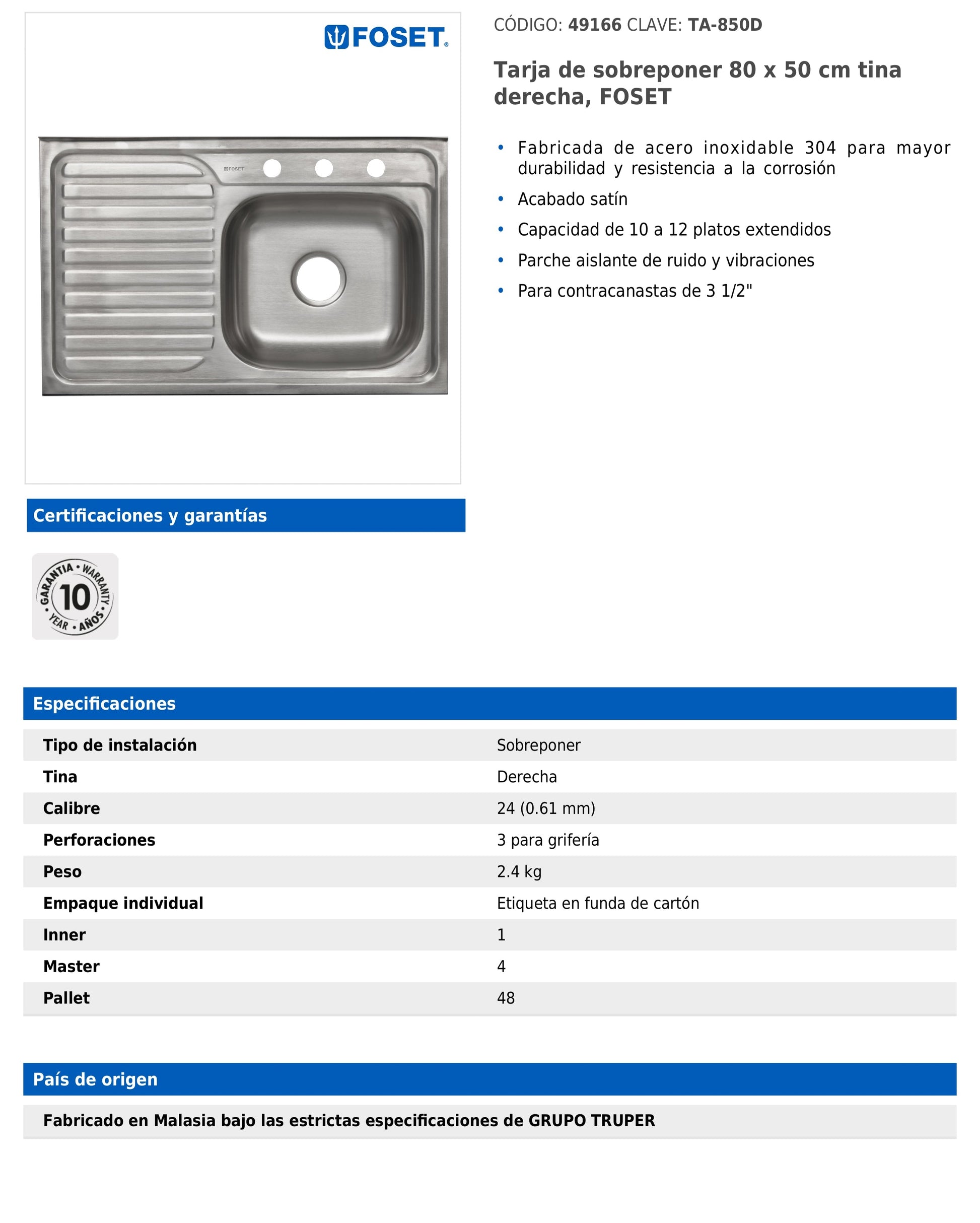 Tiene capacidad para 10 a 12 platos extendidos, es compatible con contracanastas de 3 1/2" y cuenta con perforaciones para grifería. El diseño con tina derecha se adapta perfectamente a espacios funcionales.