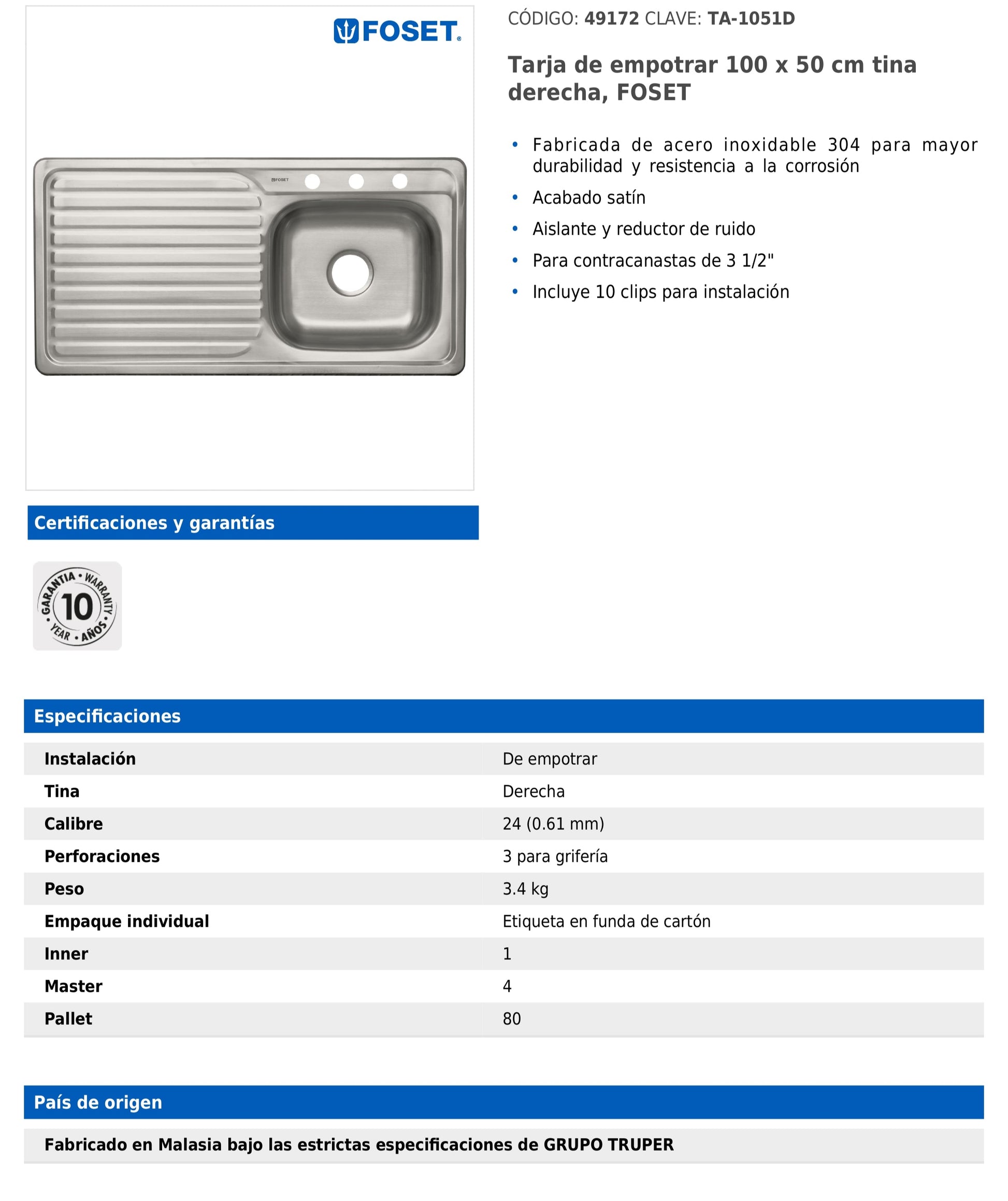 Incluye 10 clips para facilitar su instalación y su tina está ubicada del lado derecho.