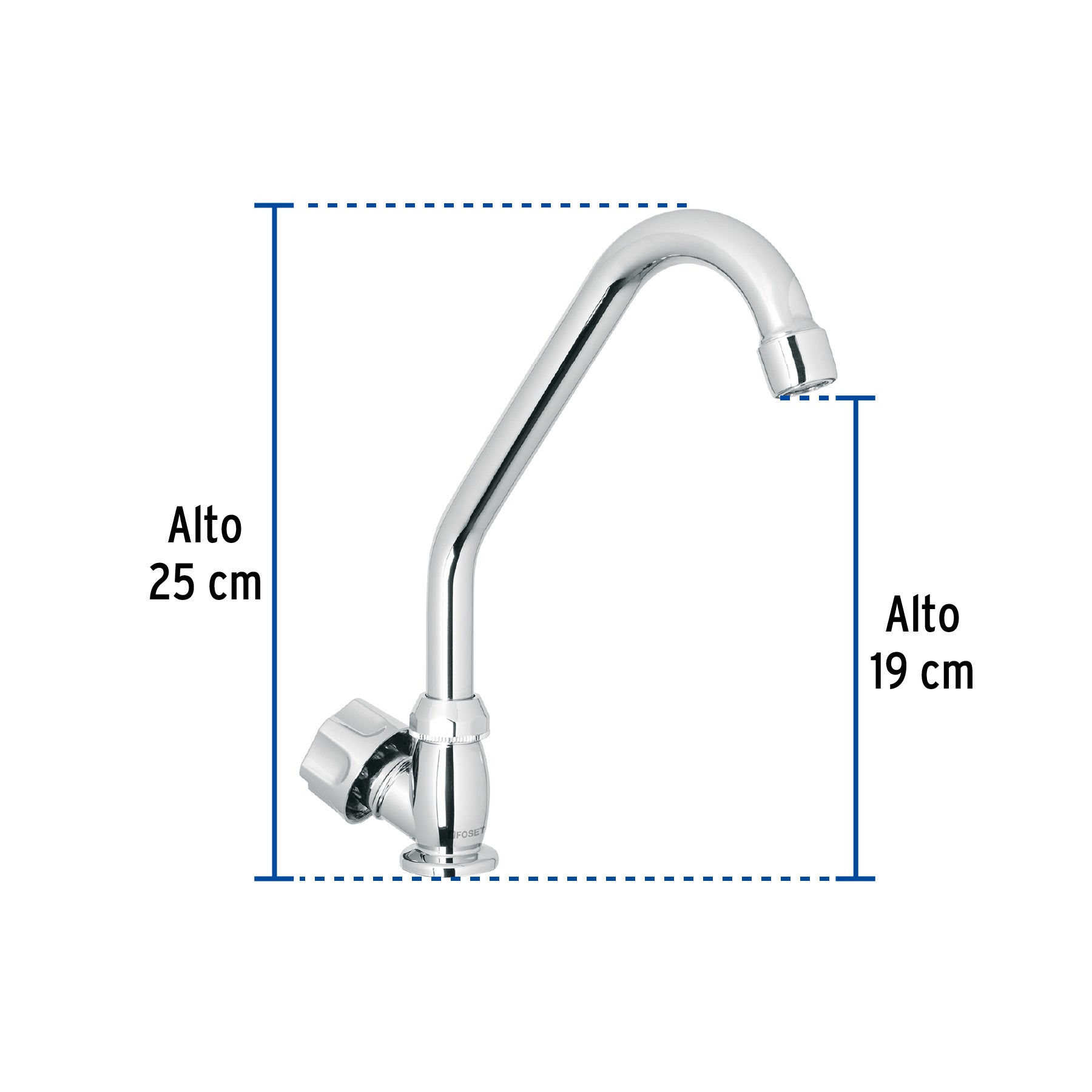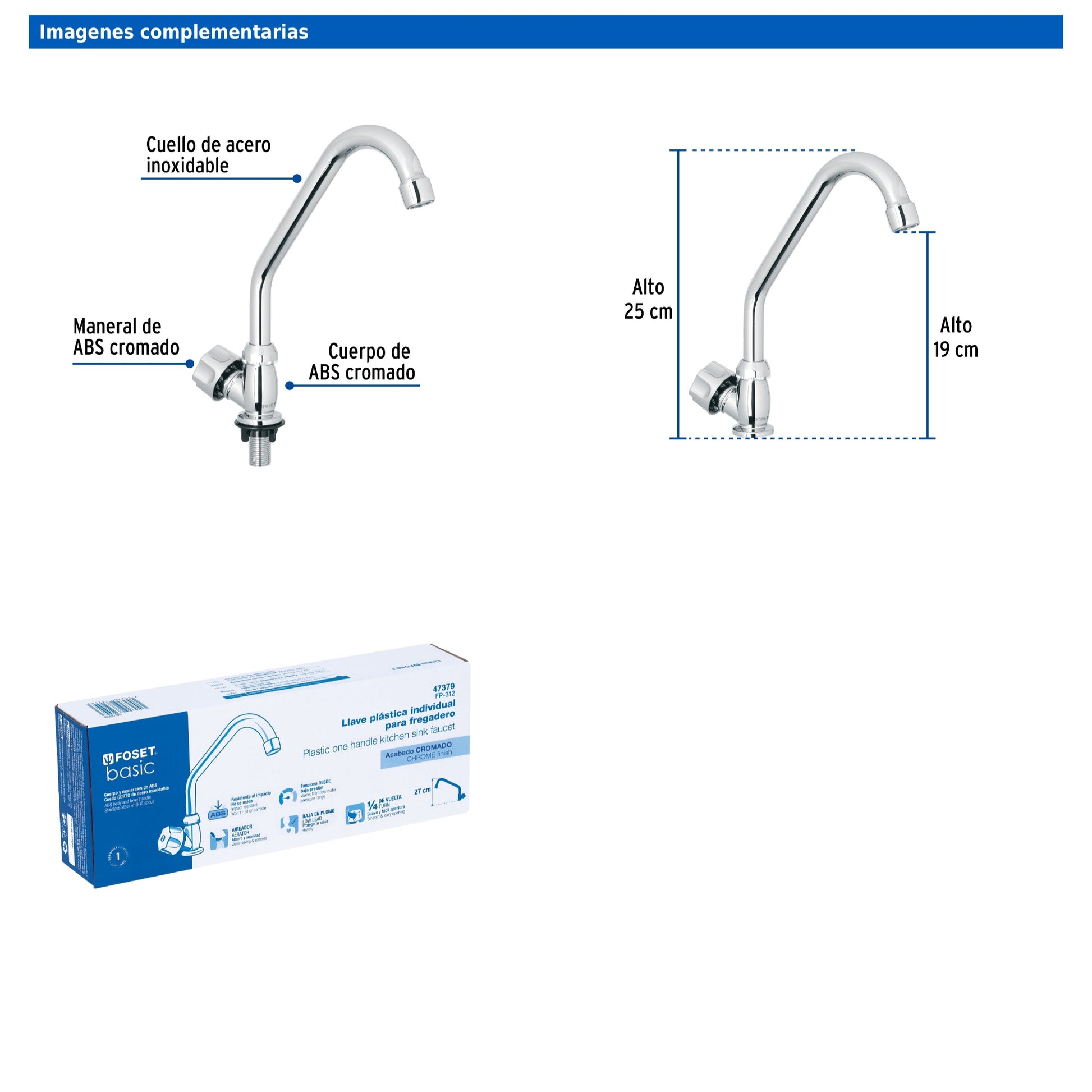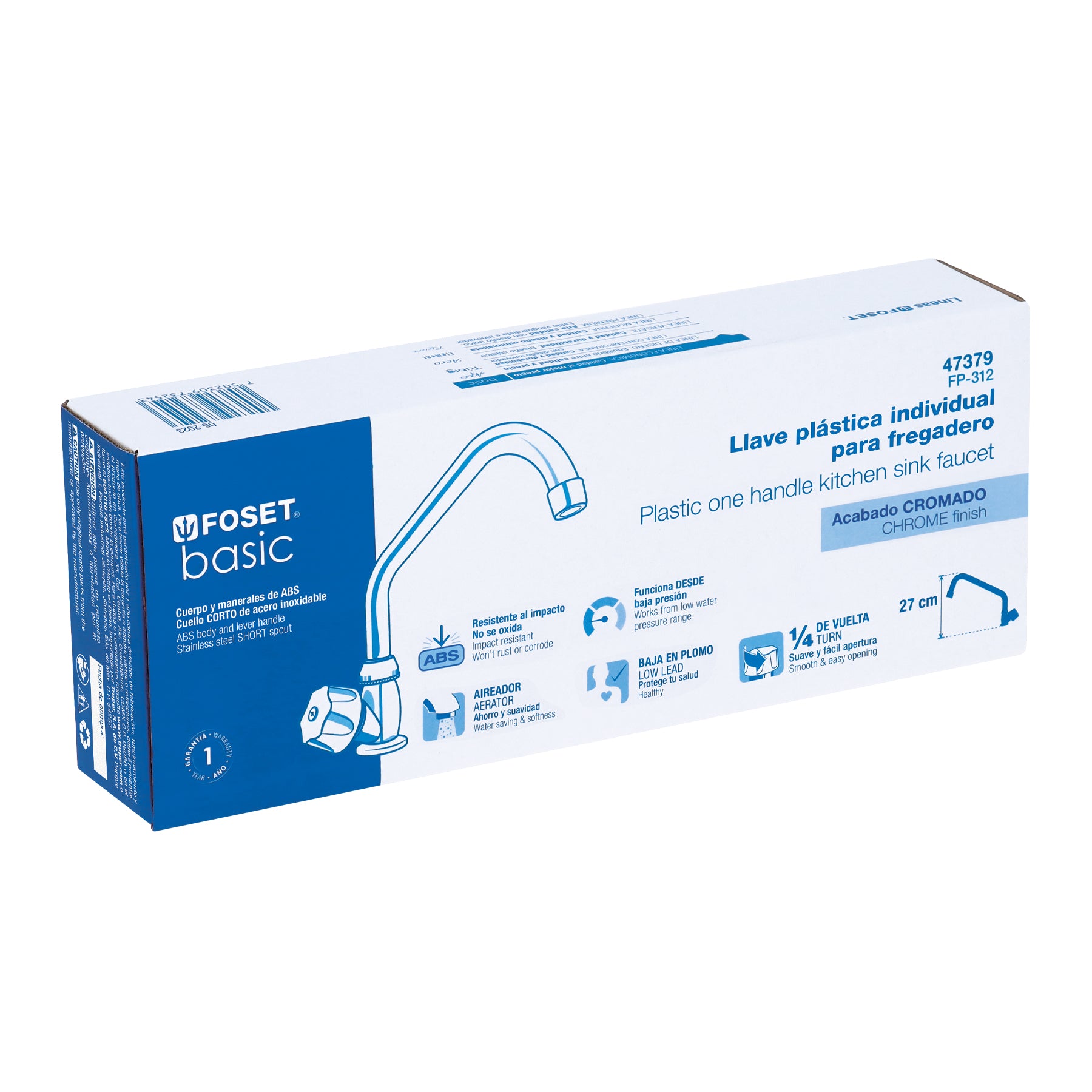 Llave Foset Basic fabricada en ABS con acabado cromo que no se oxida, ideal para zonas costeras o ambientes húmedos. Cuenta con cuello corto de acero inoxidable, maneral hexagonal y cartucho cerámico de 1/4 de vuelta. Incluye aireador para un flujo eficiente y uniforme.