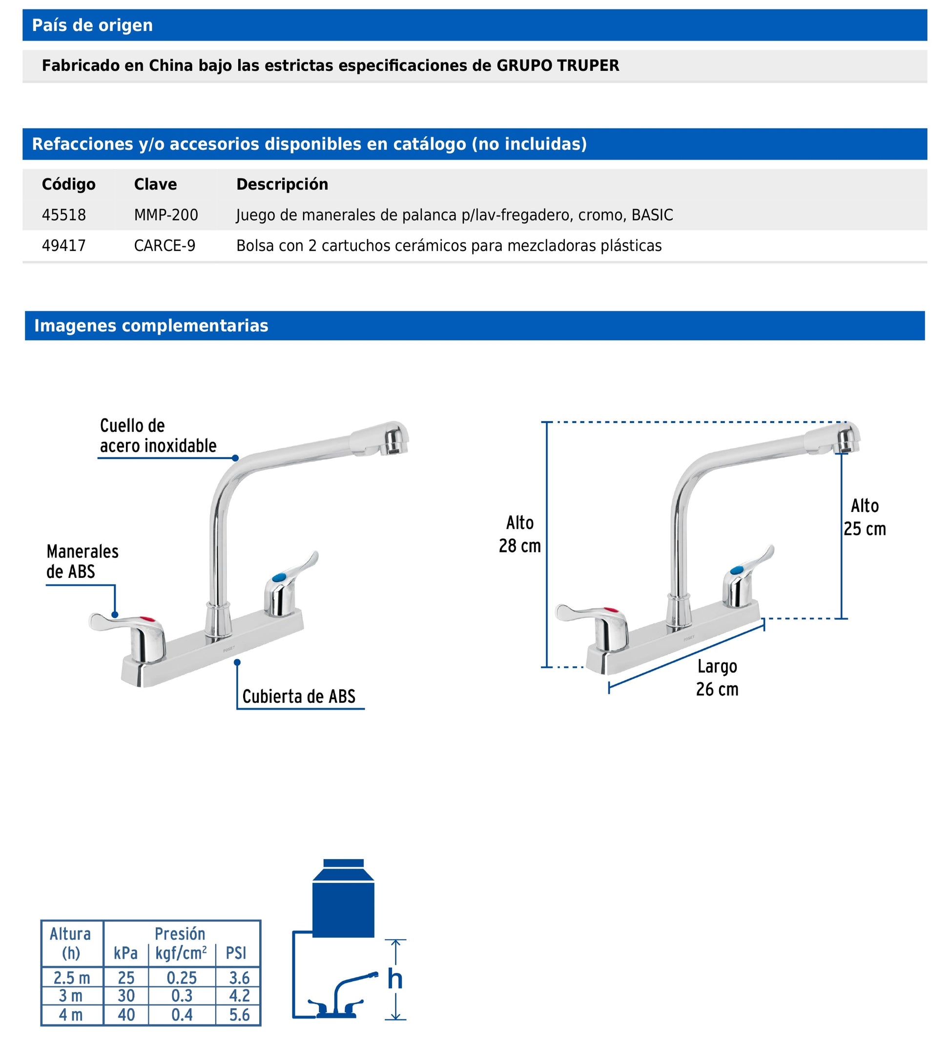 Mezcladora Foset Basic para fregadero con cuerpo termoplástico de alta resistencia y cuello tipo cobra de acero inoxidable. Incorpora manerales tipo palanca y cubierta de ABS cromado que no se oxida. El cartucho cerámico de 1/4 de vuelta brinda una apertura suave y precisa, ideal para zonas costeras o ambientes húmedos.