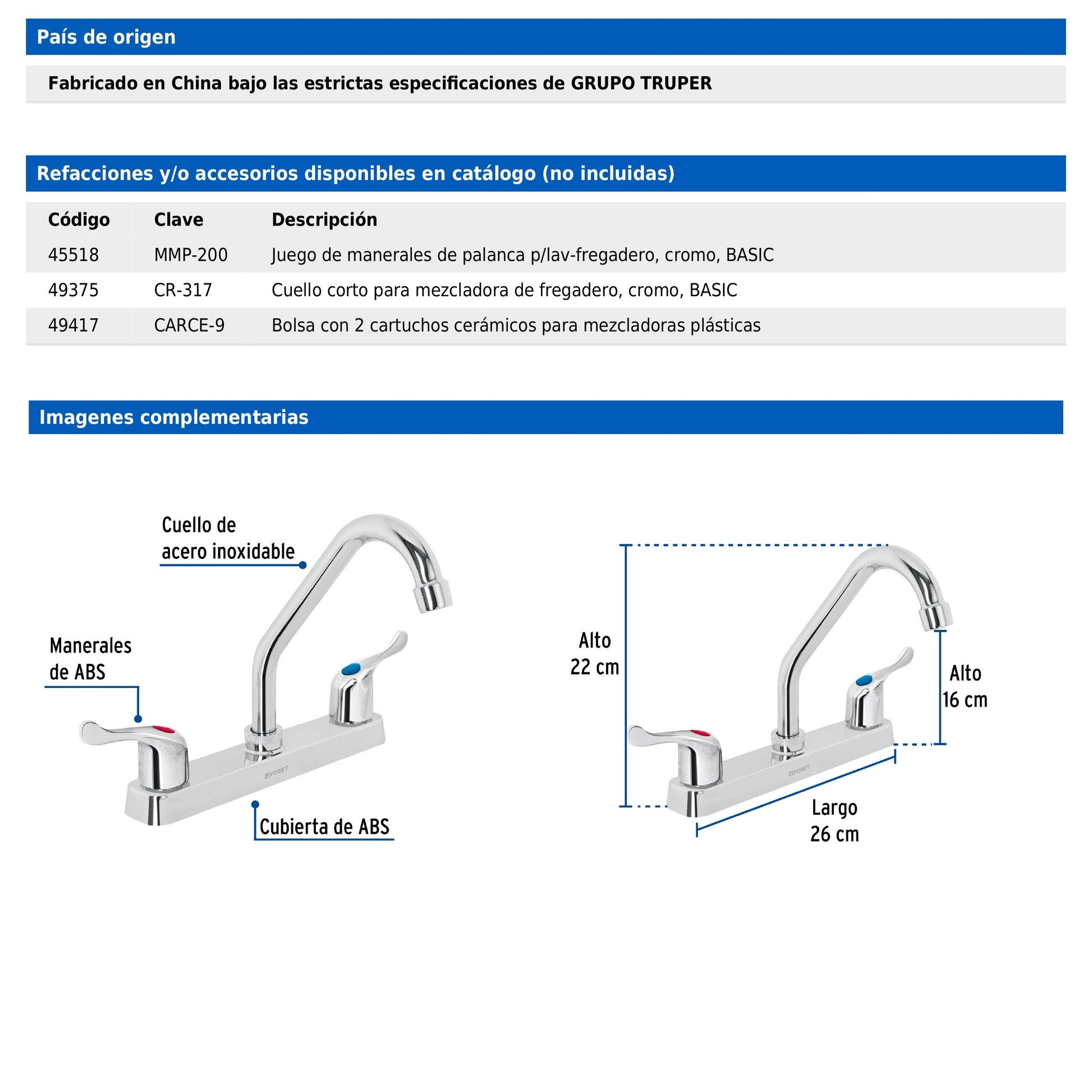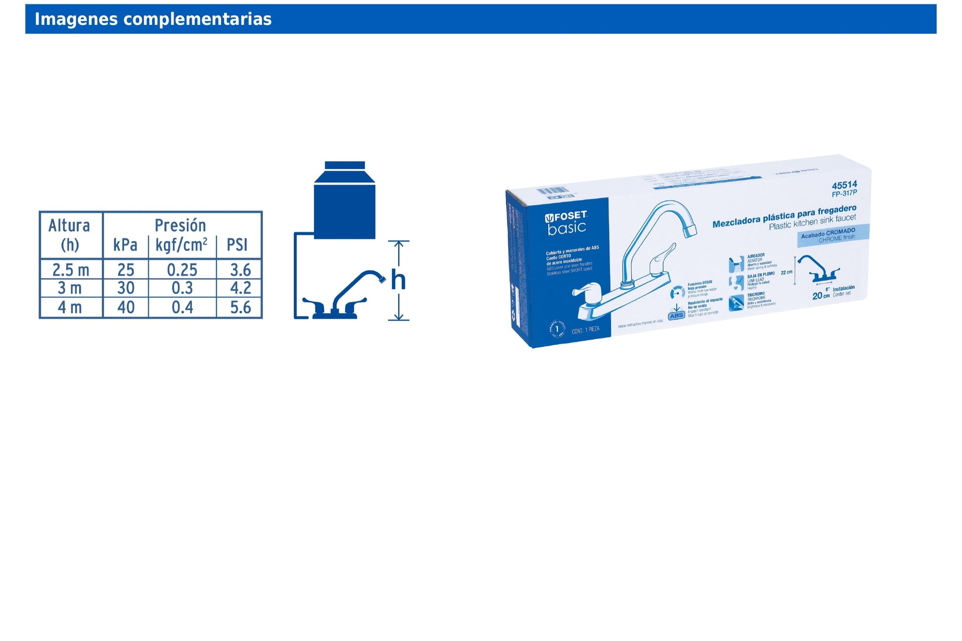 Mezcladora Foset Basic para fregadero con cuerpo termoplástico de alta resistencia y cuello corto de acero inoxidable. Diseñada para instalaciones a 8" entre taladros, incluye manerales tipo palanca y cubierta de ABS cromado que no se oxidan. Incorpora cartucho cerámico de 1/4 de vuelta que permite una apertura suave. Ideal para zonas costeras o húmedas.