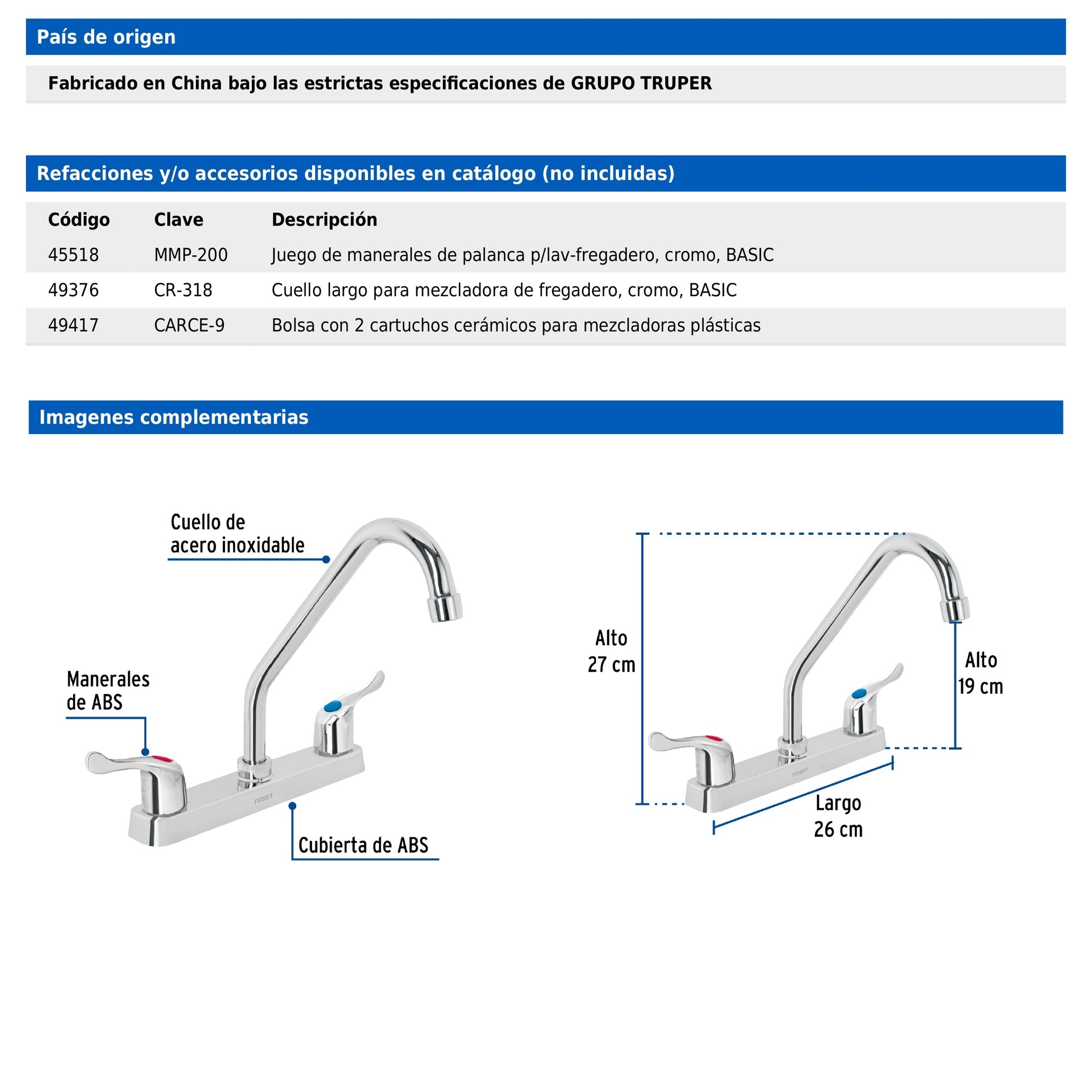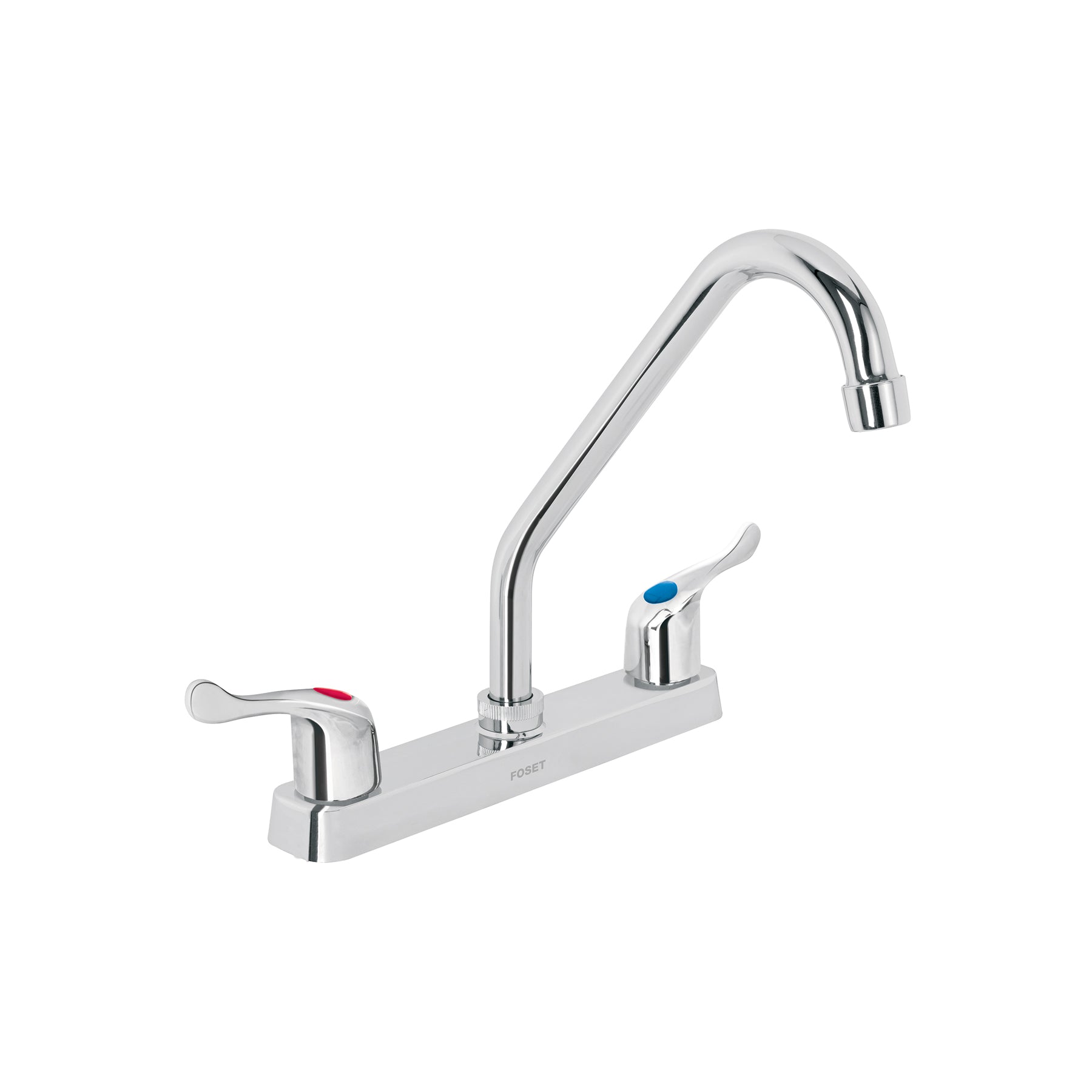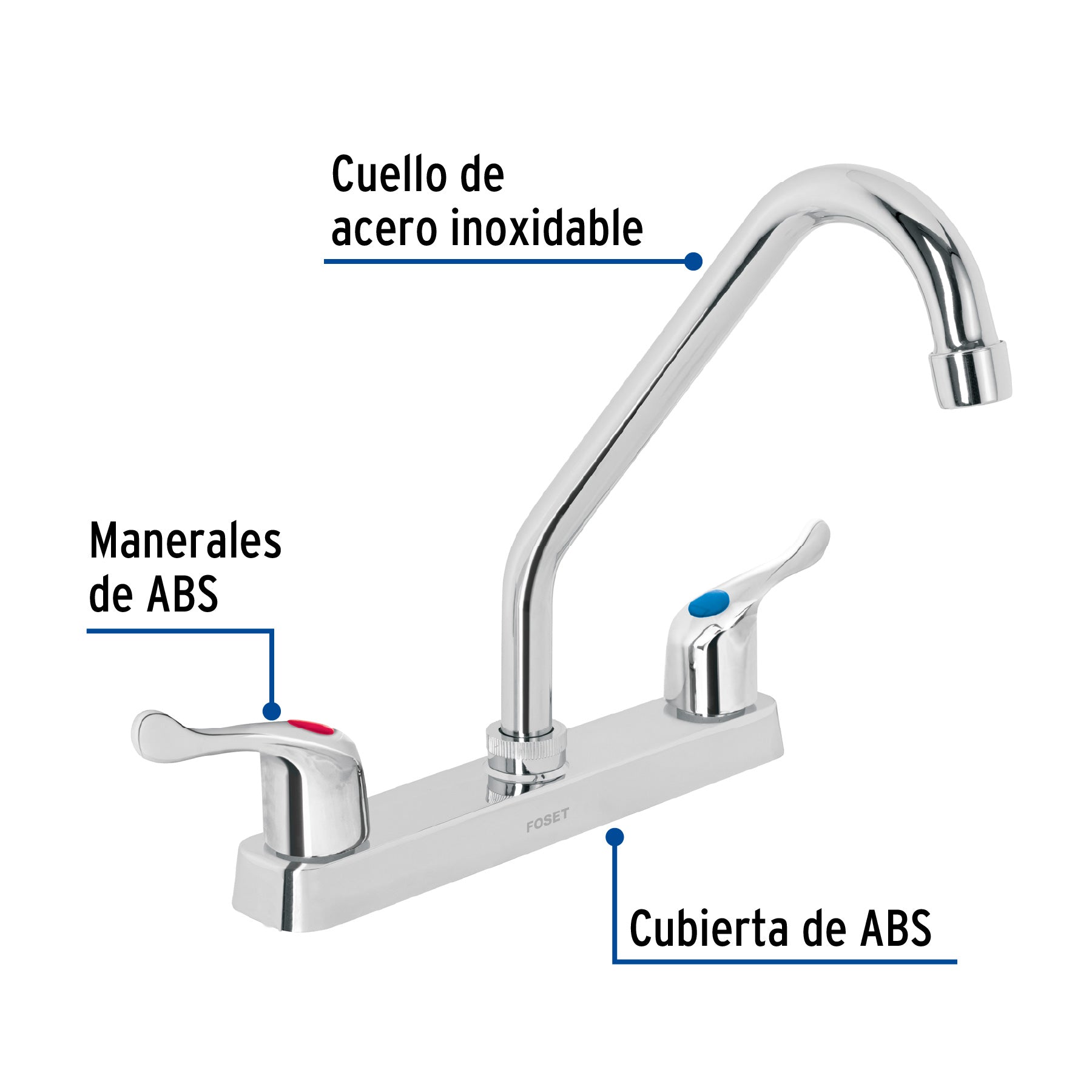 Mezcladora Foset Basic para fregadero con cuerpo termoplástico de alta resistencia y cuello largo de acero inoxidable. Incorpora manerales tipo palanca y cubierta de ABS cromado que no se oxidan, junto con cartucho cerámico de 1/4 de vuelta para una apertura suave. Ideal para instalaciones estándar de 8" en ambientes costeros o húmedos.