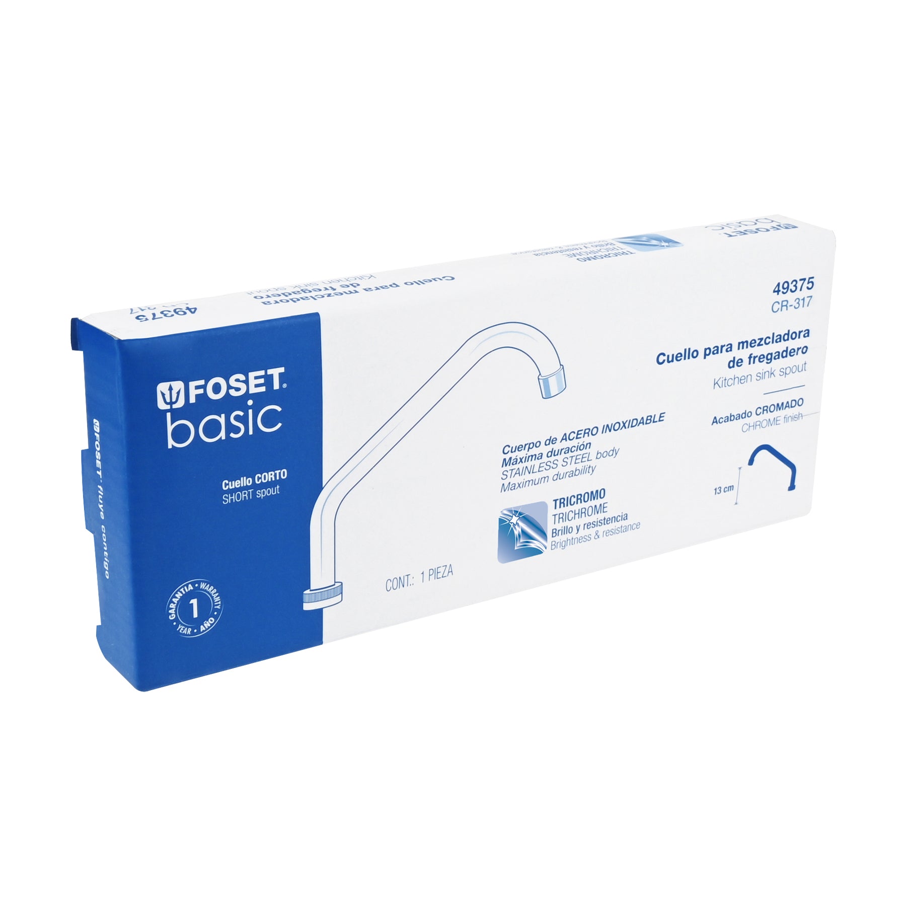 Cuello corto Foset Basic fabricado en acero inoxidable con acabado cromo, ideal para mezcladoras de fregadero. Su diseño compacto garantiza máxima durabilidad y compatibilidad con modelos F-317, F-317C, F-317A, F-312, F-317P, FP-317, F-317I, F-317E y FP-317P de la línea Foset.