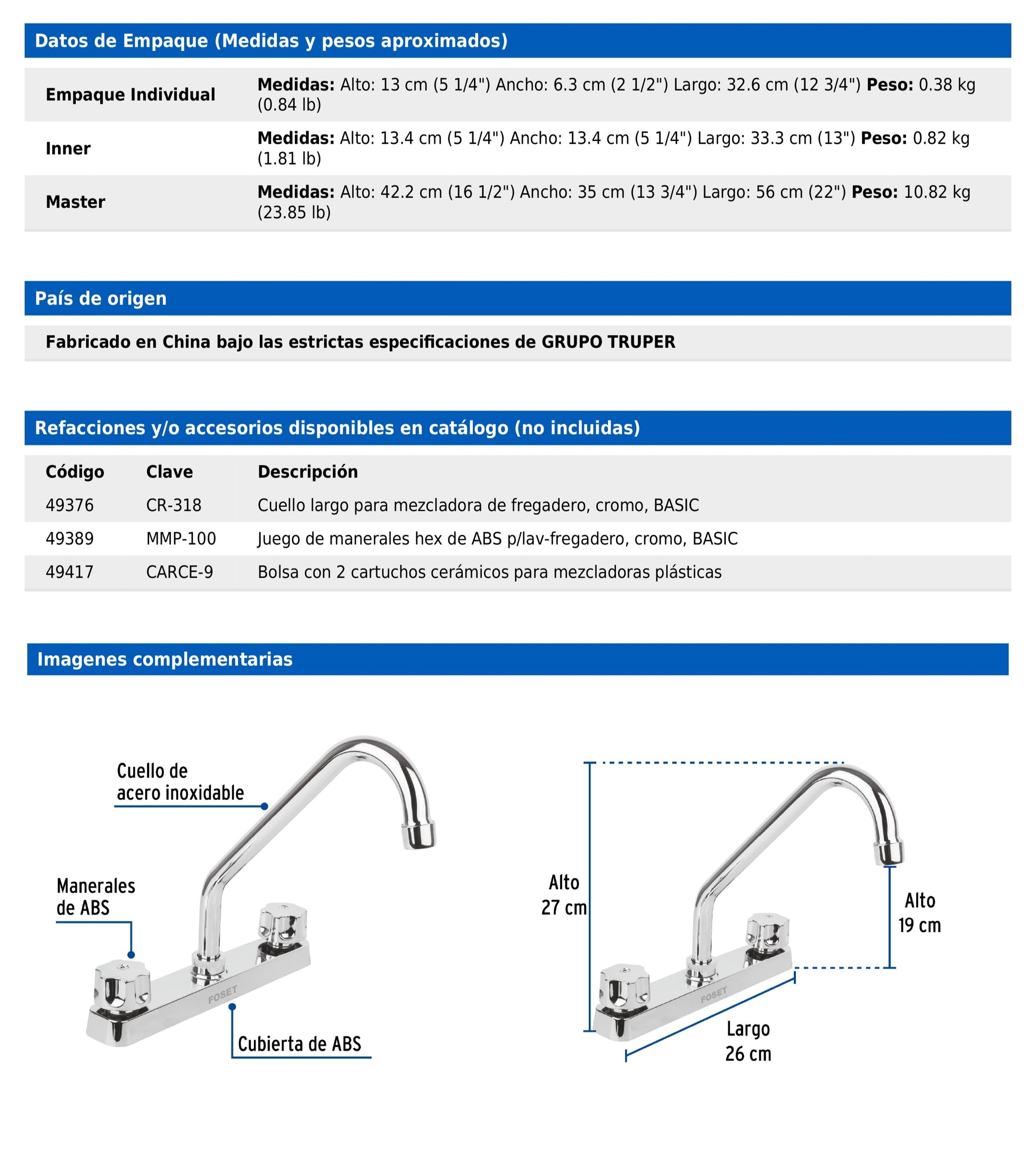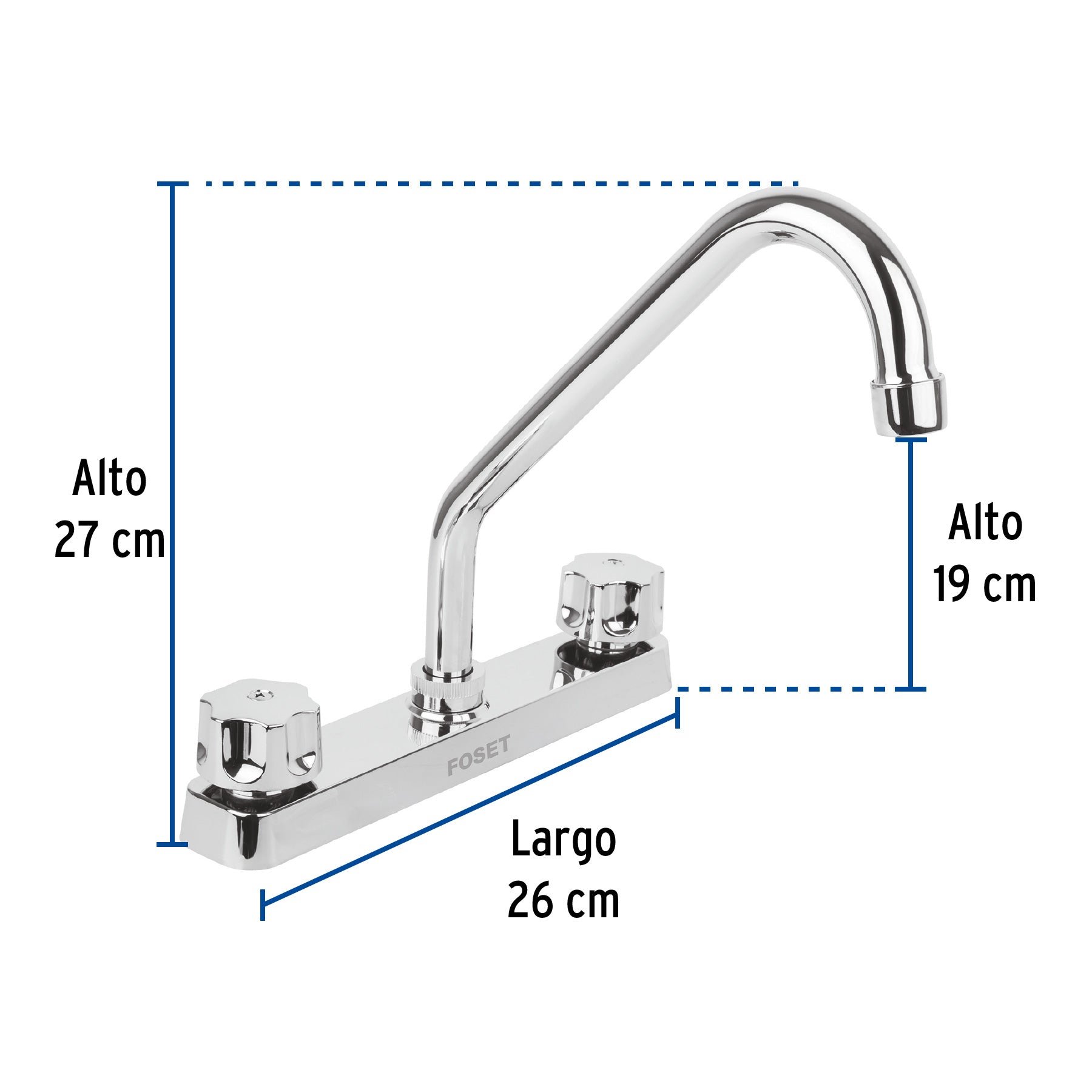 Mezcladora Foset Basic con cuerpo termoplástico de alta resistencia y cuello de acero inoxidable. Diseñada para instalaciones de fregadero con 8" entre taladros. Incorpora manerales y cubierta de ABS cromado que no se oxidan, además de cartucho cerámico de 1/4 de vuelta para apertura suave. Ideal para zonas costeras o ambientes de alta humedad.