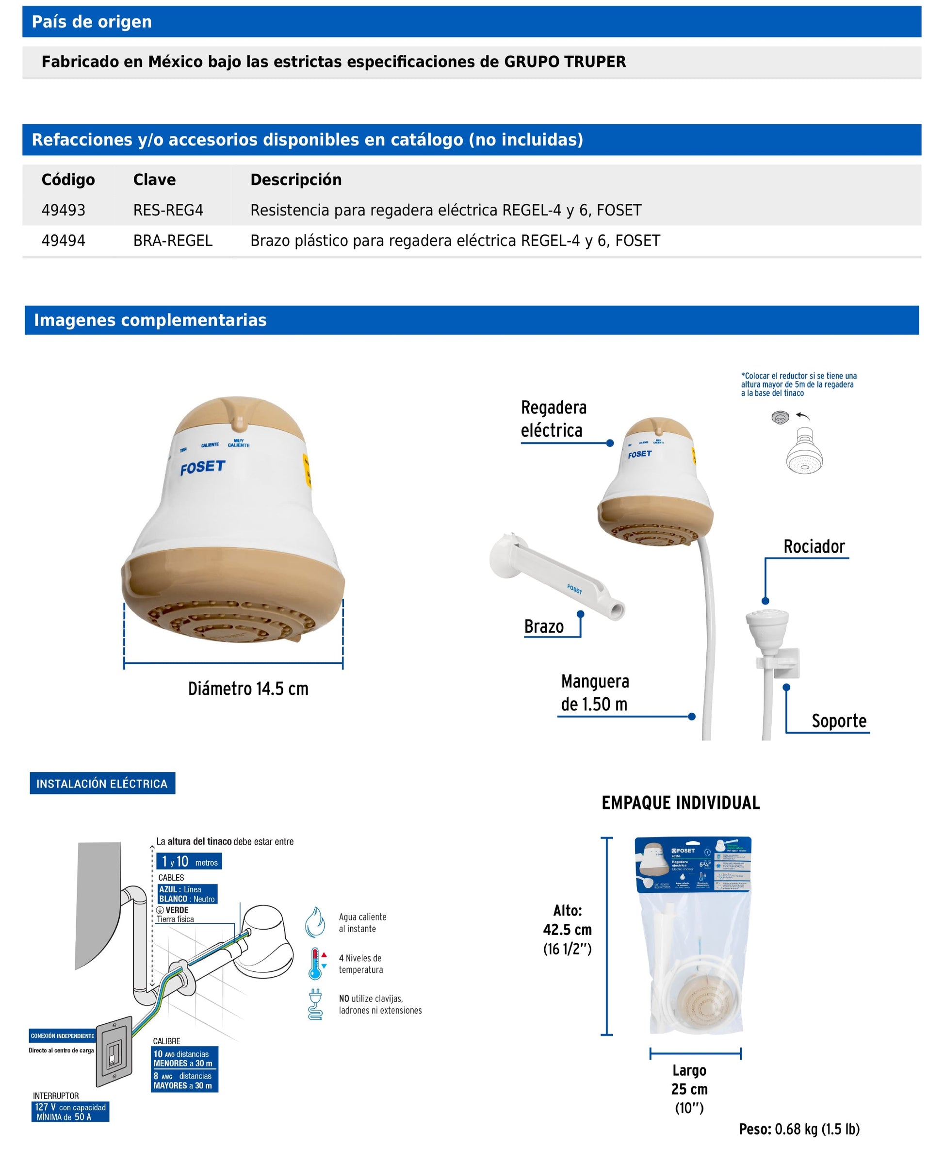 Regadera eléctrica Foset color beige con cuerpo de polipropileno, brazo de montaje y manguera de PVC de 1.5 m con rociador. Ofrece 4 niveles de temperatura y opera eficientemente desde 0.25 kgf/cm².