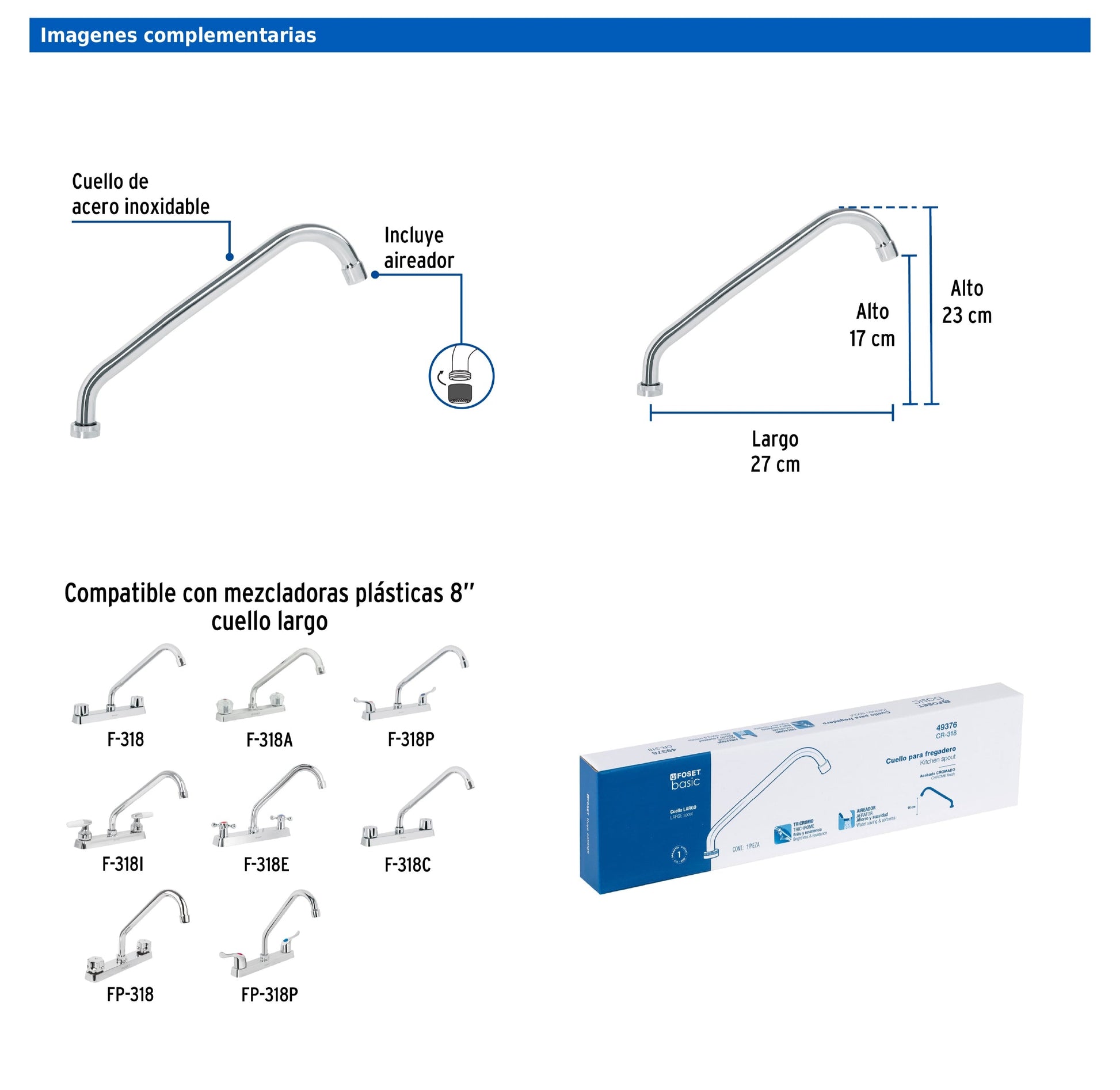 Cuello largo Foset Basic fabricado en acero inoxidable con acabado cromo, diseñado para brindar máxima duración. Compatible con diversos modelos de mezcladoras para fregadero como F-318, F-318A, F-318P, F318I, F318E, F318C, FP-318 y FP-318P. Su diseño funcional facilita el reemplazo o instalación en sistemas domésticos.