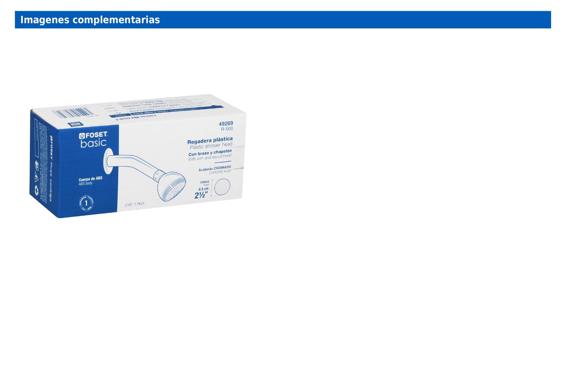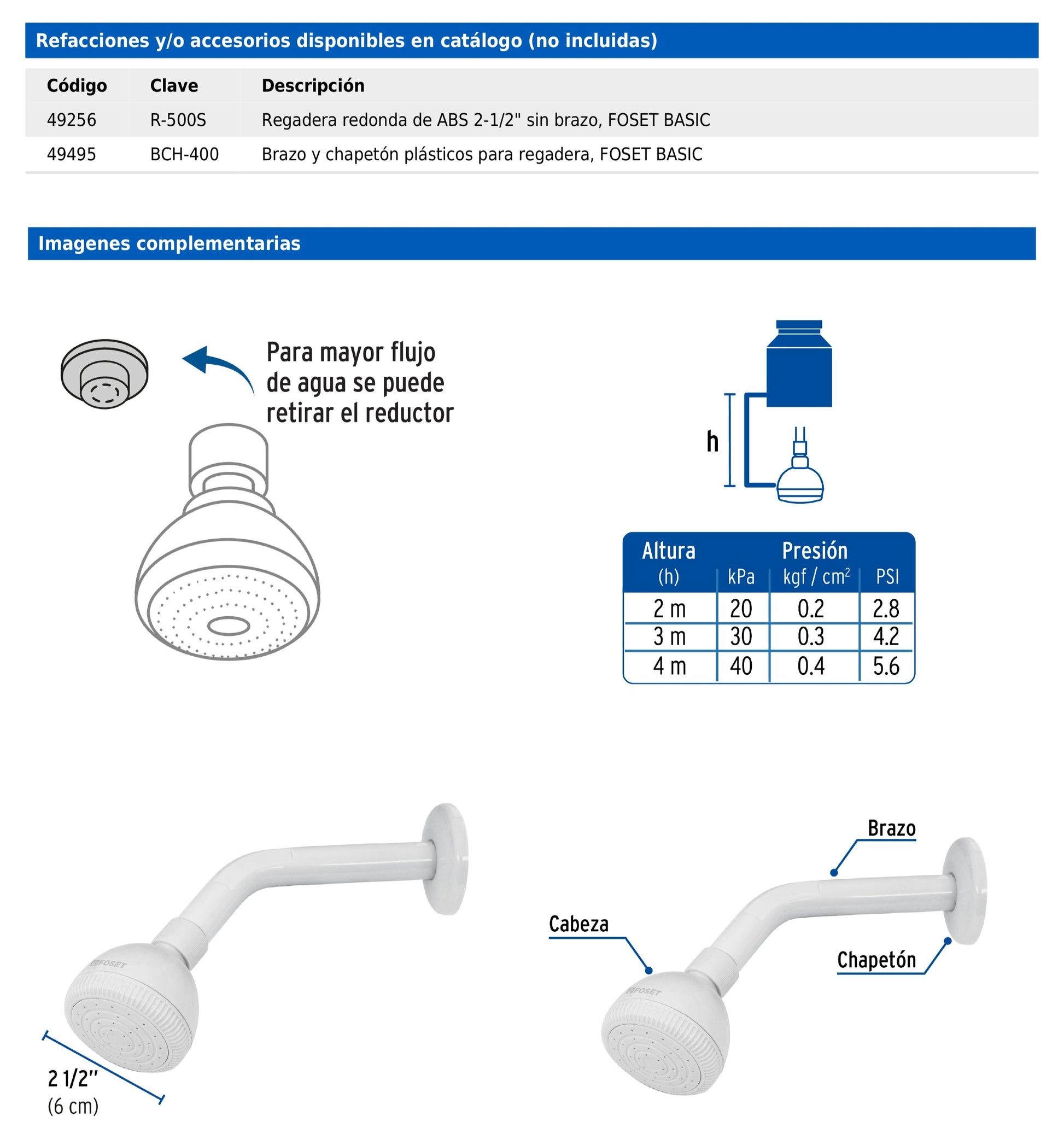 Regadera Foset Basic con cabeza de ABS, brazo y chapetón de plástico. Su sistema articulado y el reductor removible permiten un flujo ajustable, ideal para uso doméstico.