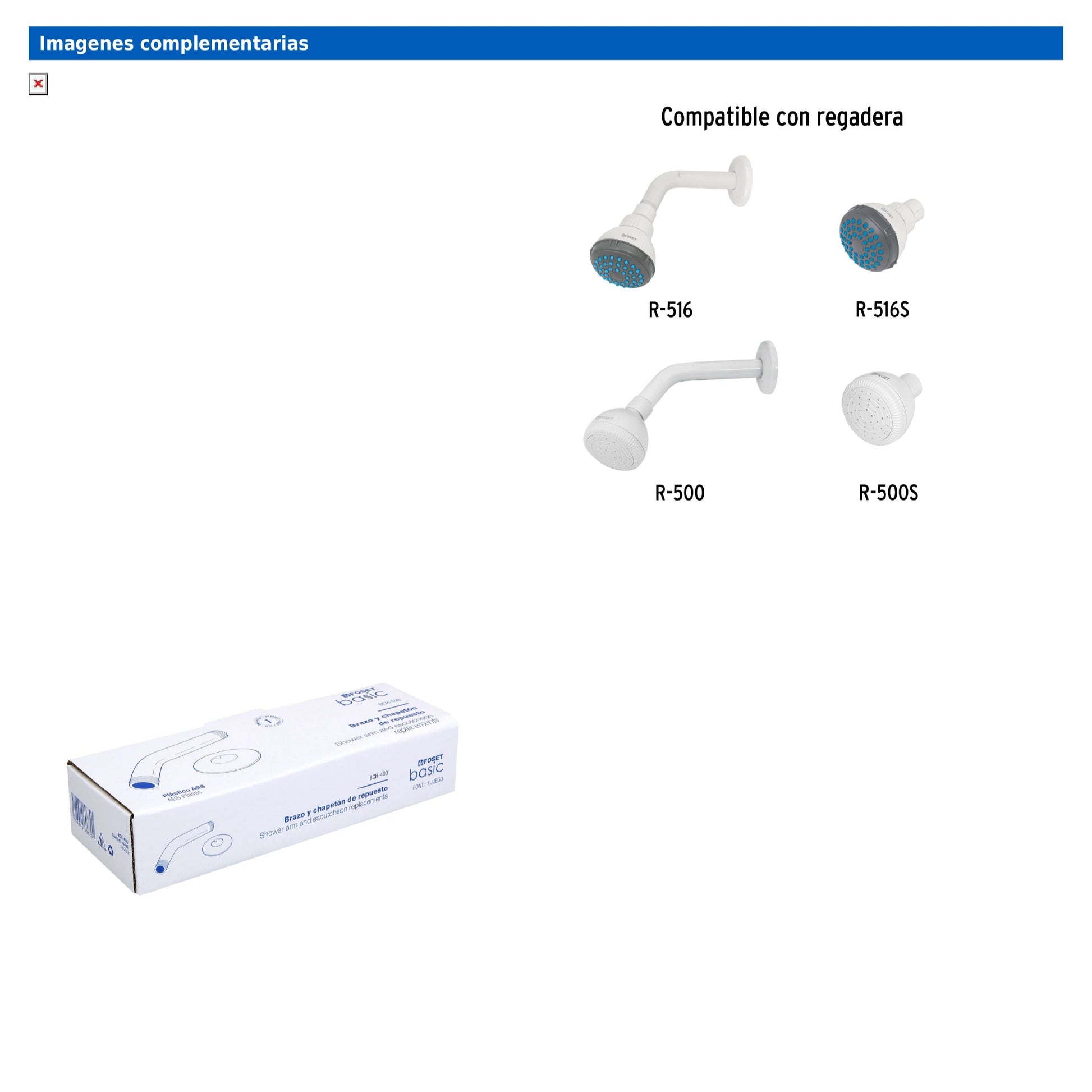 Brazo Foset Basic con chapetón de plástico ABS, diseñado para montaje en pared. Compatible con regaderas R-516, R-516S, R-500 y R-500S de la línea Foset Basic®.