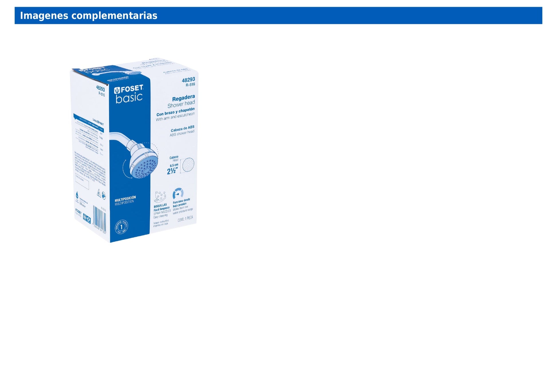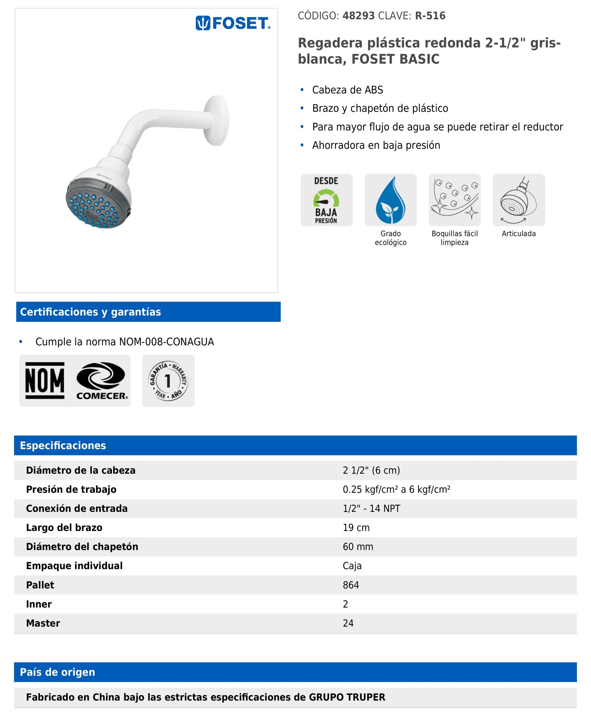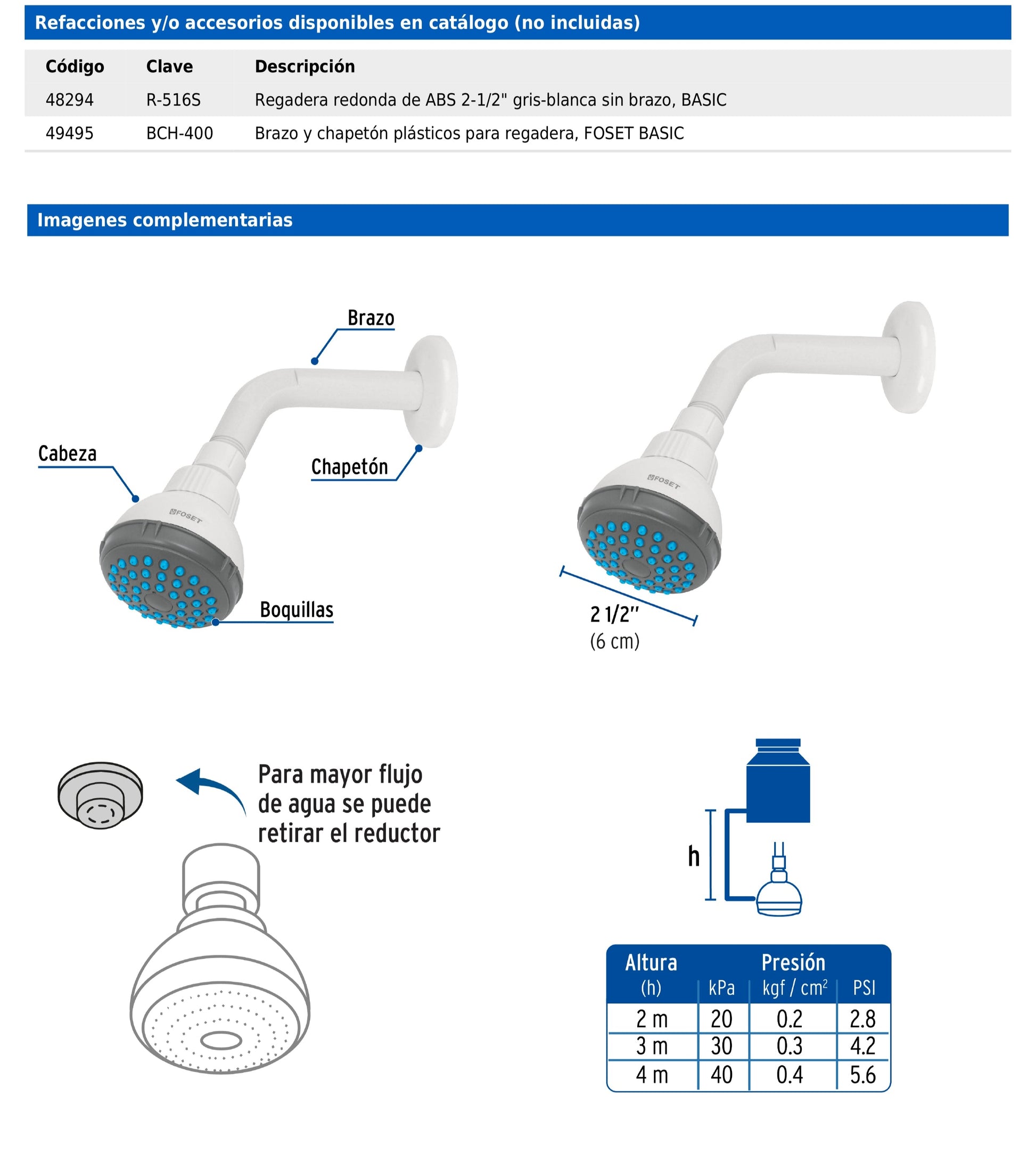 Regadera Foset Basic con cabeza de ABS, brazo y chapetón de plástico, diseñada para operar eficientemente en baja presión. Incorpora sistema articulado, boquillas de fácil limpieza y permite retirar el reductor para aumentar el flujo. Ideal para uso doméstico con instalación sencilla.