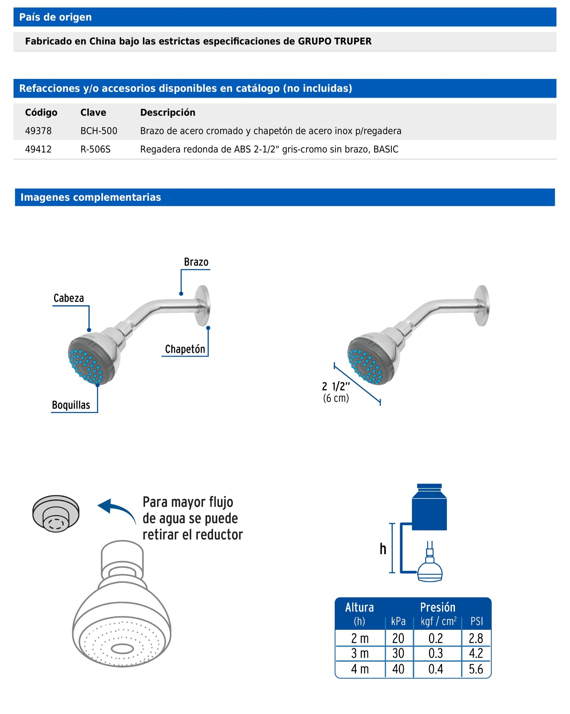 Regadera redonda de 2-1/2" con brazo y chapetón de acero