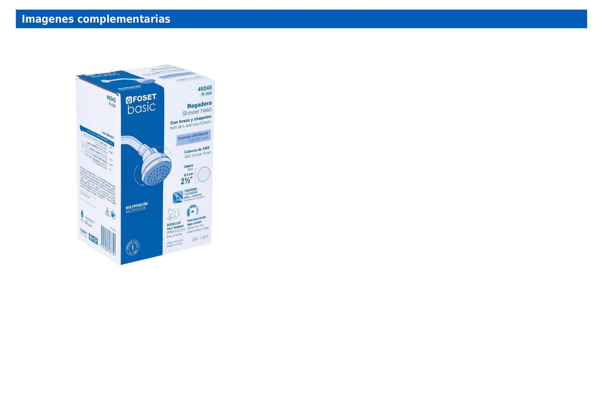Regadera Foset Basic con cabeza de ABS cromado, brazo de acero y chapetón de acero inoxidable. Su diseño articulado incluye boquillas de fácil limpieza y un reductor removible para aumentar el flujo de agua.