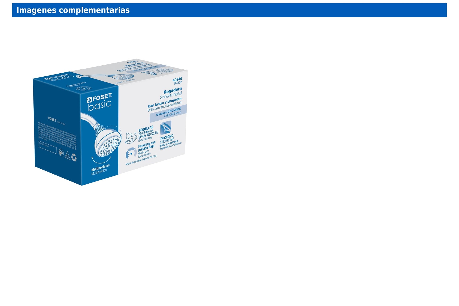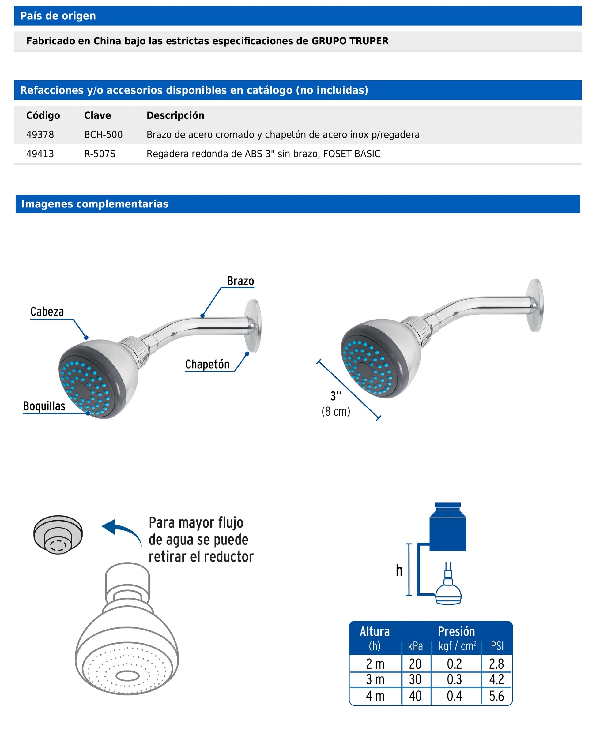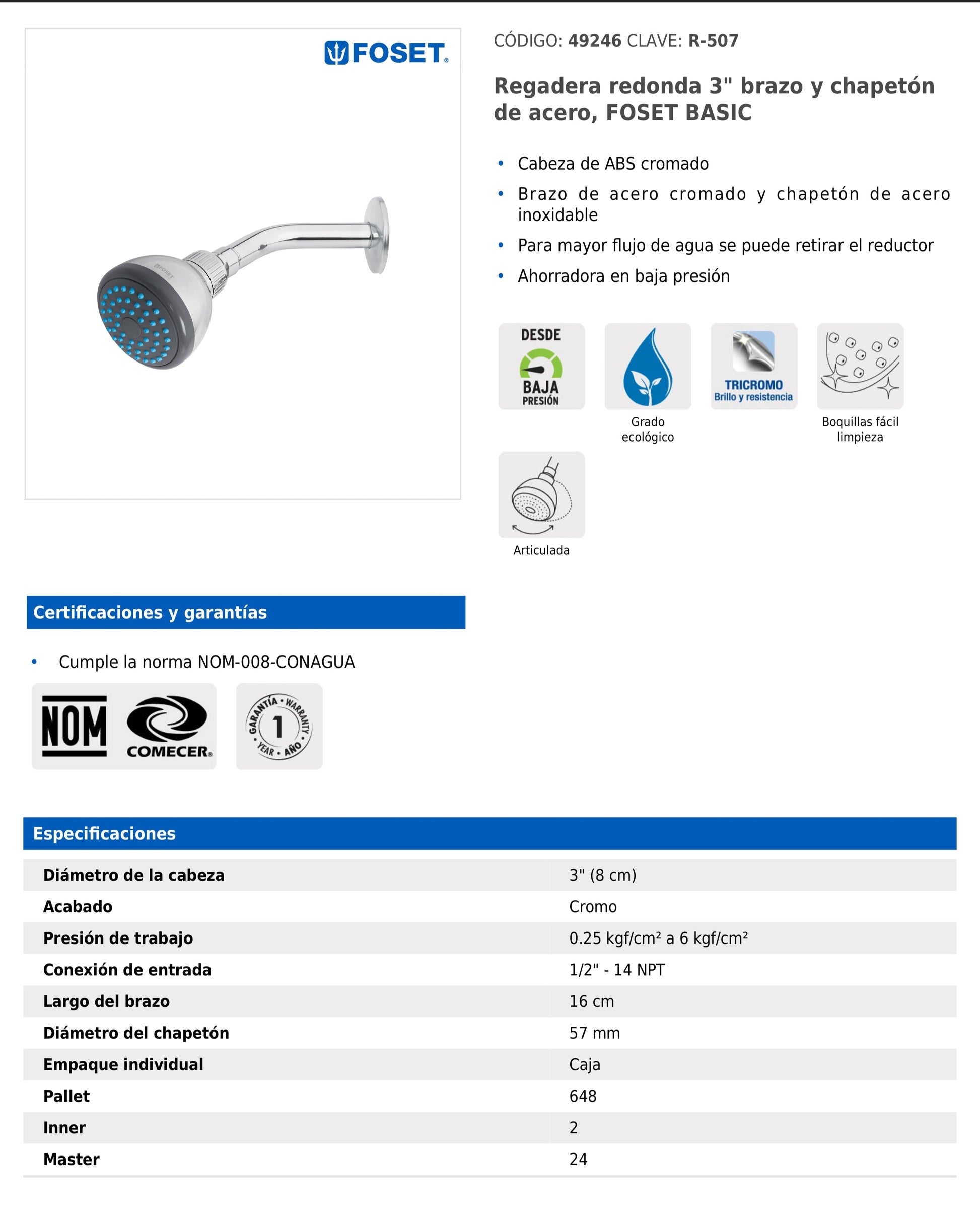 Regadera Foset Basic con cabeza de ABS cromado, brazo de acero y chapetón de acero inoxidable. Funciona eficientemente en baja presión y permite retirar el reductor para incrementar el flujo.