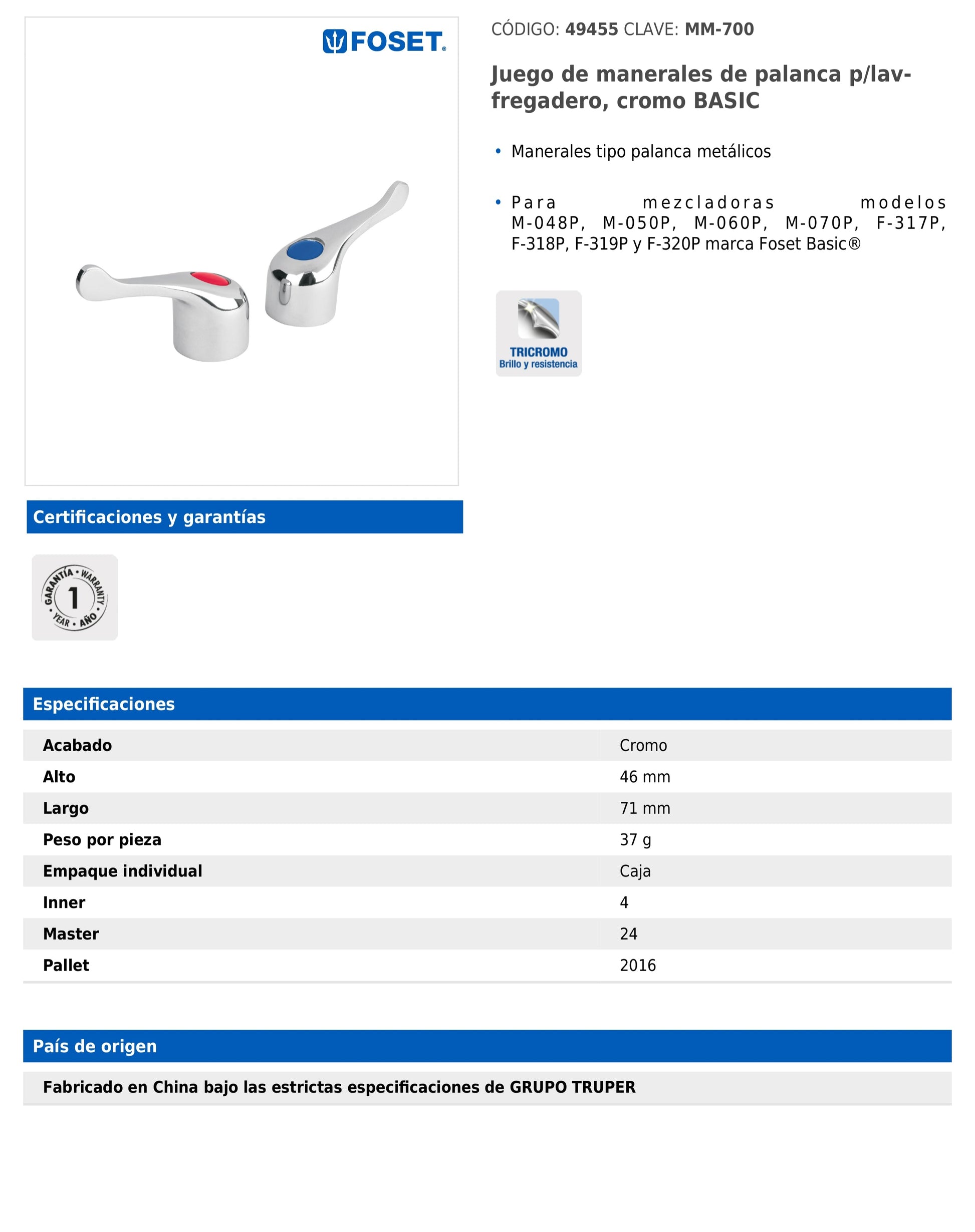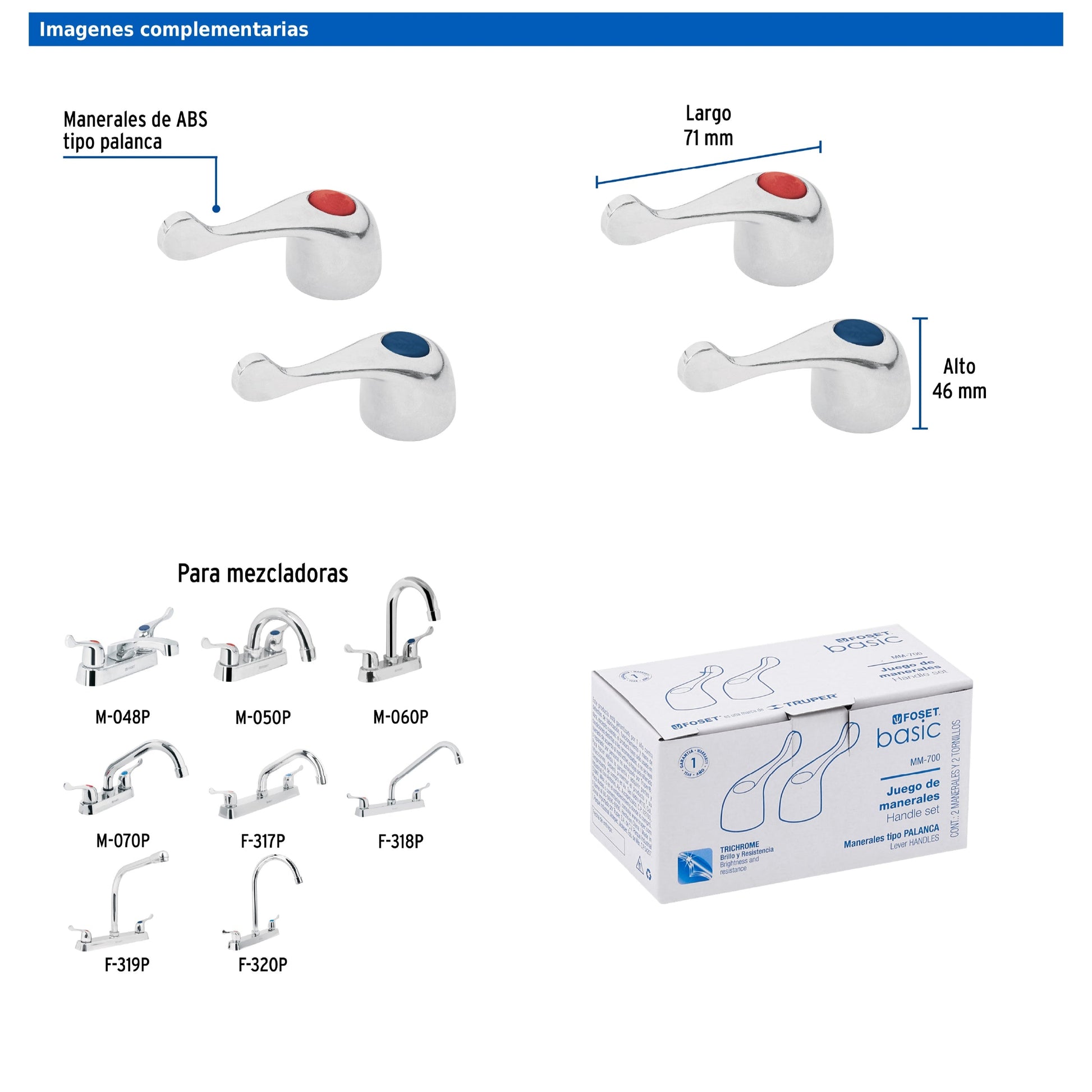 Juego de manerales Foset Basic tipo palanca fabricados en metal con acabado cromo. Diseñados como repuesto para mezcladoras modelo M-048P, M-050P, M-060P, M-070P, F-317P, F-318P, F-319P y F-320P.