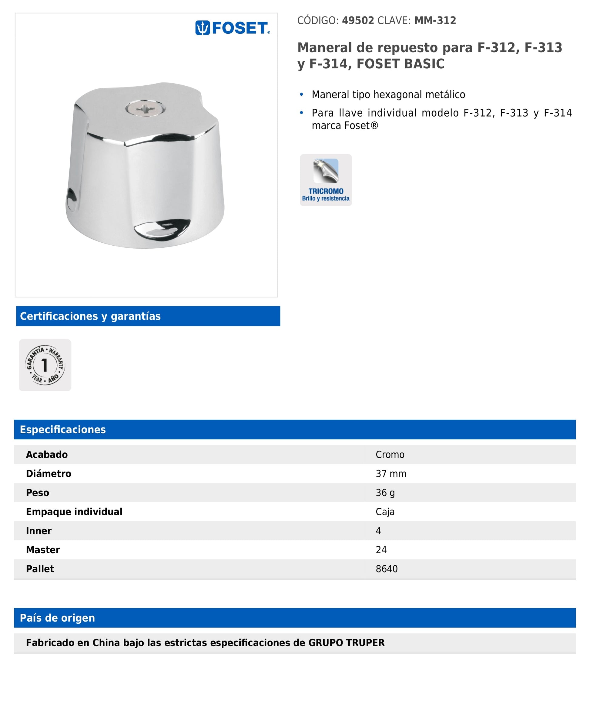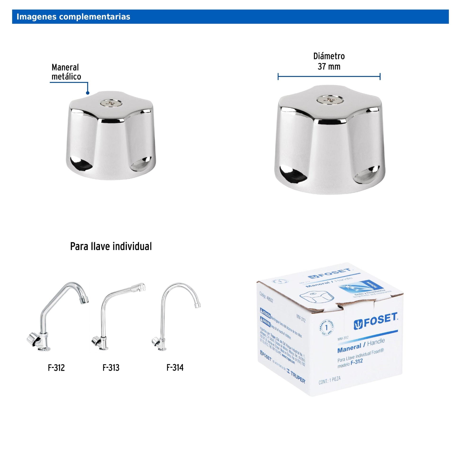 Maneral Foset Basic tipo hexagonal metálico, diseñado como repuesto para las llaves individuales F-312, F-313 y F-314. Fabricado en metal con acabado cromo para mayor durabilidad, es ideal para restaurar funcionalidad y mantener la estética original de las instalaciones. Acabado cromado resistente a la corrosión.