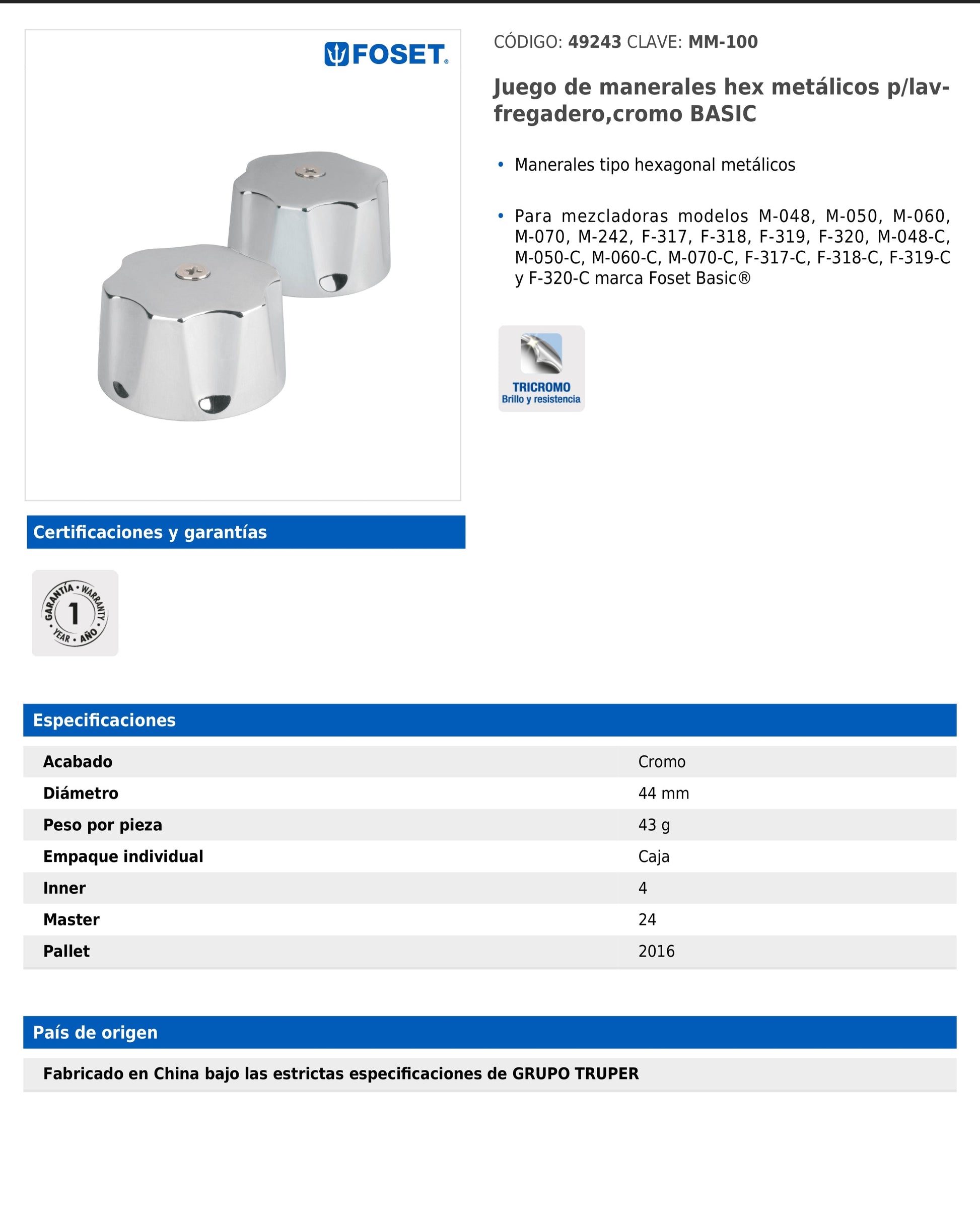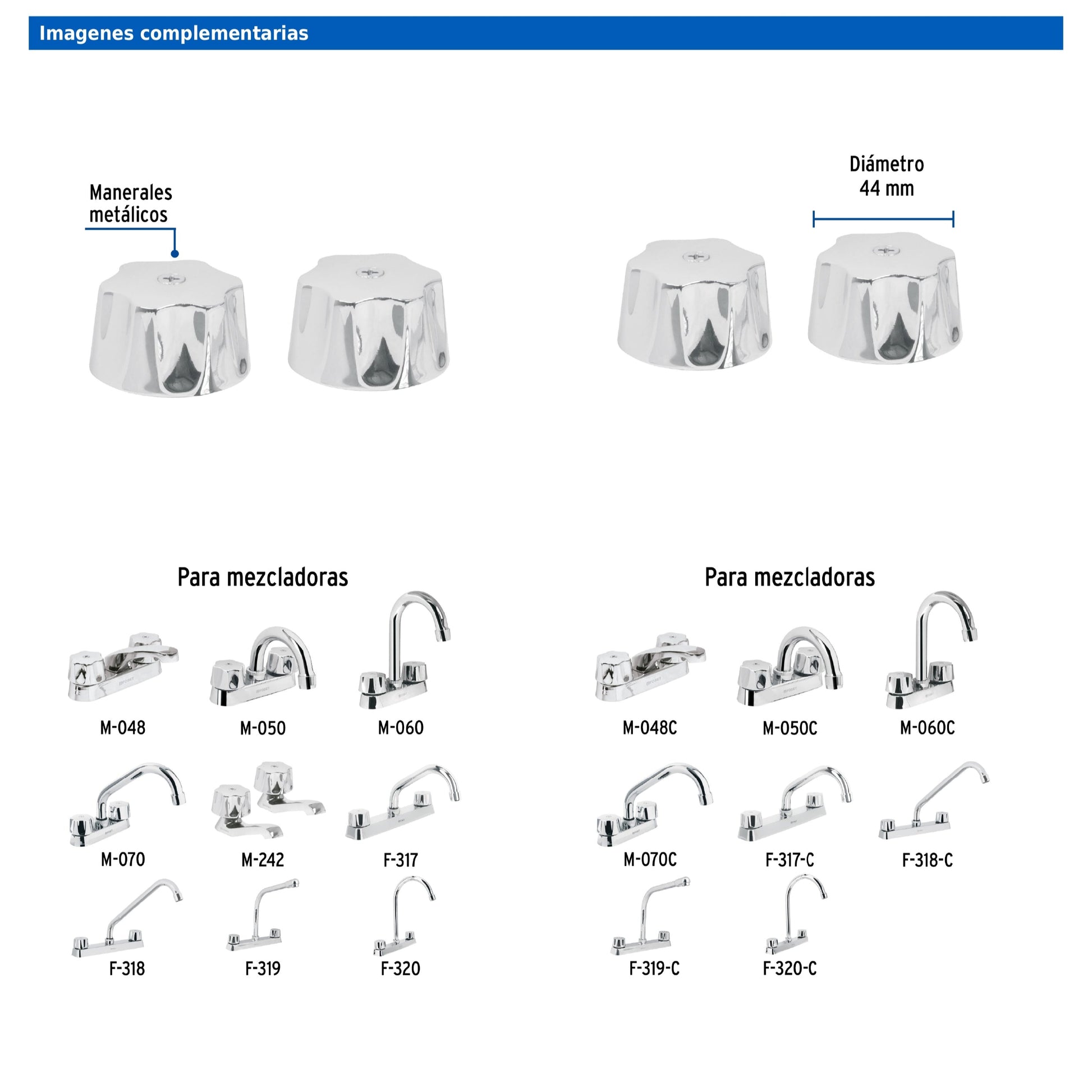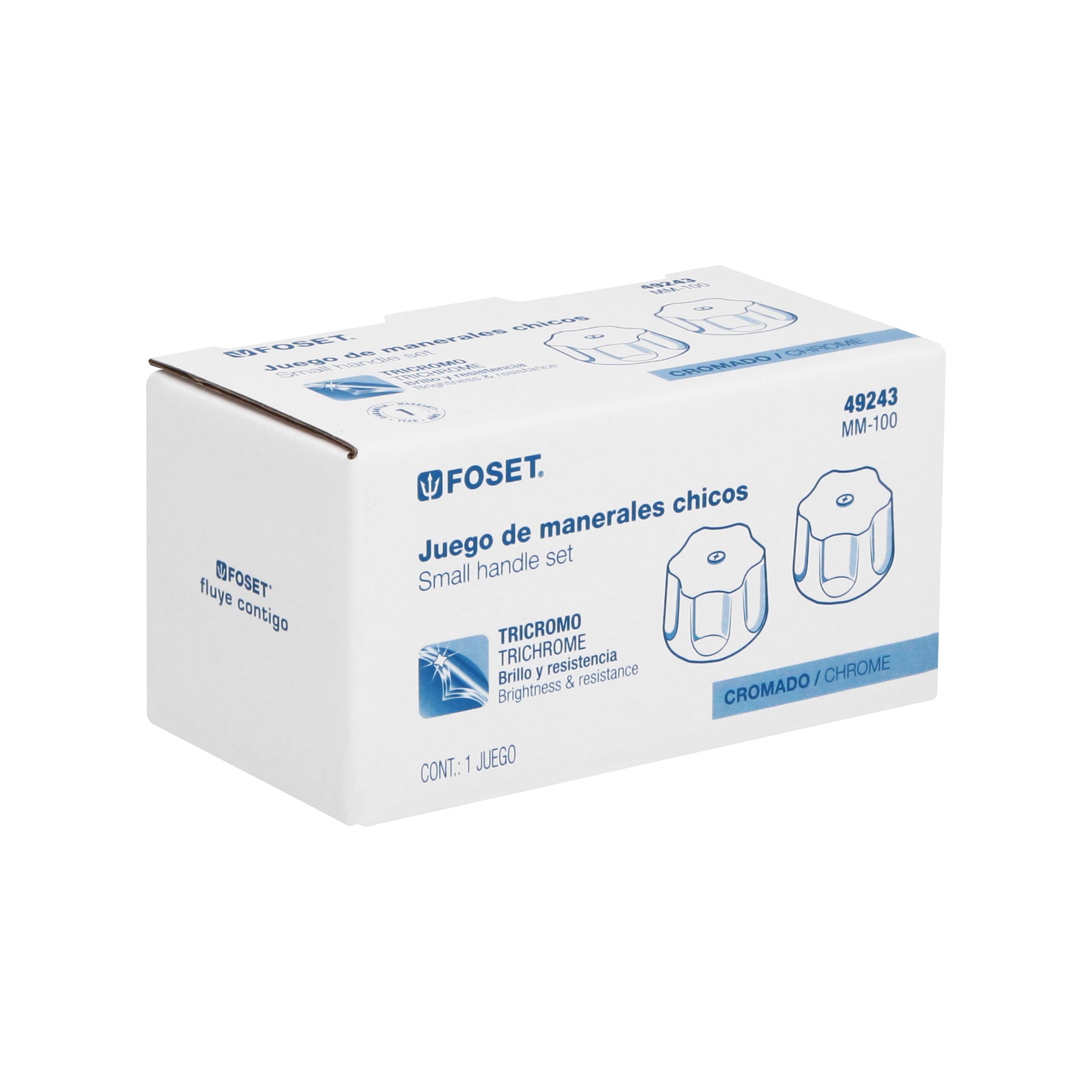 Juego de manerales Foset Basic tipo hexagonal, fabricados en metal con acabado cromo. Compatibles con múltiples modelos de mezcladoras para lavabo y fregadero, tanto estándar como compactos, como M-048, F-318, F-319 y sus variantes “-C”.
