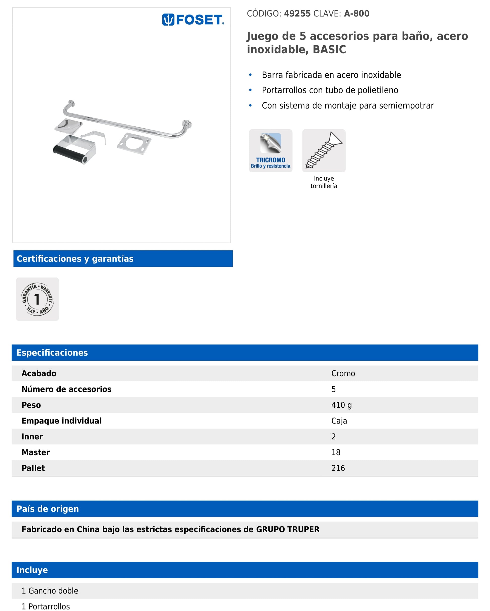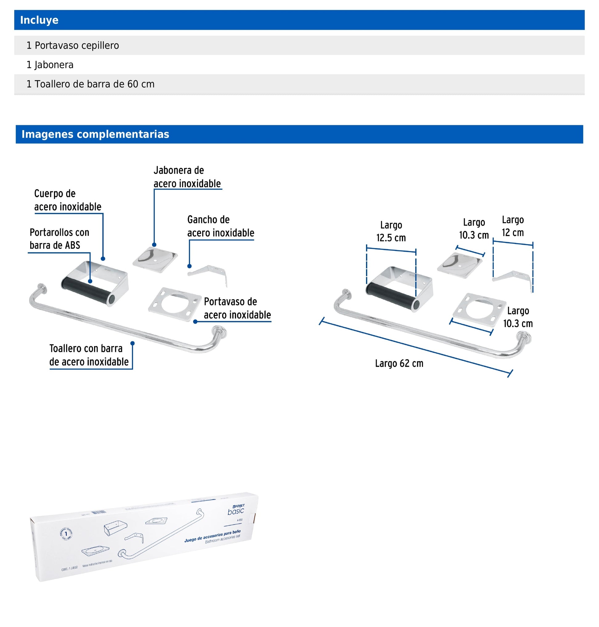 Este set completo de accesorios para baño está fabricado con materiales resistentes y de fácil instalación. Incluye barra toallero, portarrollos, portavaso cepillero, jabonera y gancho doble. La barra es de acero inoxidable y el portarrollos incorpora tubo de polietileno. Todo el sistema está diseñado para montaje semiempotrado y se suministra con tornillería.