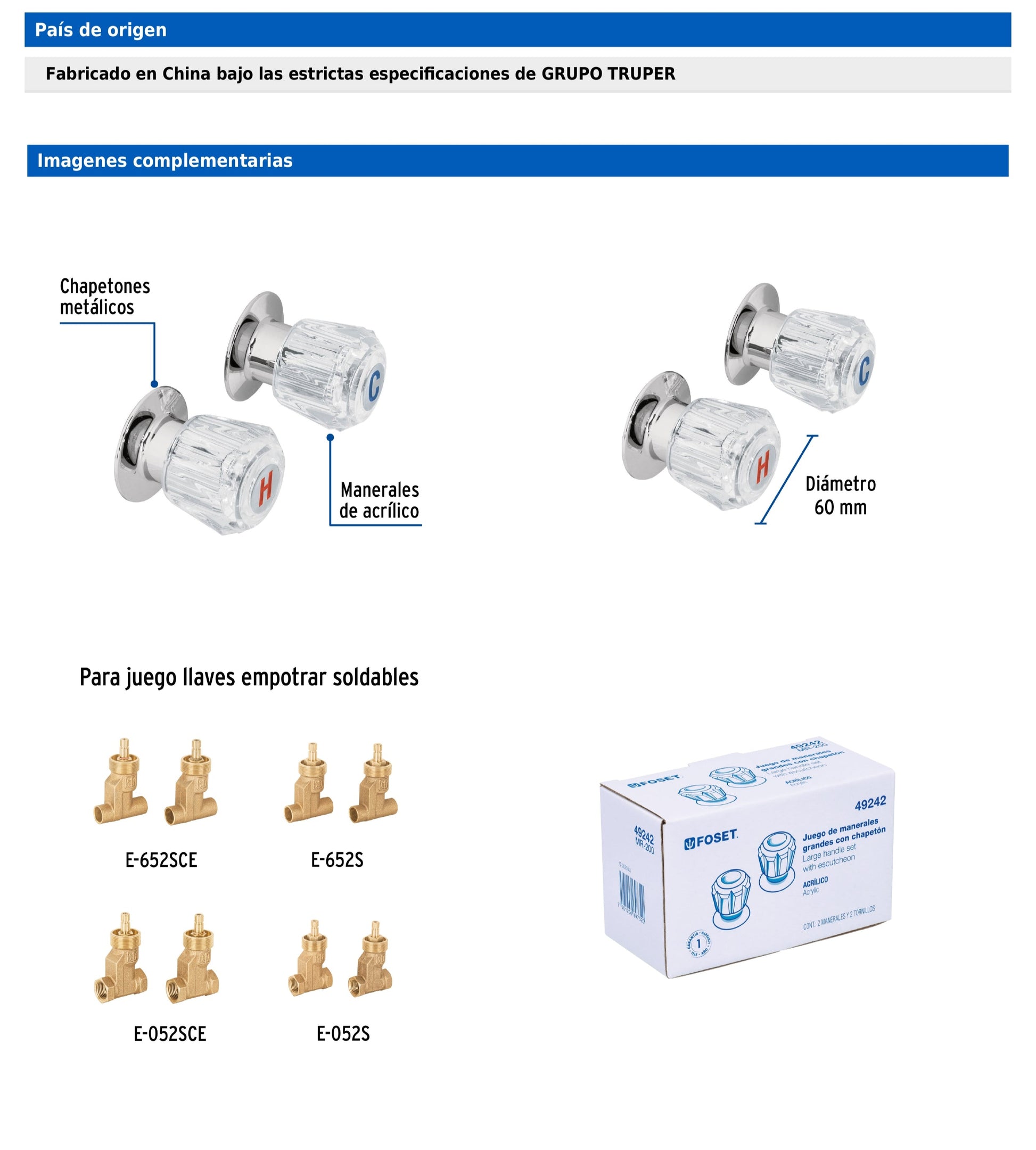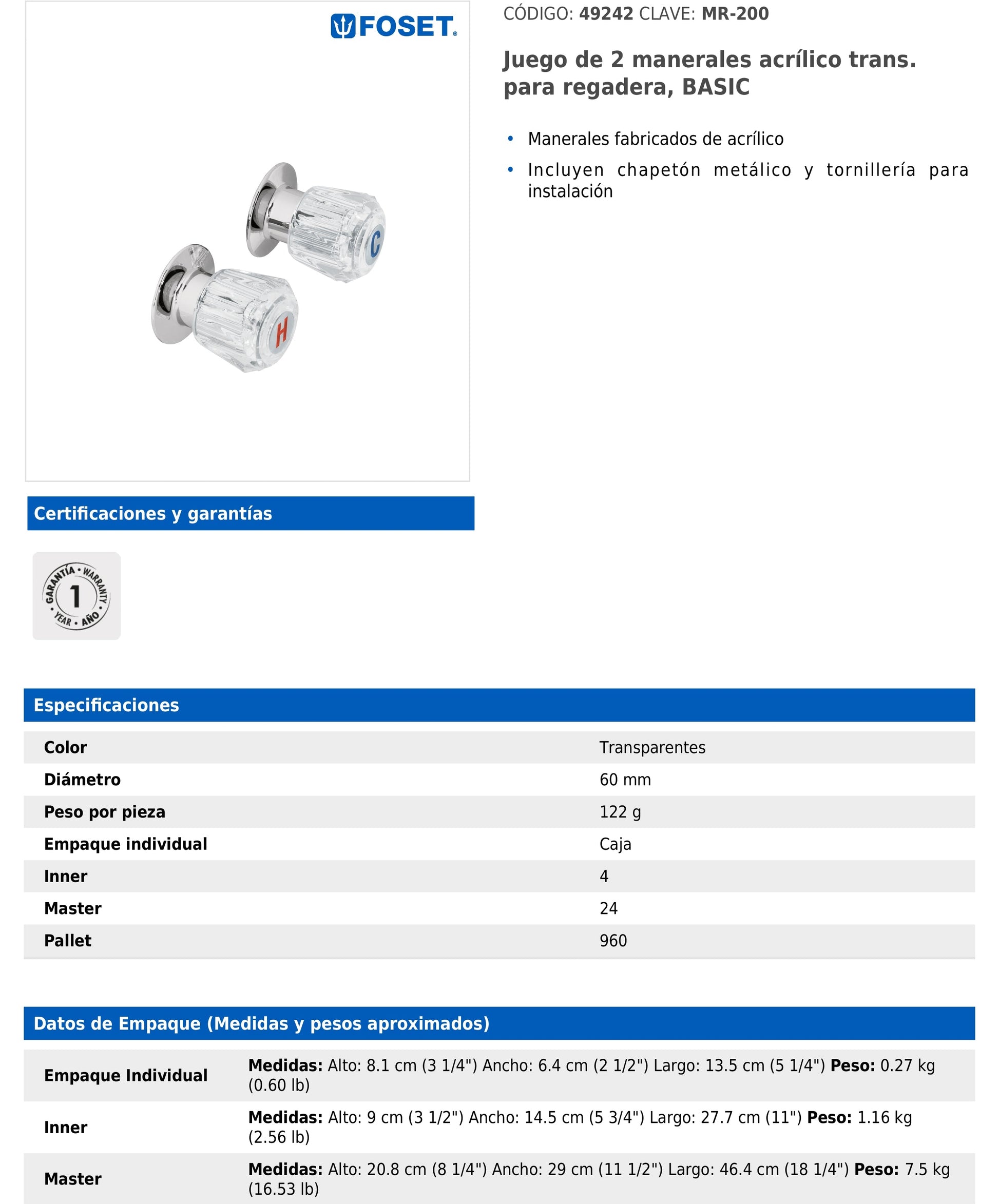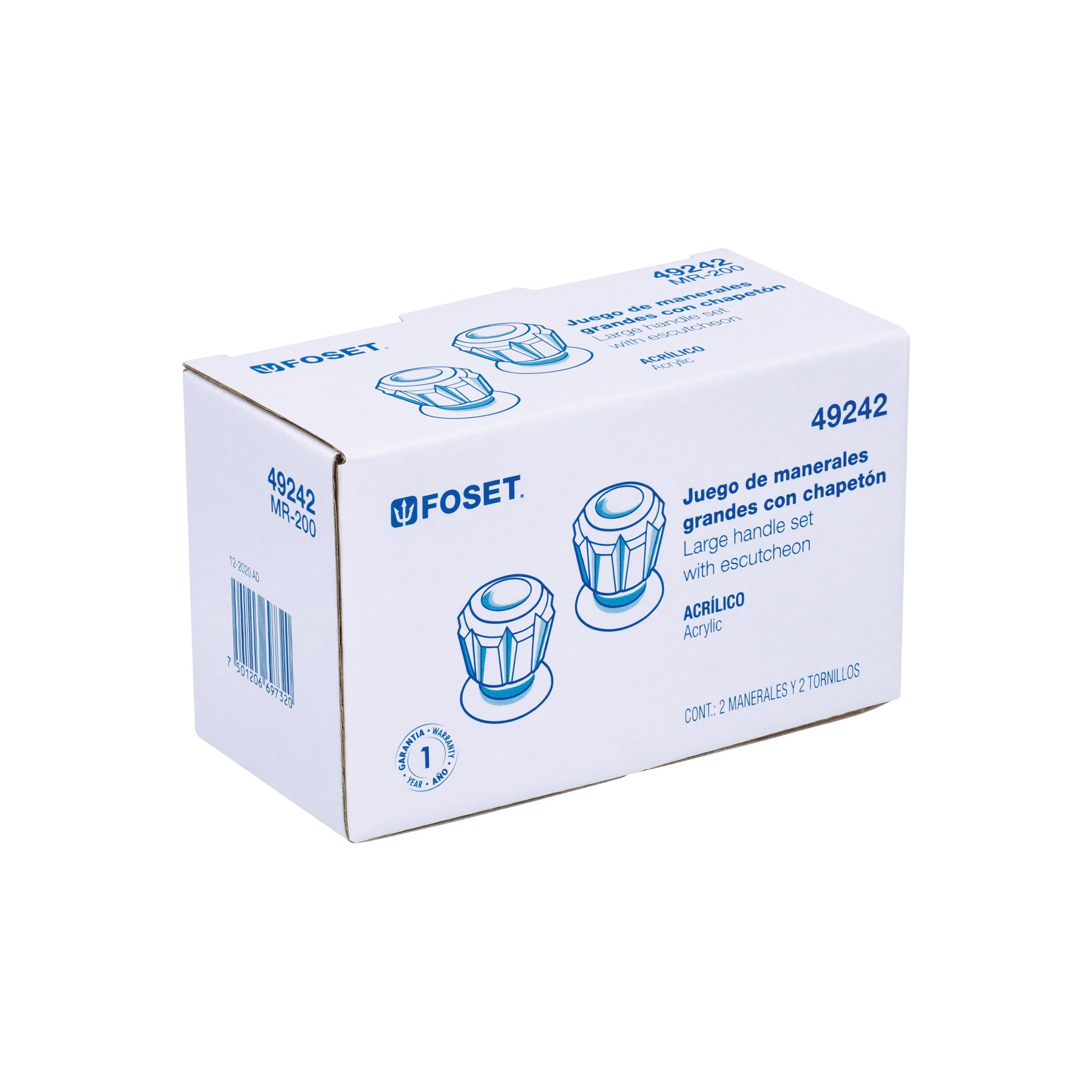 Este set de manerales para regadera está fabricado en acrílico transparente e incluye chapetones metálicos y tornillos para su instalación. Es una solución funcional y estética para reemplazo en llaves empotrables, compatible con productos de la línea BASIC. Su diseño liviano y resistente facilita su manipulación y montaje.