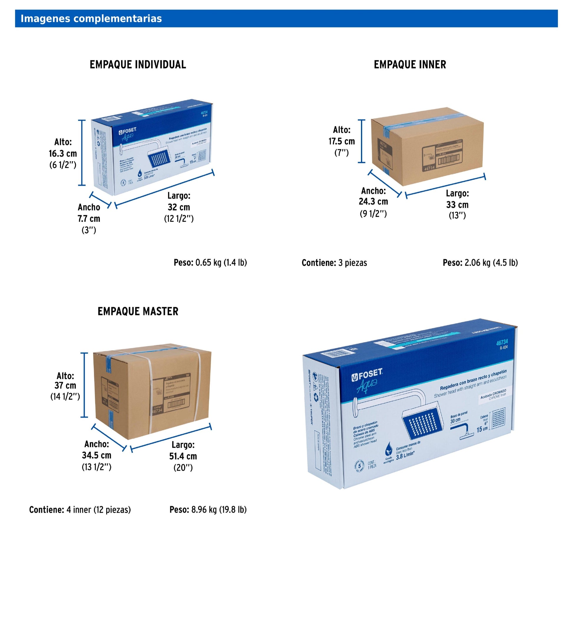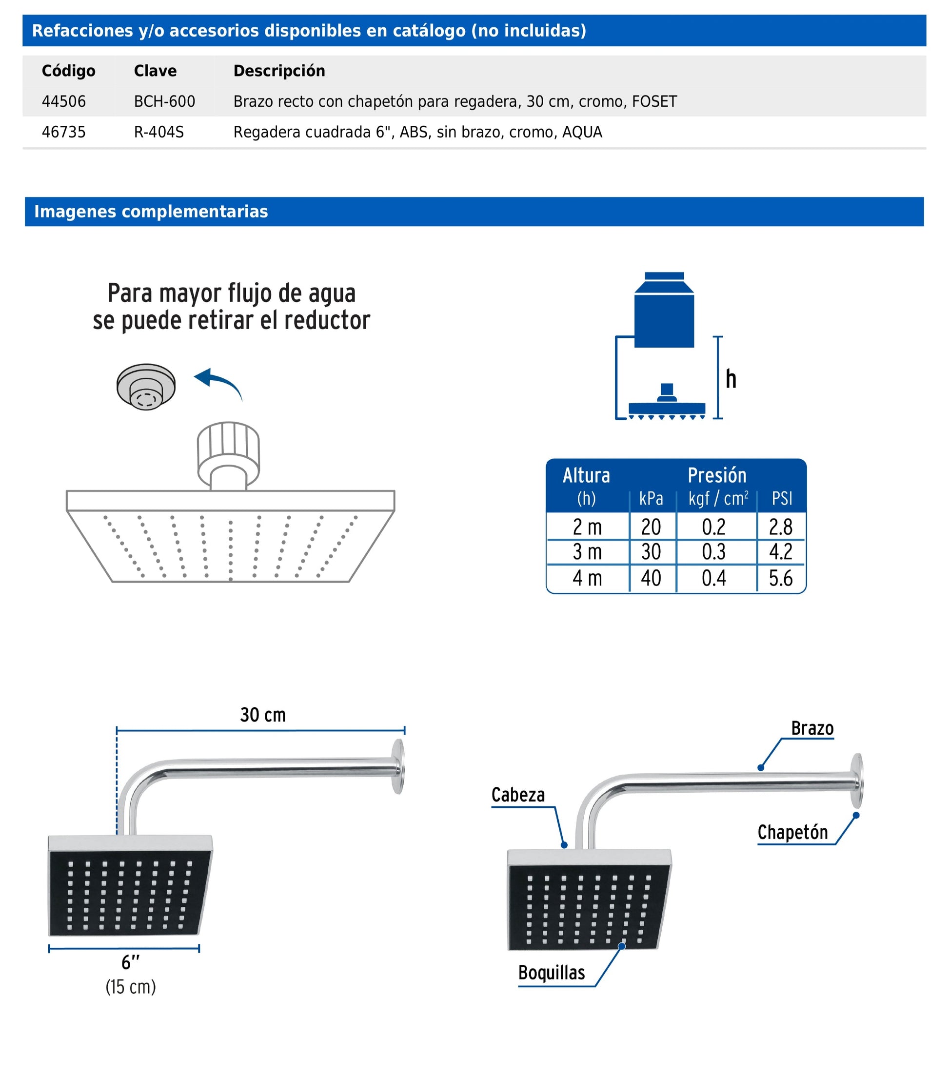 Con un diseño moderno y eficiente, esta regadera cuadrada de 6" está fabricada en ABS cromado, con brazo de acero inoxidable de 30 cm y chapetón a juego.