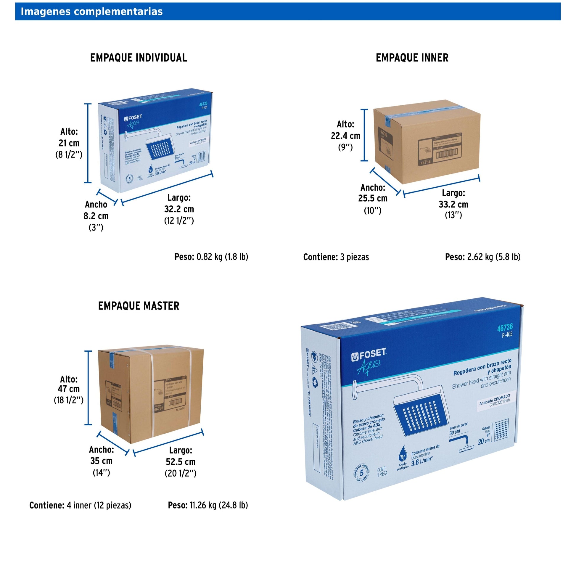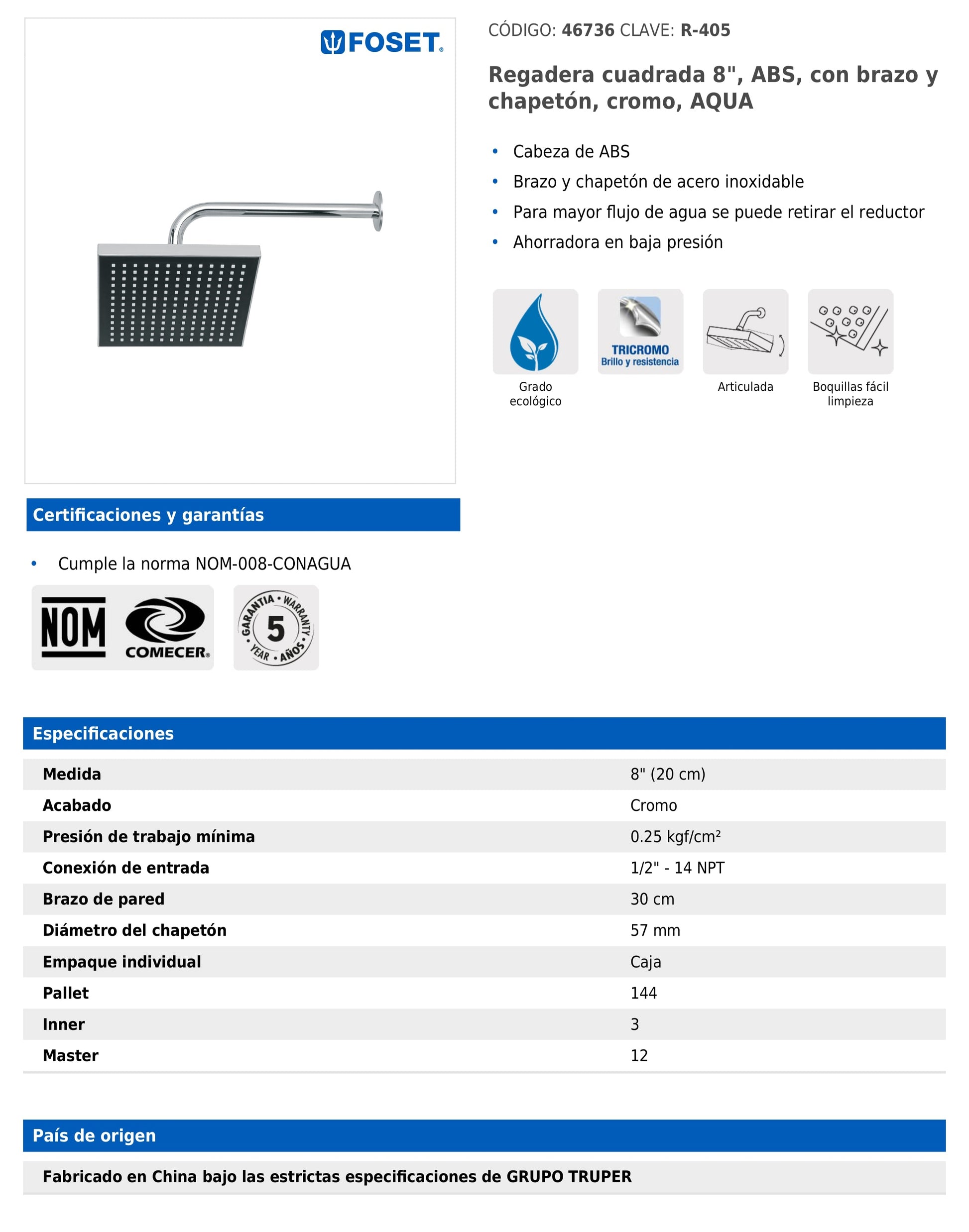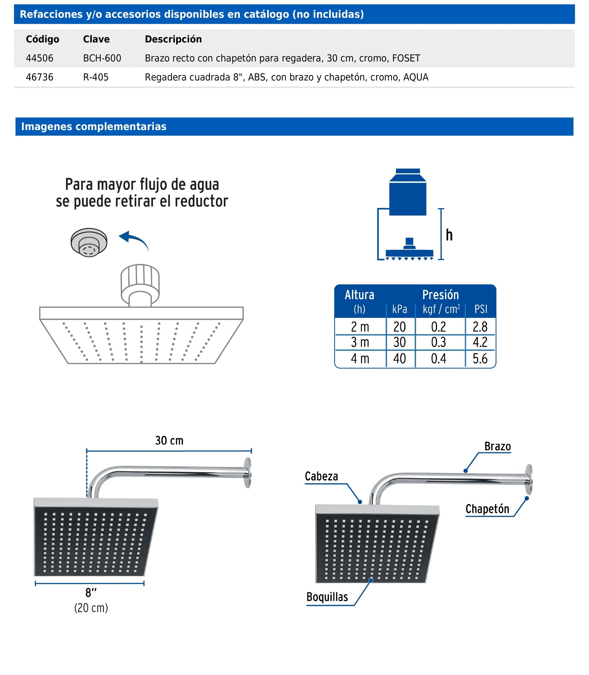 Diseñada para una experiencia amplia y eficiente de baño, esta regadera cuadrada de 8" está fabricada en ABS cromado con brazo de 30 cm y chapetón de acero inoxidable. Gracias a su diseño articulado y boquillas de fácil limpieza, garantiza practicidad y durabilidad.