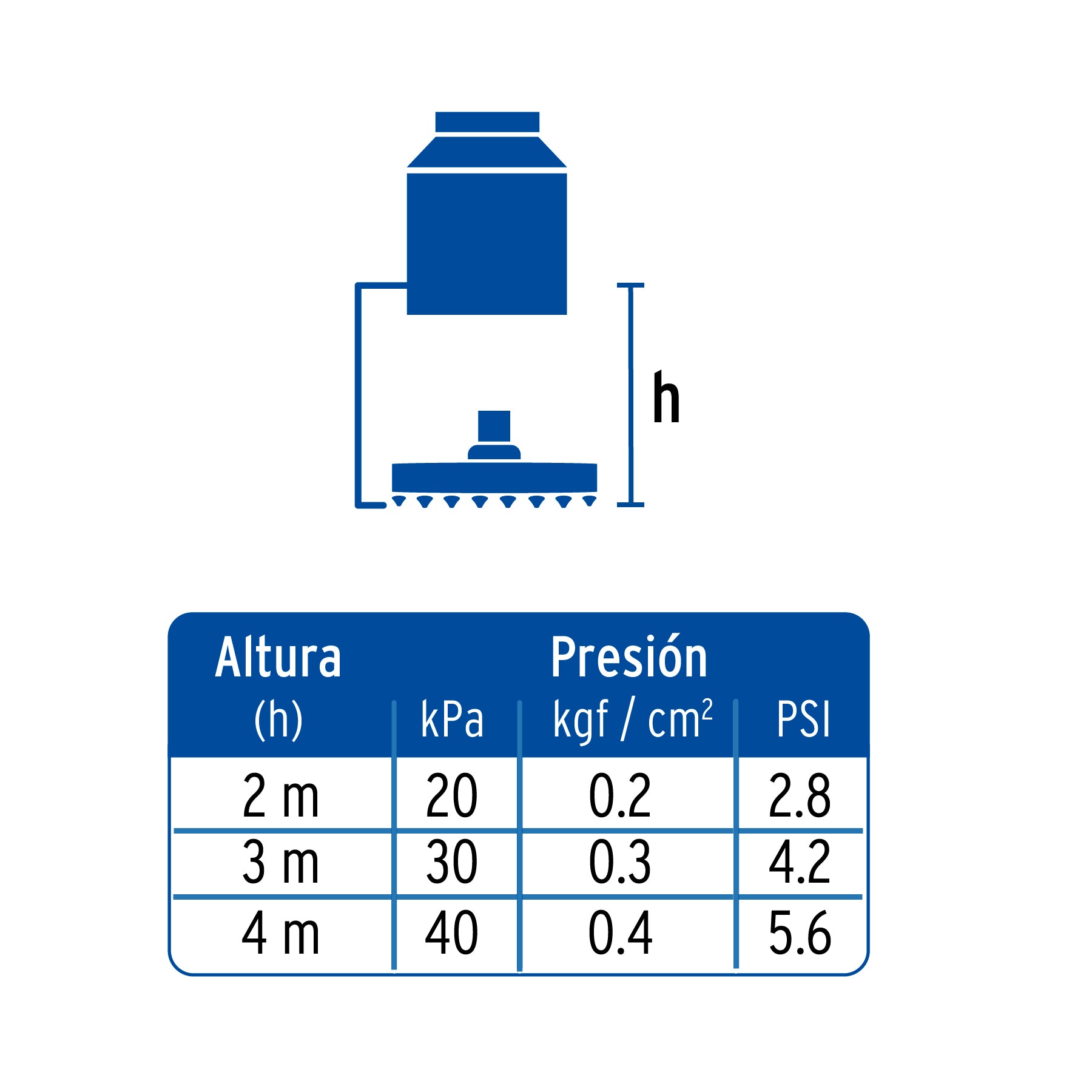 - Presión de trabajo mínima 0.25 kgf/cm².