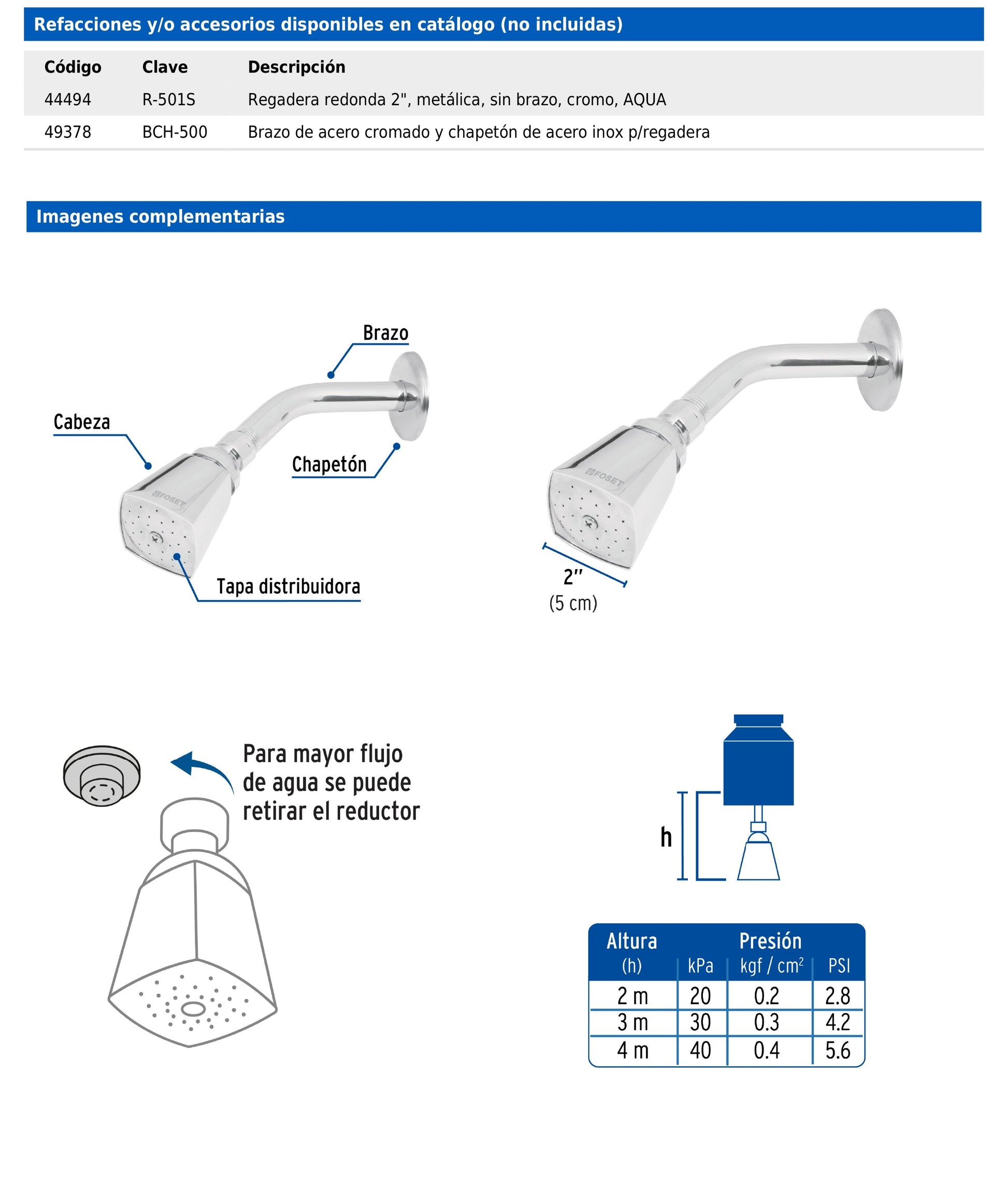 Cuenta con cabeza metálica, brazo de acero cromado y chapetón de acero inoxidable. Además, para mejorar el caudal, permite retirar el reductor. Su presentación cuadrada la convierte en una opción moderna para baños que buscan funcionalidad con estética.