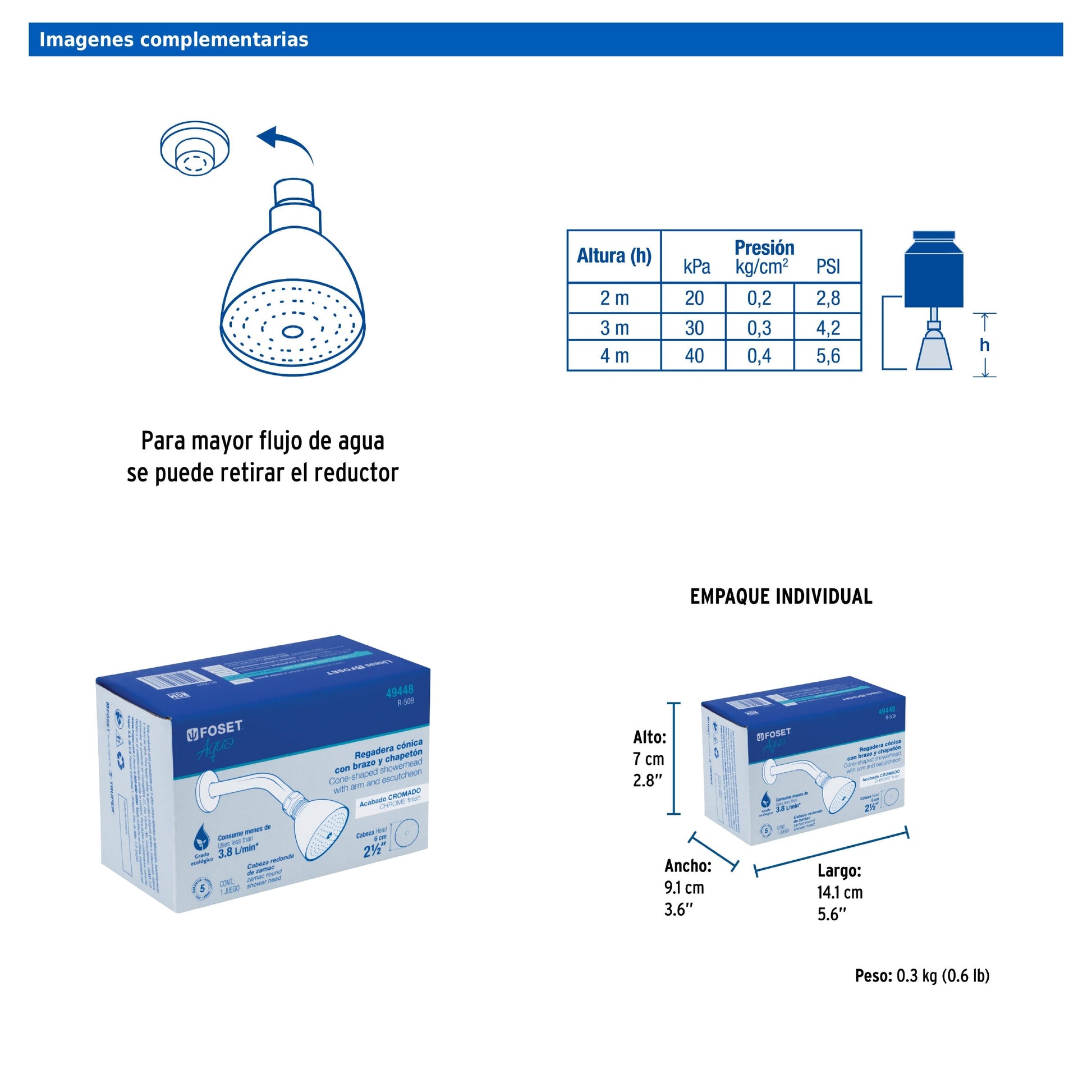 Su construcción robusta combina una cabeza metálica con brazo de acero cromado y chapetón de acero inoxidable. Para mayor caudal, el reductor puede retirarse según las necesidades del usuario.