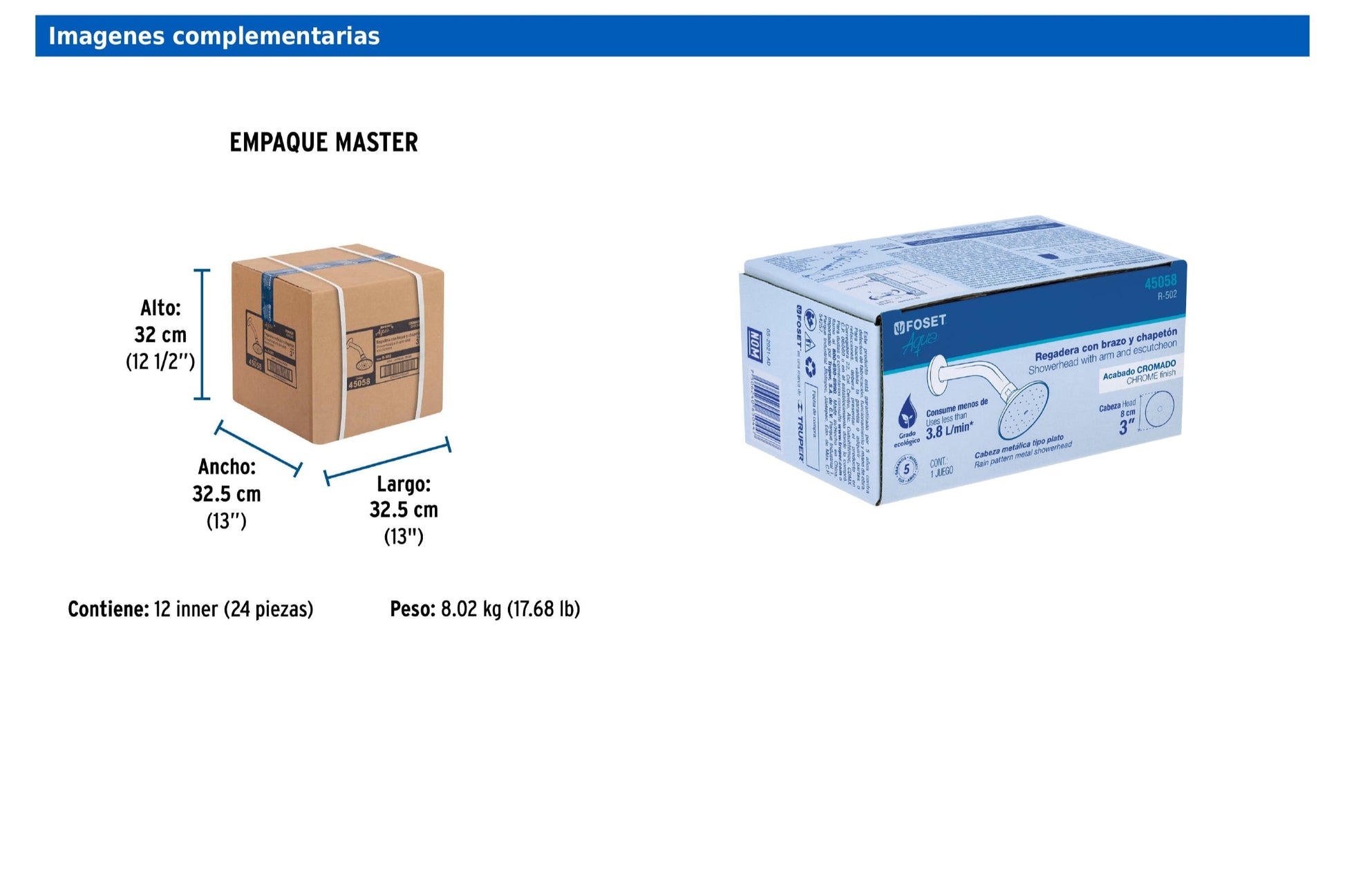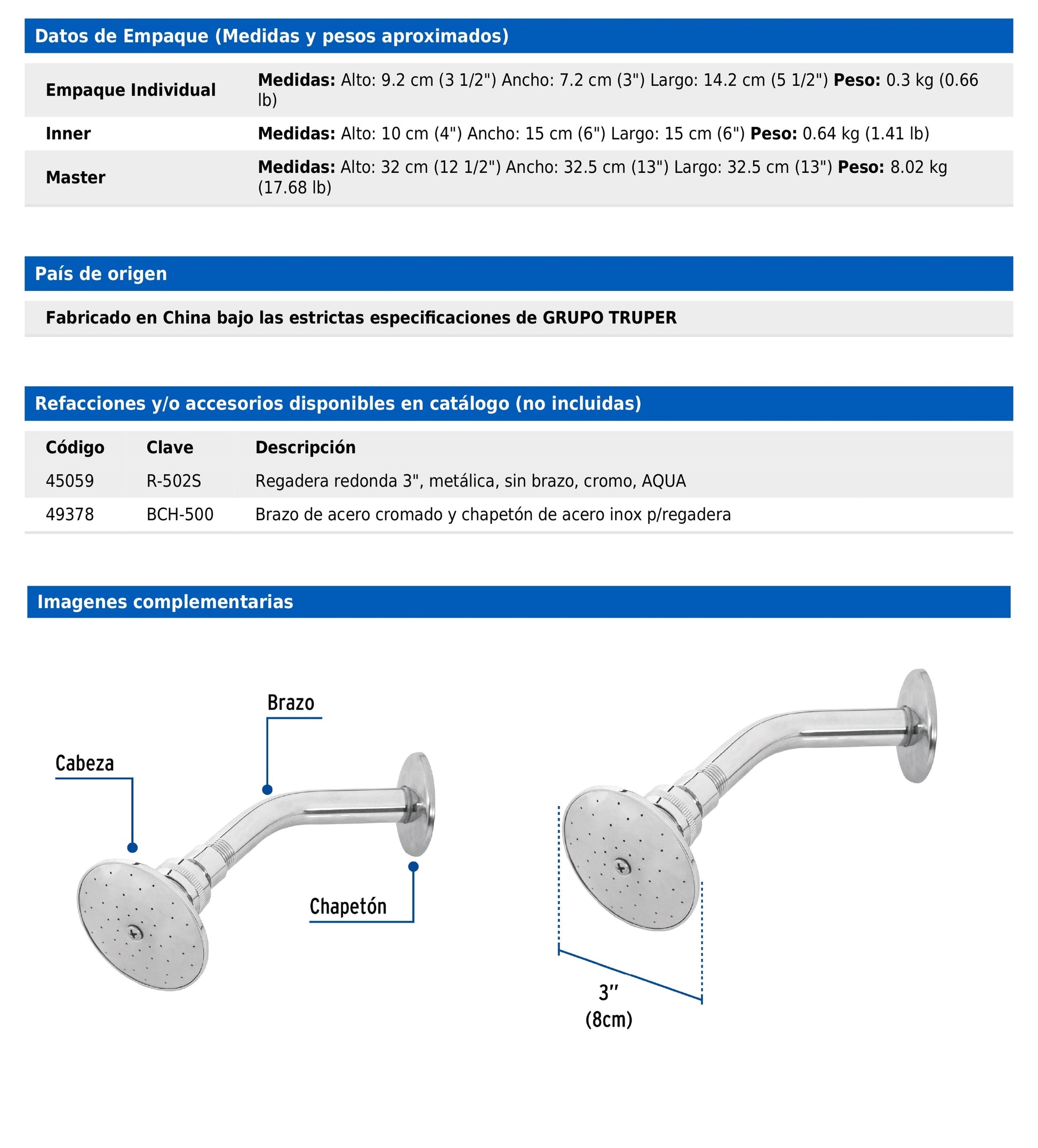 Regadera redonda metálica de 3" con brazo y chapetón cromados