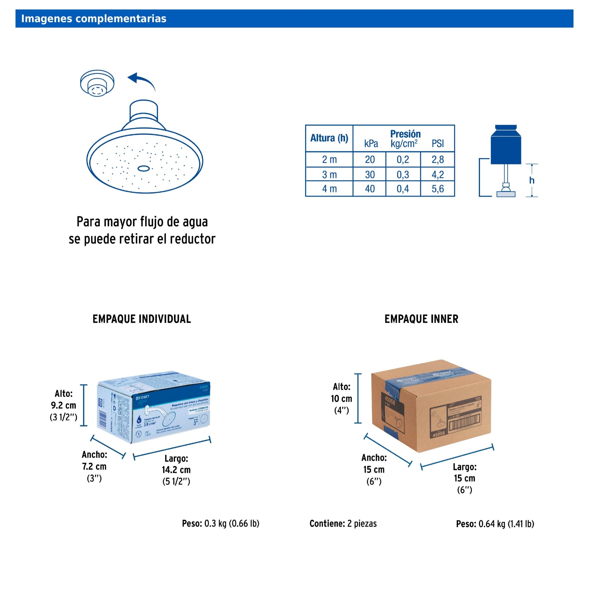 Es apta para baja presión y, si se requiere mayor flujo, puede retirarse el reductor. Su diseño ecológico la convierte en una opción eficiente para el ahorro de agua sin sacrificar rendimiento.