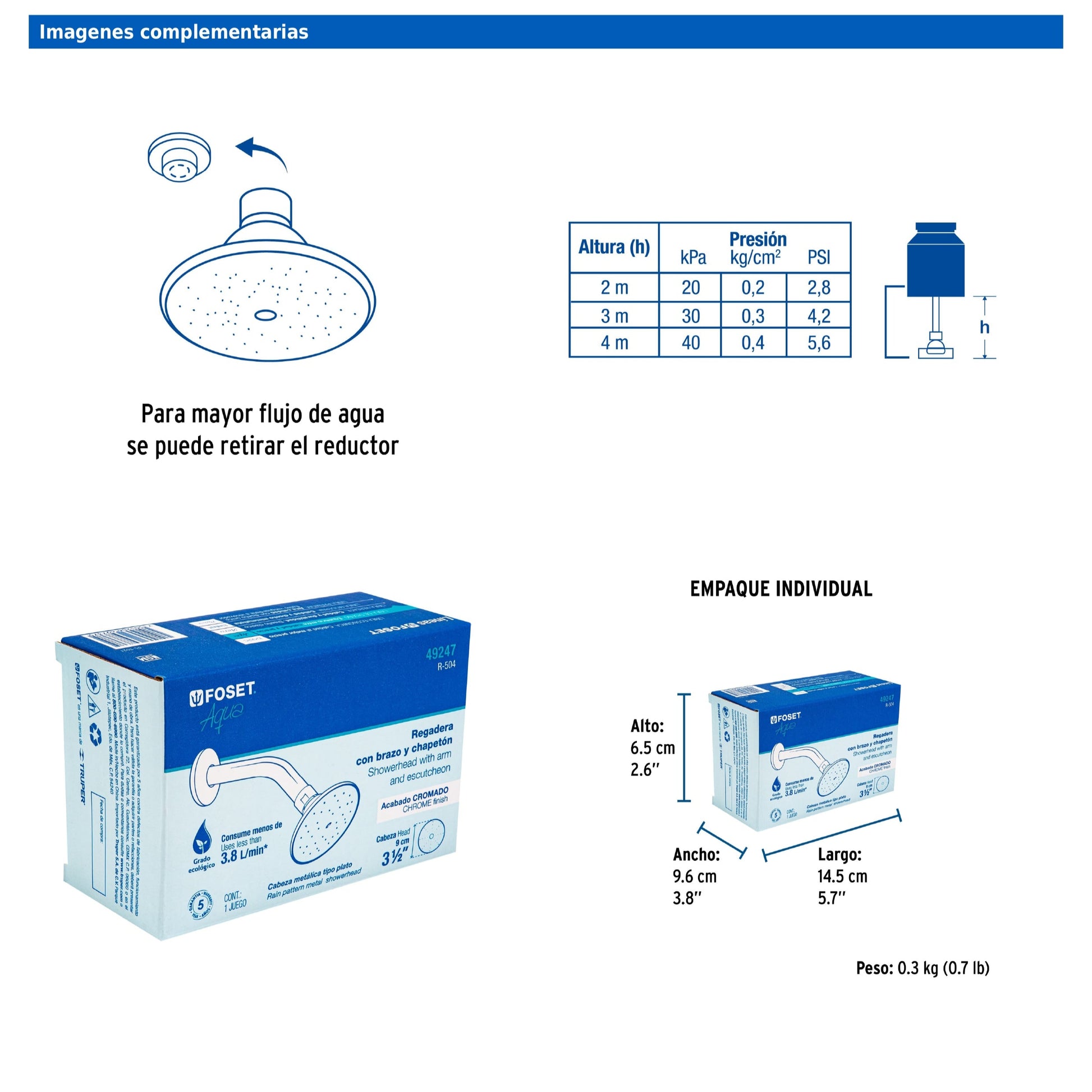 Diseñada para ofrecer un buen flujo incluso con baja presión, esta regadera metálica incluye brazo de acero cromado y chapetón de acero inoxidable.
