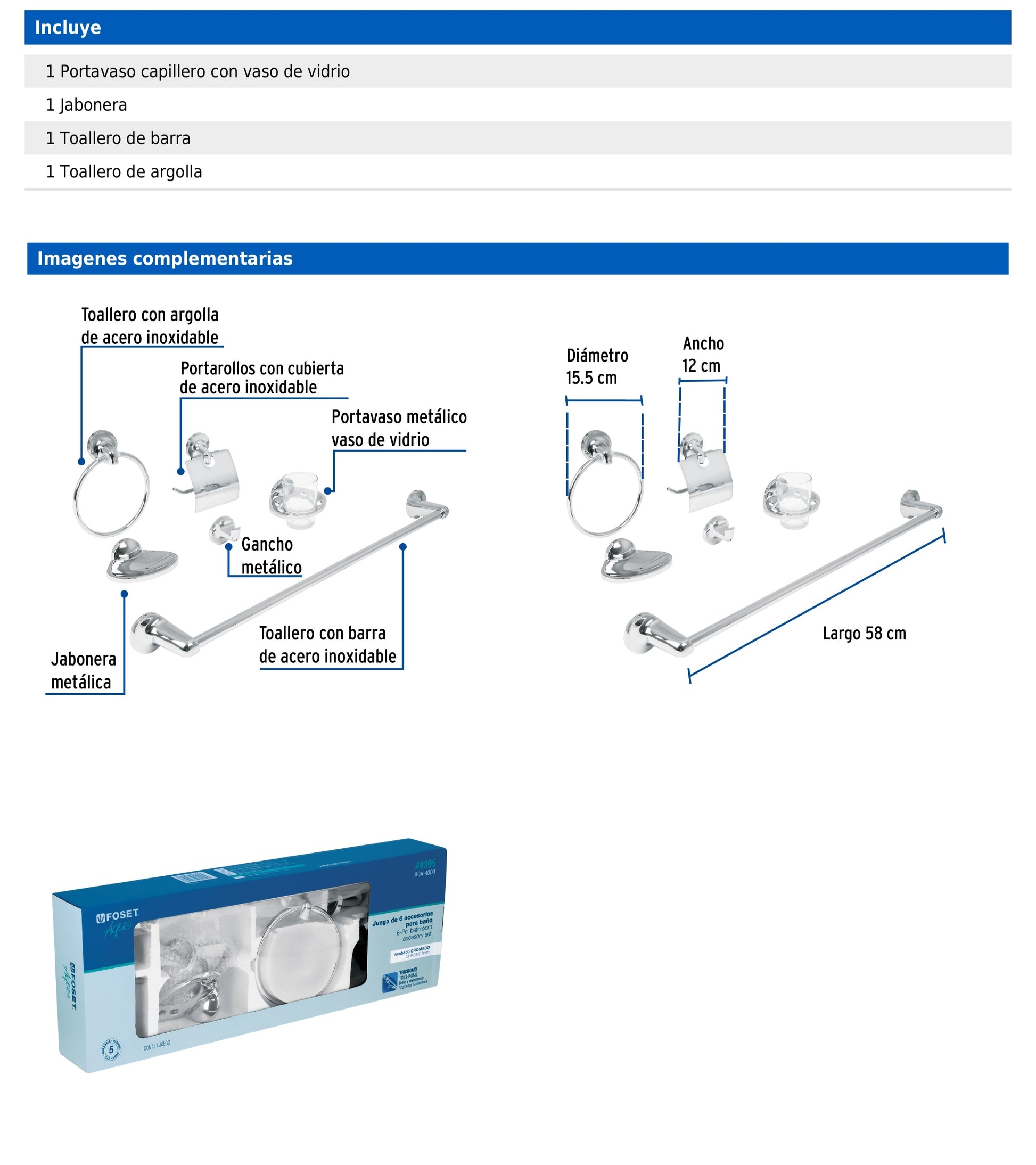 Este set de 6 accesorios está diseñado para brindar funcionalidad y elegancia en baños modernos. Fabricados con materiales resistentes como acero inoxidable, incluyen sistema de montaje semiempotrar con tornillería completa. Su presentación integral es ideal para proyectos residenciales o comerciales.