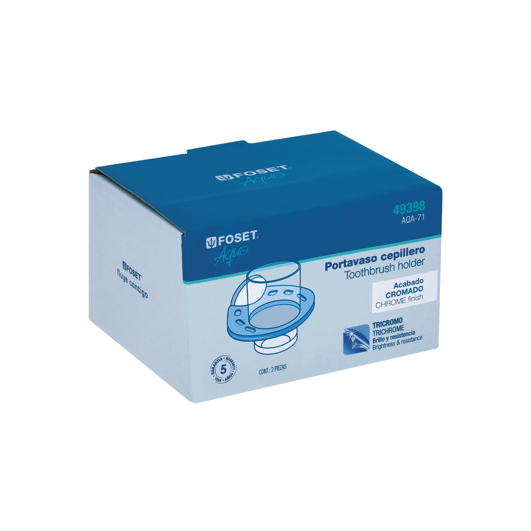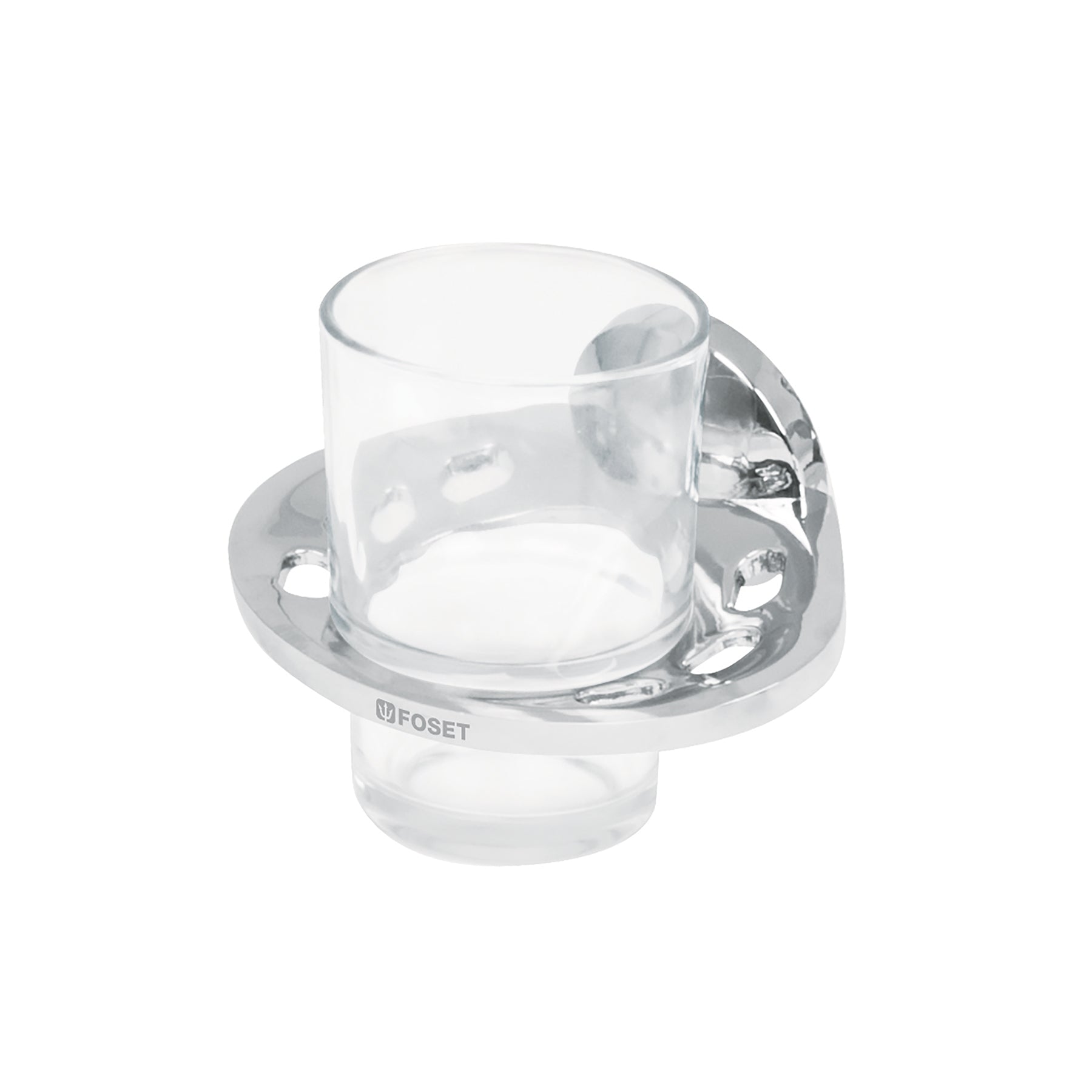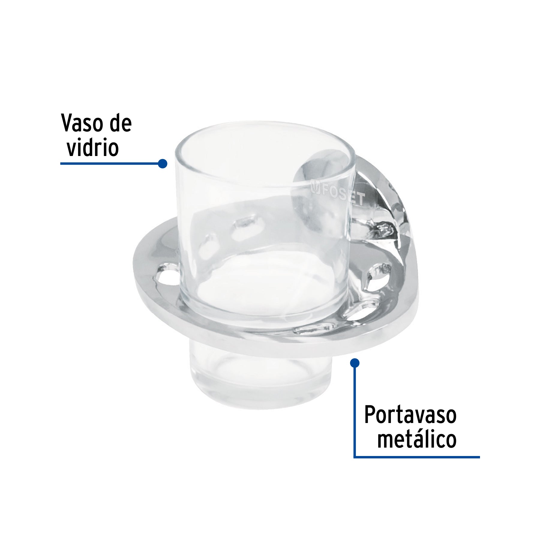 Portavaso de diseño moderno fabricado en metal con vaso de vidrio. Su sistema de instalación semiempotrar incluye tornillería, taquetes y llave allen. Es una solución práctica y estética para baños residenciales, combinando durabilidad con estilo.