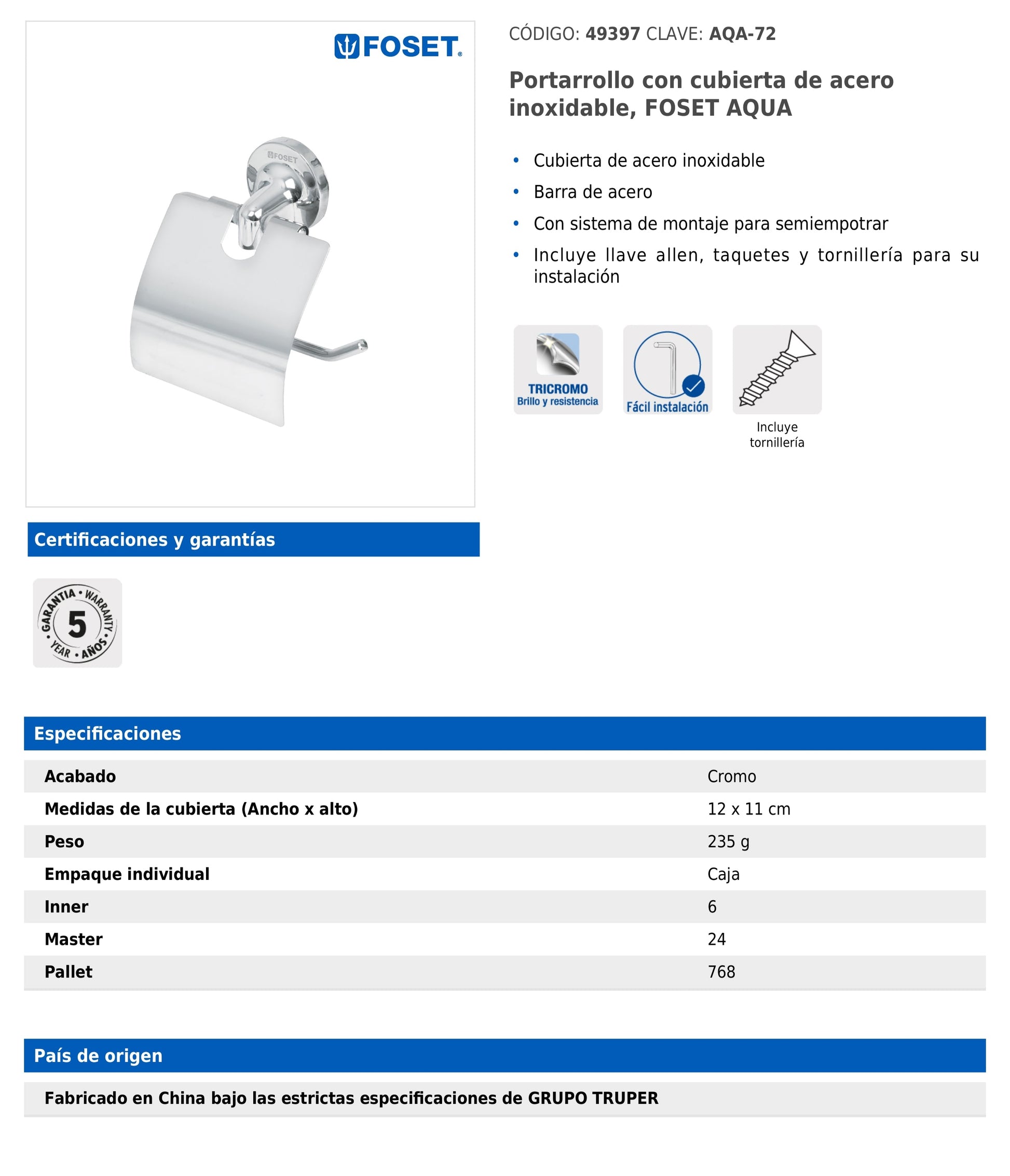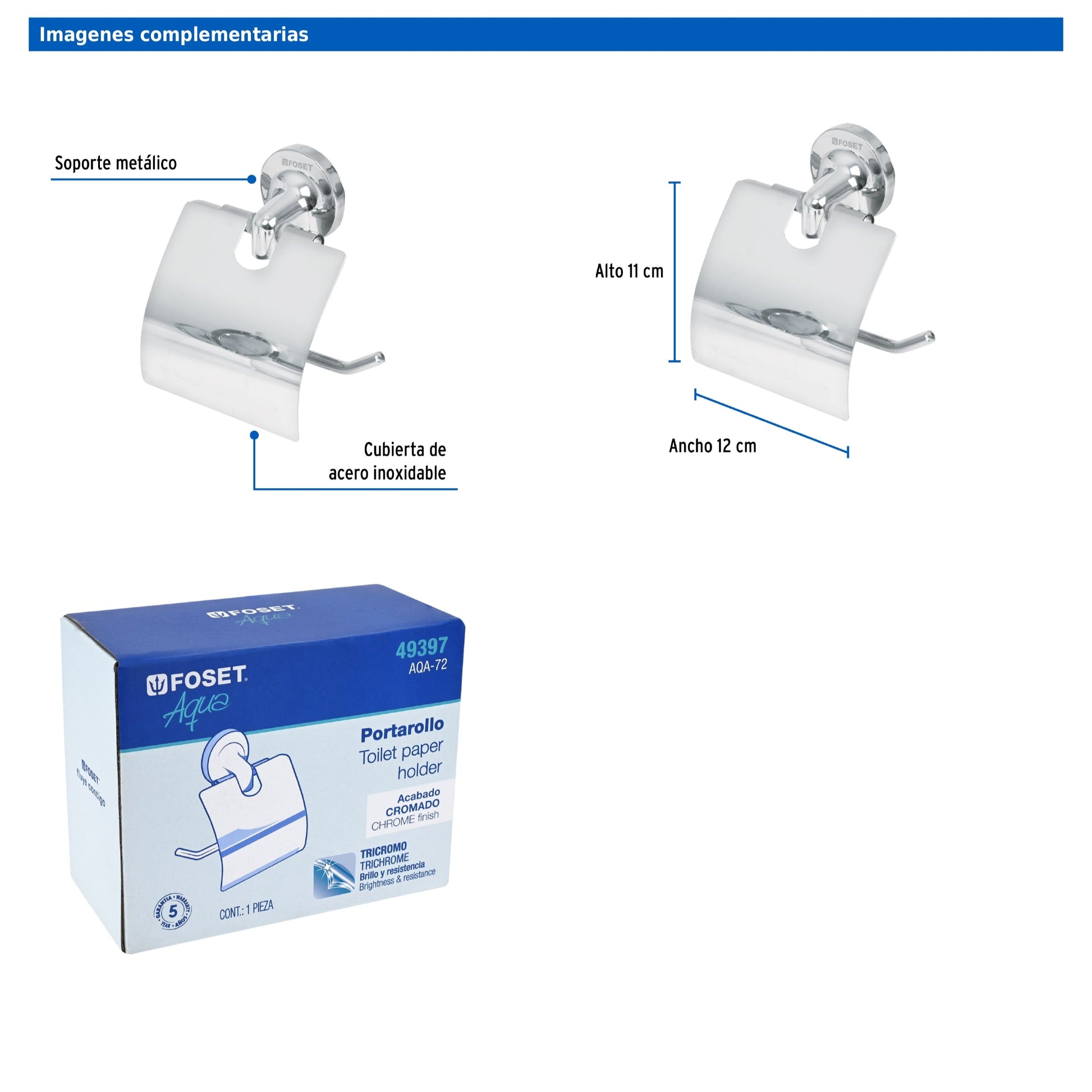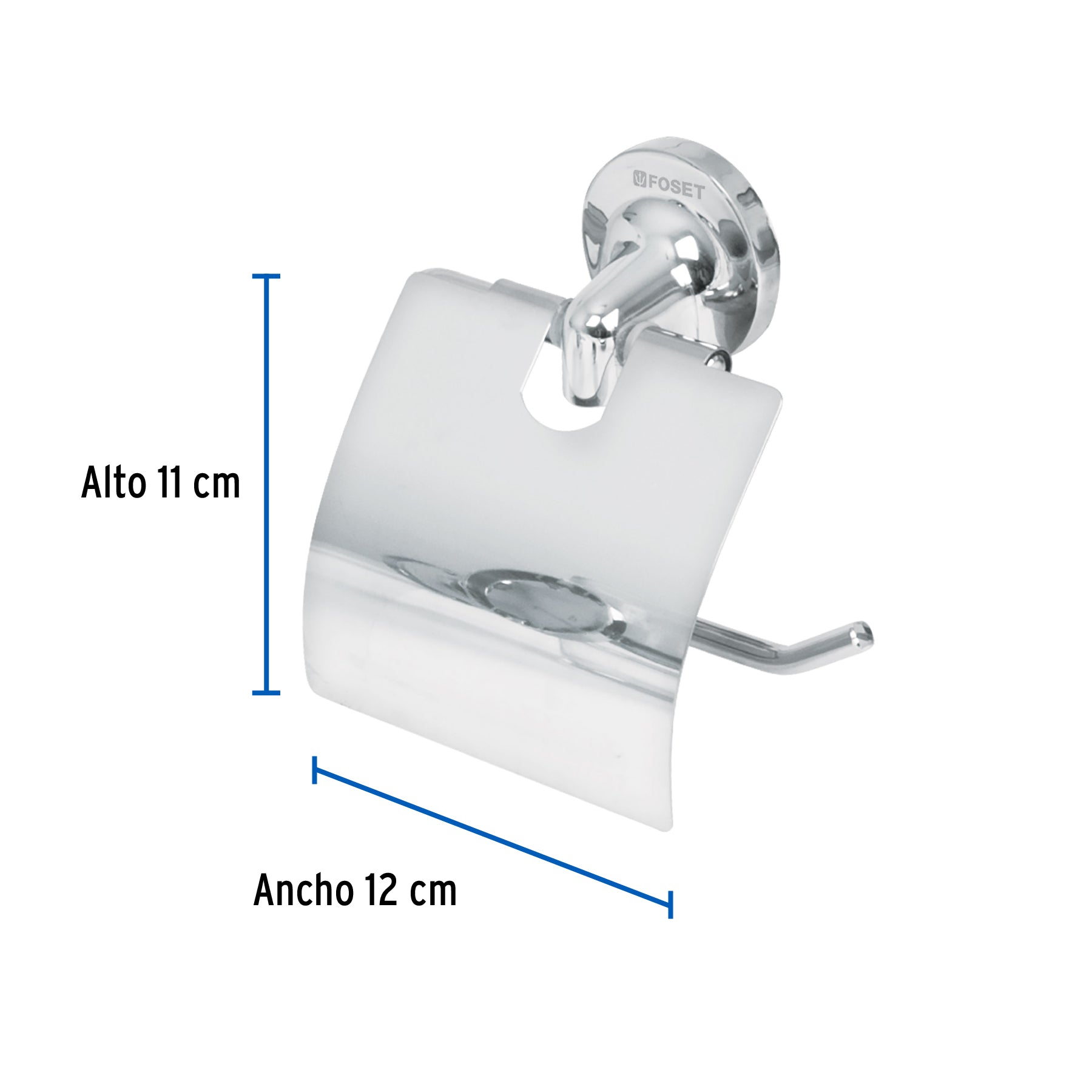 Portarrollo metálico con barra y cubierta de acero inoxidable, ideal para baños que requieren soluciones discretas y duraderas. Se instala mediante sistema semiempotrar y se suministra con llave allen, taquetes y tornillos. Su diseño compacto con cubierta oculta el rollo, brindando mayor estética.