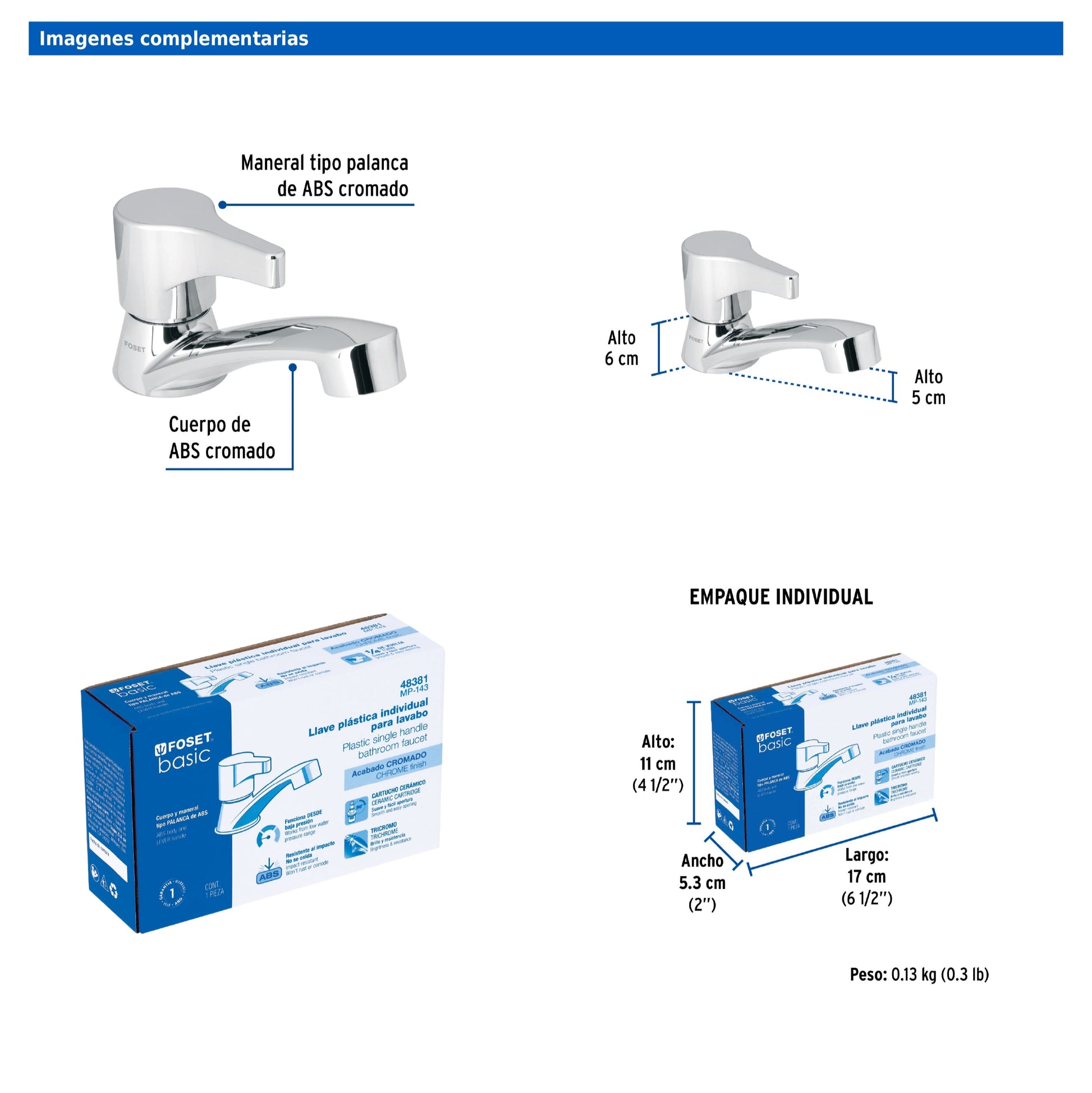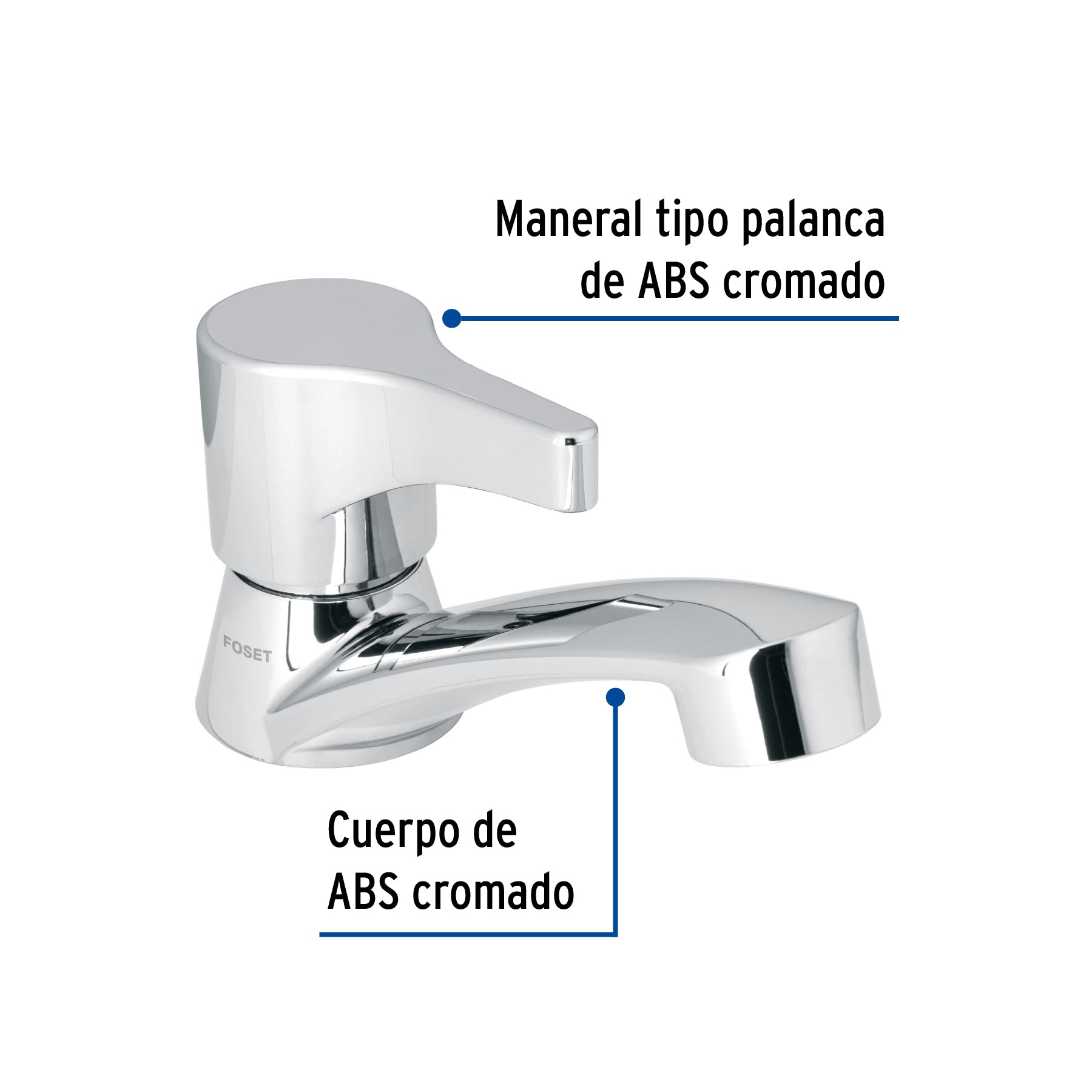 Llave para lavabo Foset Basic fabricada en ABS con acabado cromo que no se oxida, ideal para zonas costeras o de alta humedad. Su maneral tipo palanca y cartucho cerámico de 1/4 de vuelta brindan una apertura suave y precisa. Es ligera, resistente y compatible con conexiones estándar de 1/2".