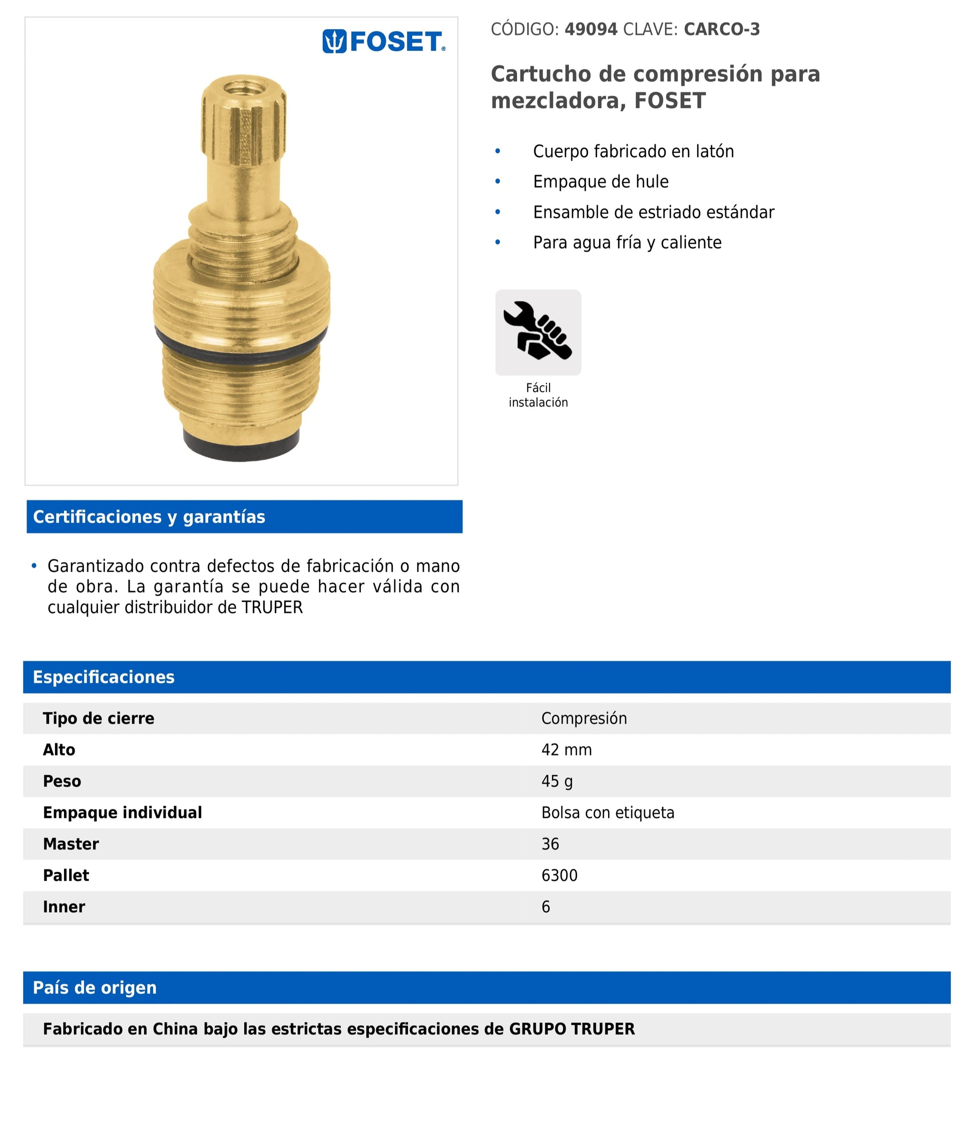 Cartucho de cierre por compresión, con cuerpo fabricado en latón y empaque de hule. El ensamble es de tipo estriado estándar, lo que permite una instalación sencilla y compatibilidad con la mayoría de mezcladoras. Apto para agua fría y caliente, es ideal como repuesto confiable en ambientes residenciales o comerciales.