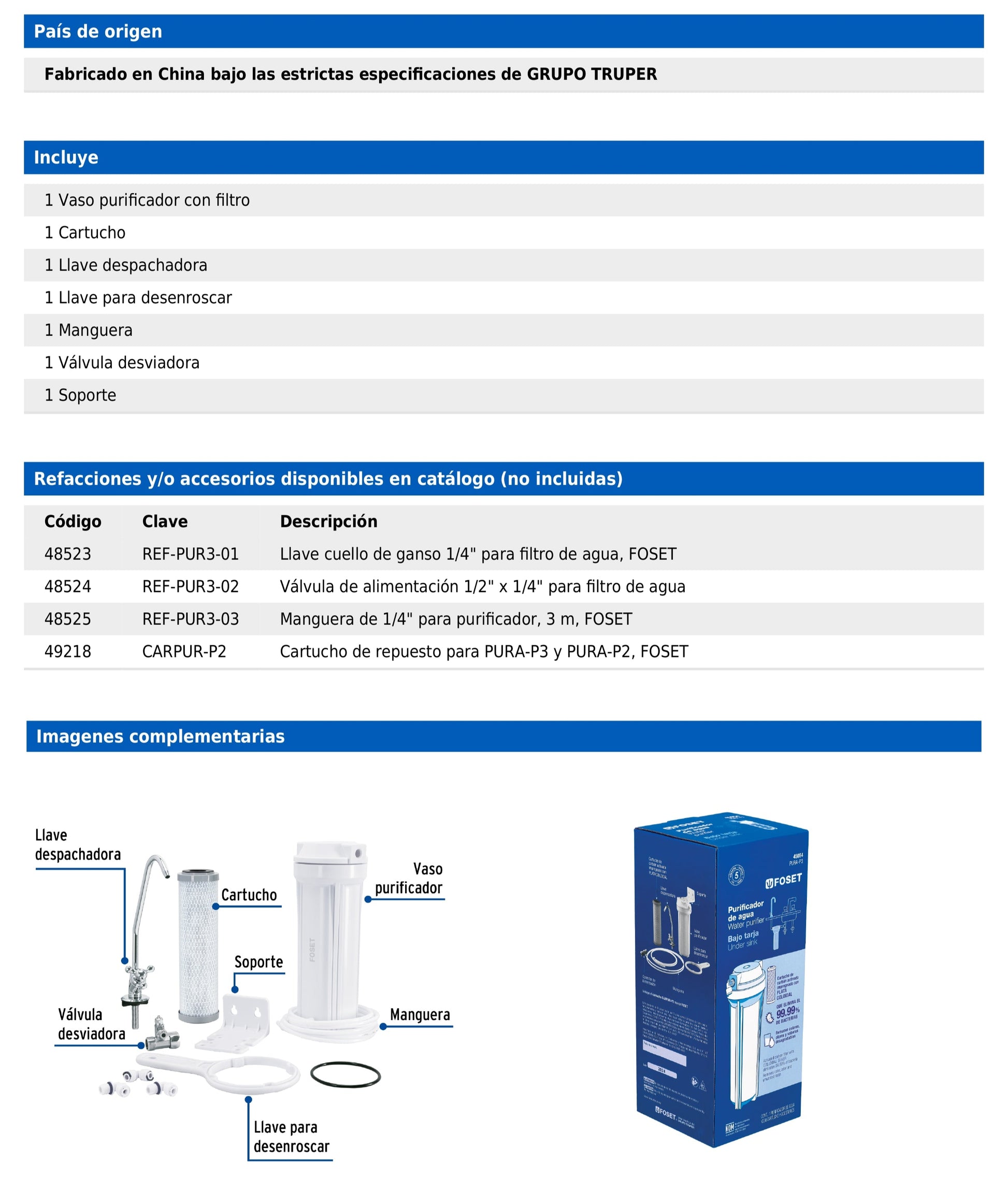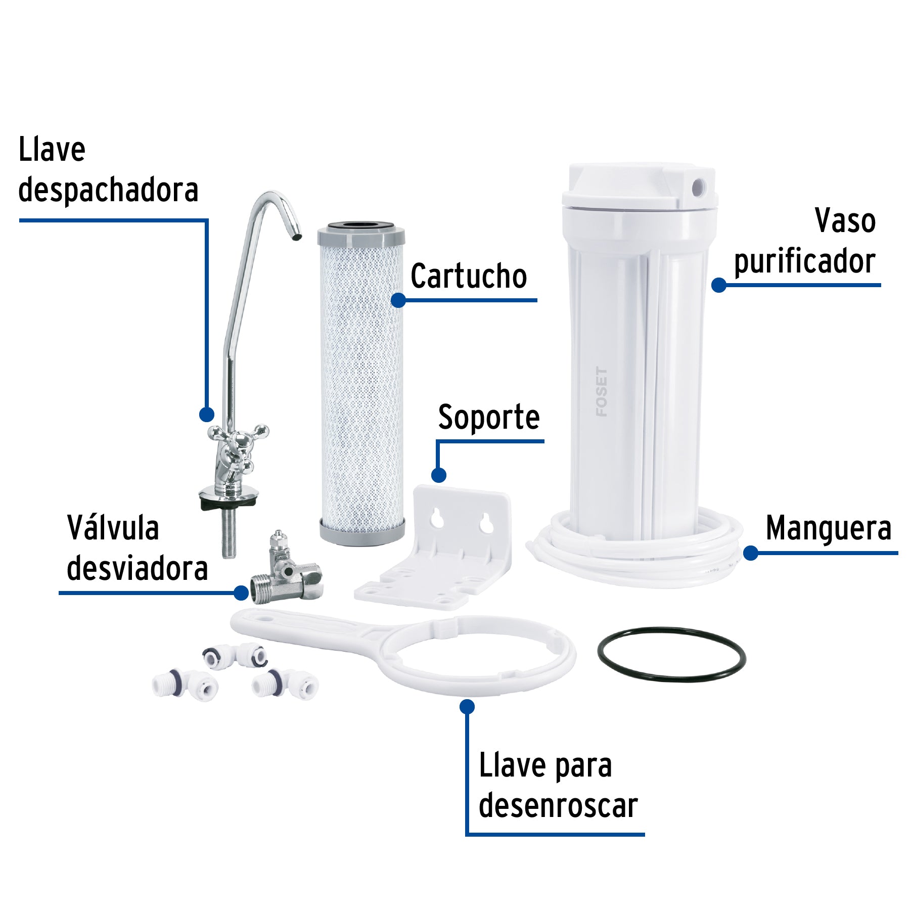 Este purificador FOSET se instala de forma discreta bajo la tarja y elimina el 99.9% de bacterias, así como olor, color y sabor a cloro. Incorpora cartucho de carbón activado con plata coloidal y retención de sedimentos. Su diseño compacto permite instalación rápida y mantenimiento sencillo con cambio semestral de cartucho.