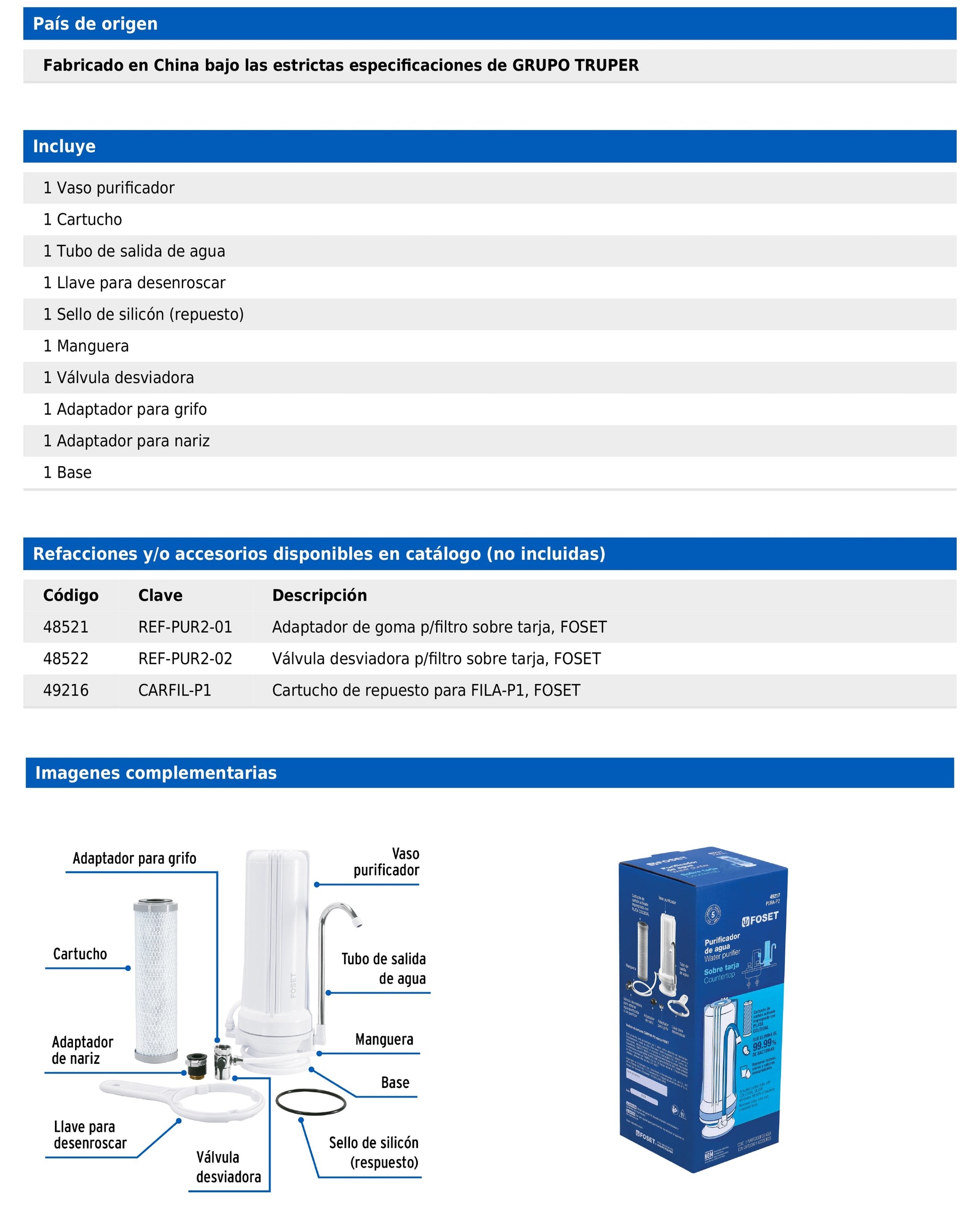 Diseñado para colocarse directamente sobre la tarja, este purificador FOSET elimina el 99.9% de bacterias, así como el olor, color y sabor a cloro. Su cartucho de carbón activado impregnado de plata coloidal también retiene sólidos en suspensión. Incluye todo lo necesario para su instalación inmediata y ofrece una vida útil de hasta 6 meses por cartucho.