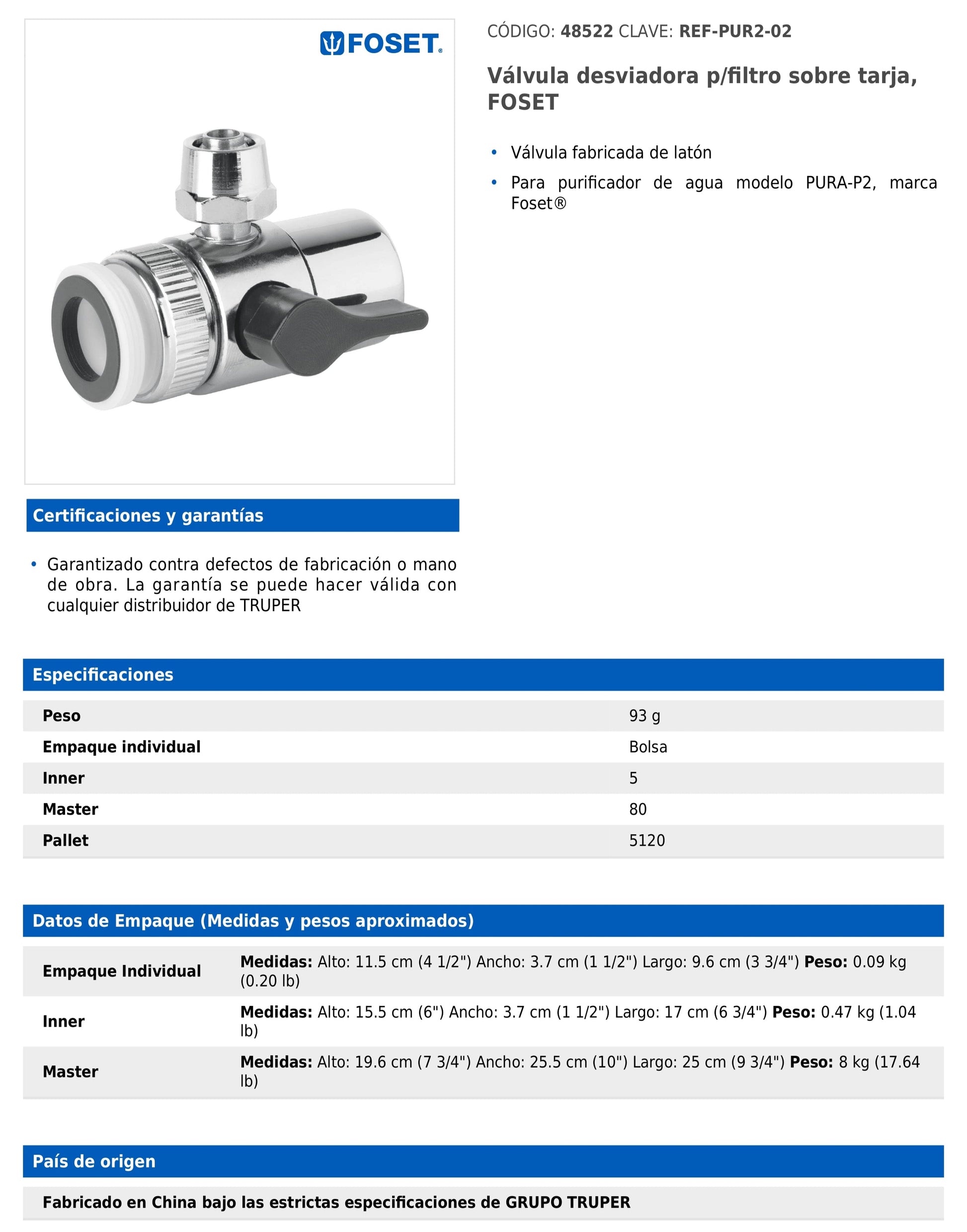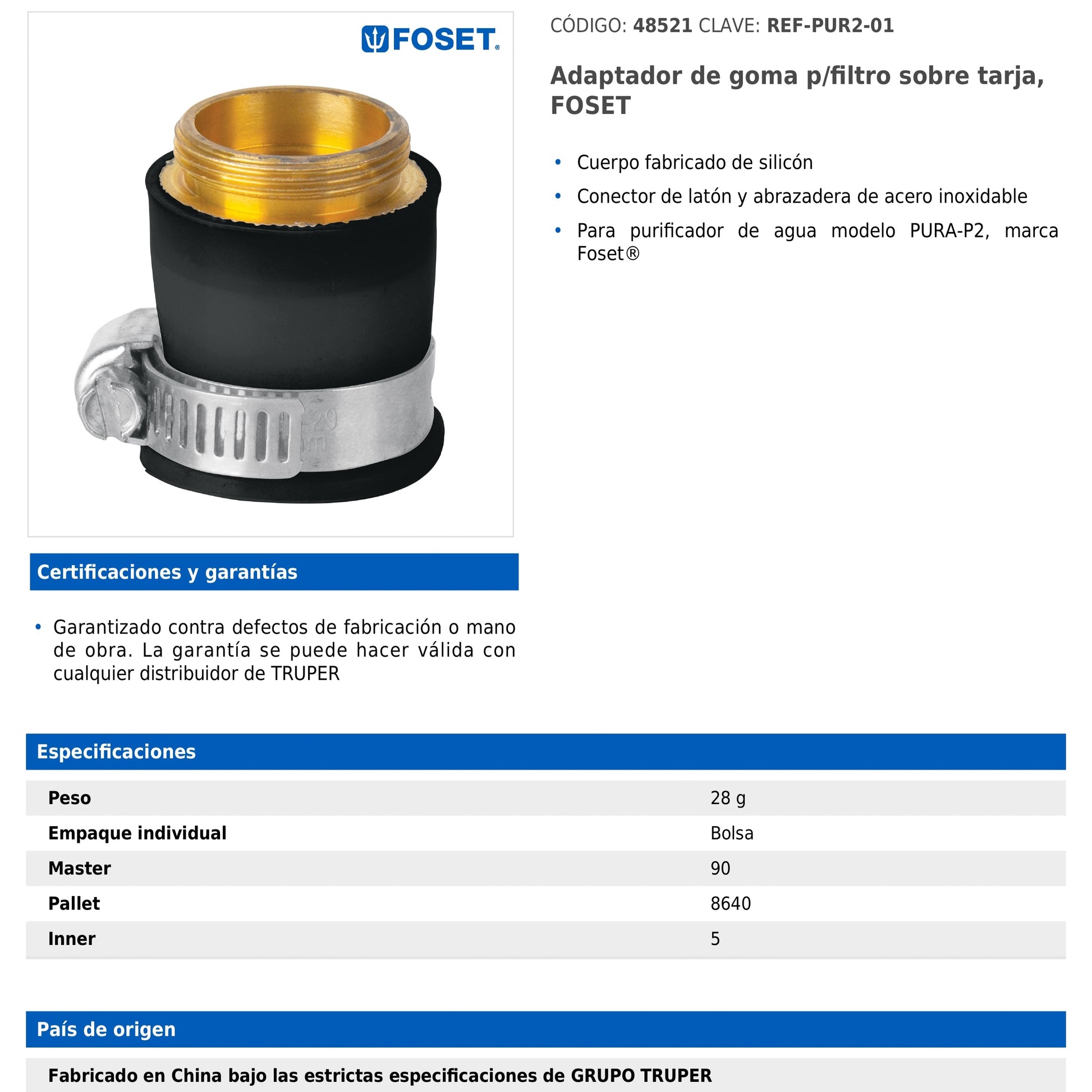Cuerpo de silicón con conector de latón y abrazadera de acero inoxidable. Diseñado para el purificador de agua modelo PURA-P2 de la marca Foset®.