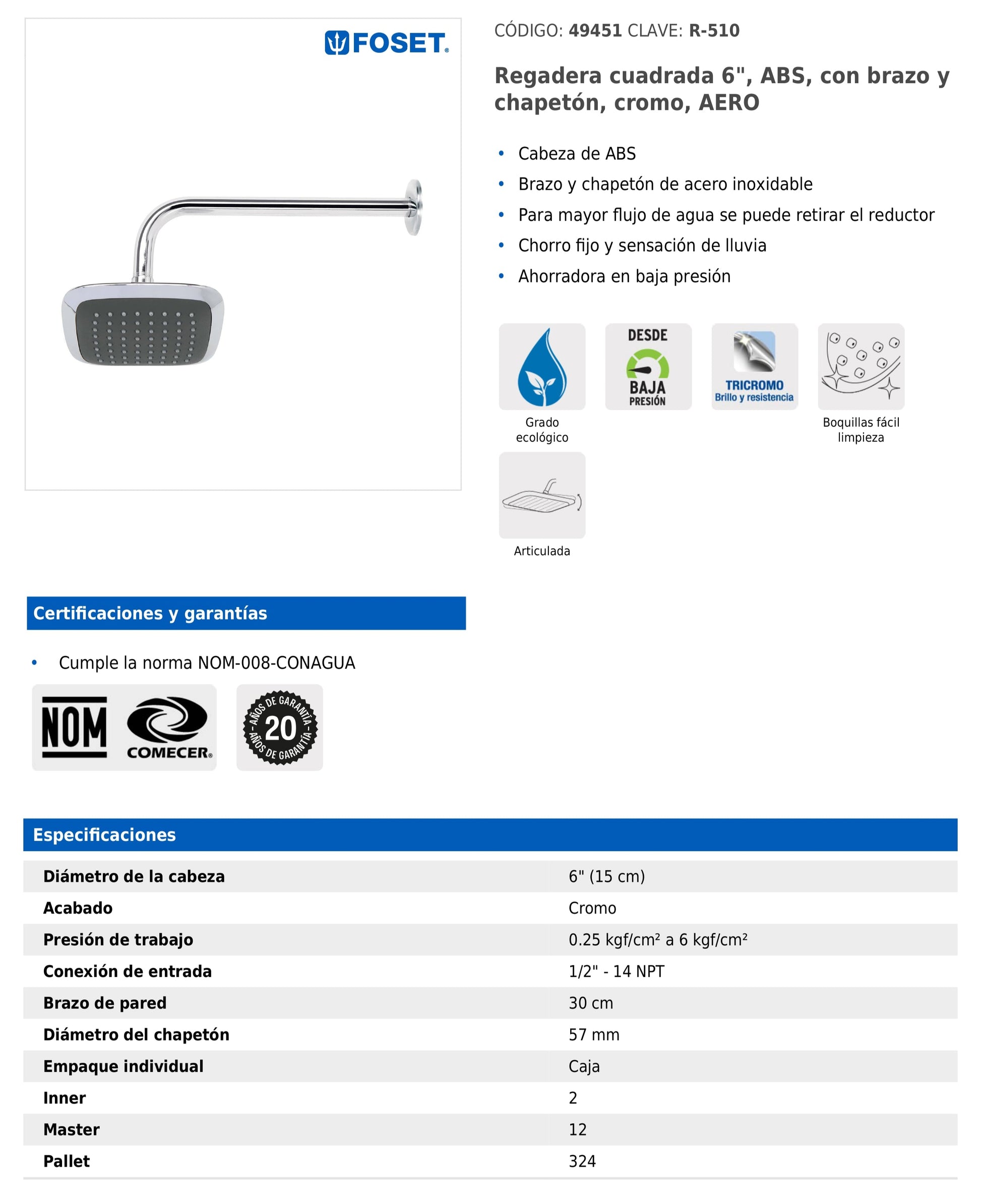 Con un diseño moderno tipo lluvia, esta regadera de 6" está fabricada en ABS con brazo de acero inoxidable de 30 cm y chapetón cromado. Ofrece chorro fijo, sensación envolvente y boquillas de fácil limpieza. Además, permite retirar el reductor para aumentar el flujo de agua. Ideal para ambientes residenciales de bajo consumo.