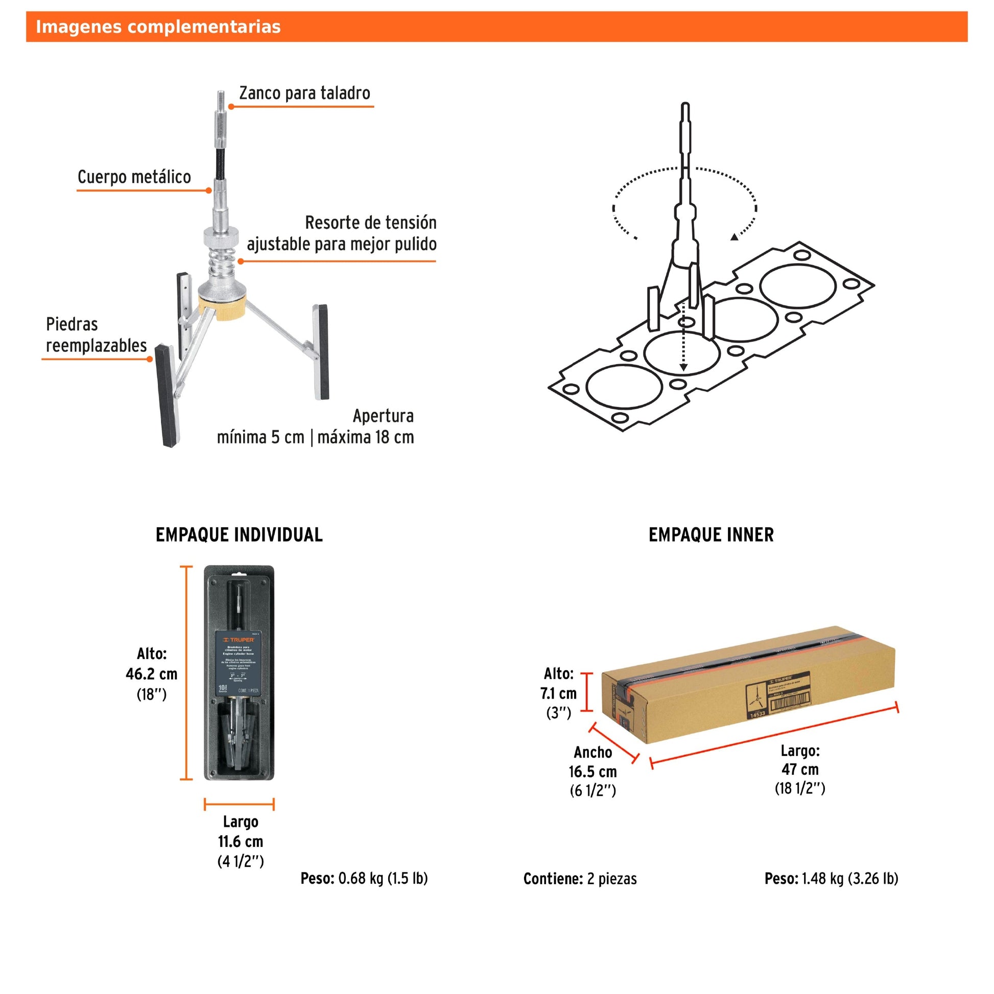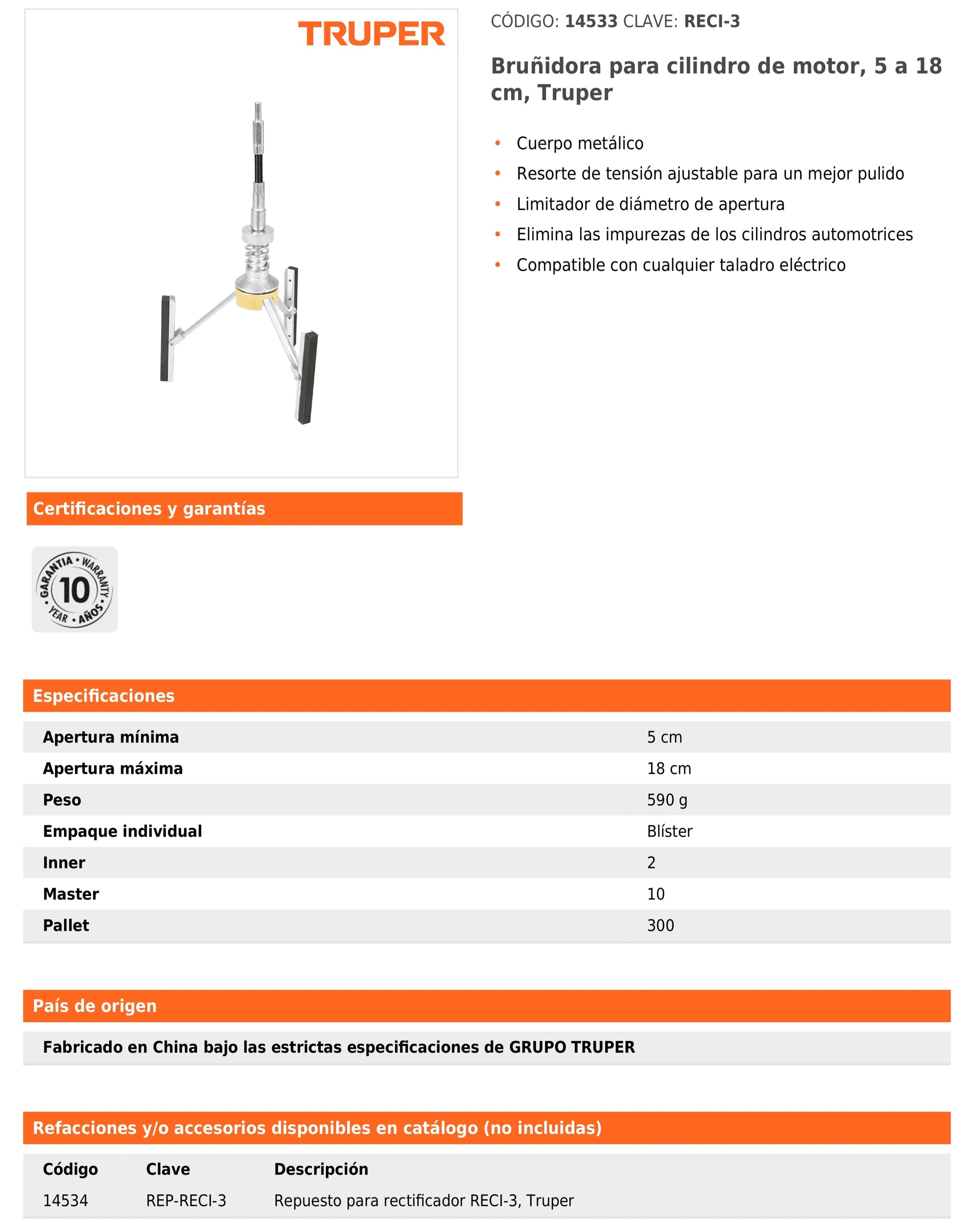 La bruñidora Truper RECI-3 cuenta con cuerpo metálico, resorte de tensión ajustable y limitador de diámetro, lo que permite un pulido uniforme y preciso en cilindros automotrices.