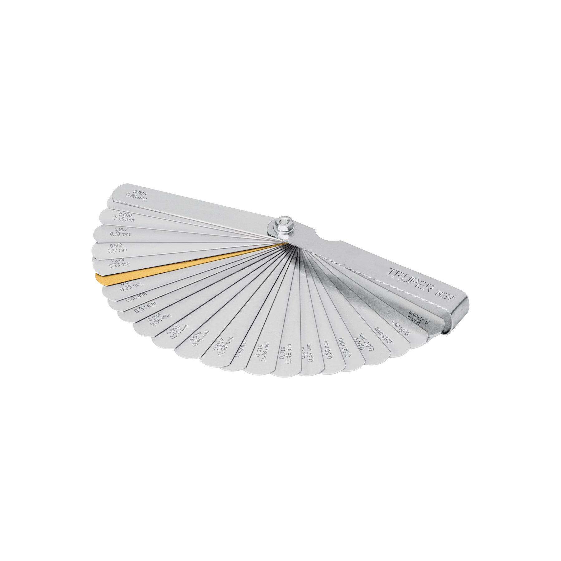 Calibrador Truper de 32 hojas con cuerpo de acero y hoja de latón ideal para mediciones entre componentes magnéticos. Ofrece una graduación precisa de 0.04 mm a 0.88 mm para trabajos de ajuste fino.