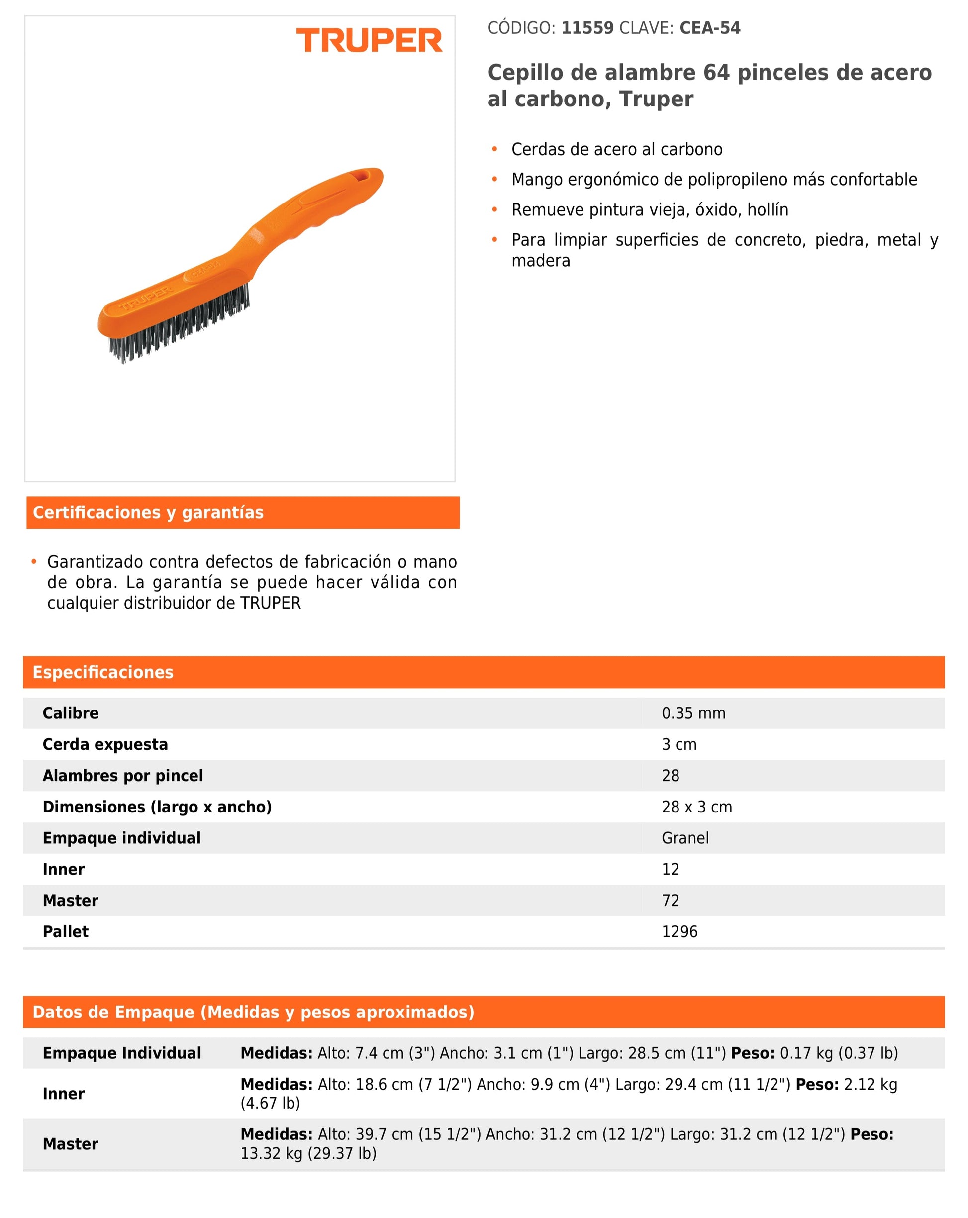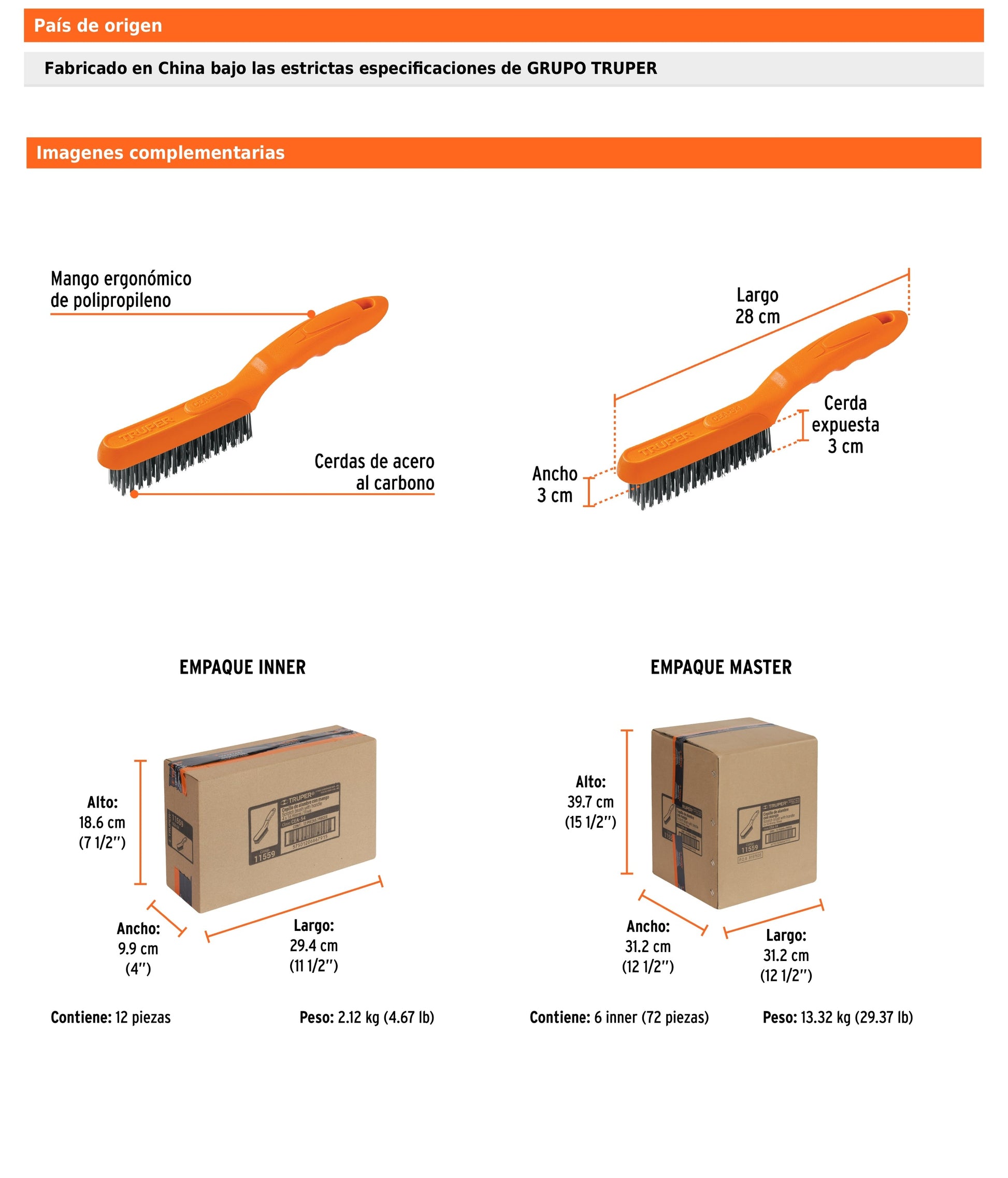 Este cepillo Truper de 28 cm cuenta con 64 pinceles de cerdas de acero al carbono para remover pintura, óxido y hollín.