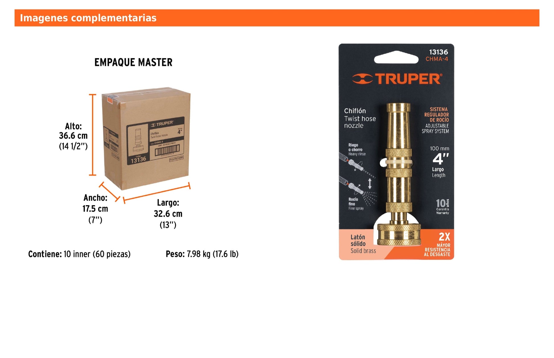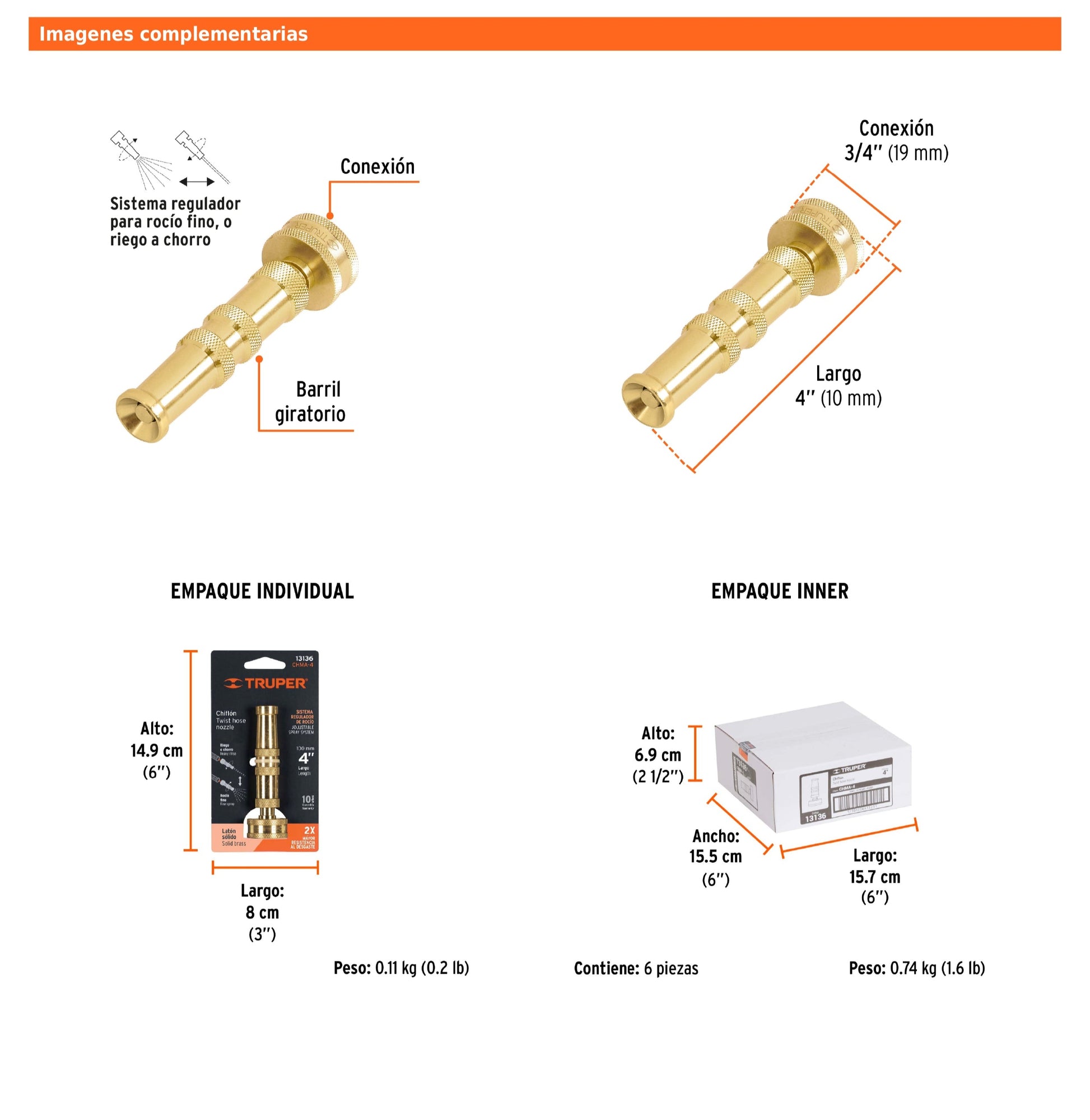 Este chiflón de 4" ofrece un ajuste preciso de rocío a chorro, ideal para labores de jardinería, riego y limpieza con presión. Su cuerpo está fabricado en latón maquinado, lo que brinda el doble de resistencia al desgaste frente a materiales comunes y asegura un rendimiento prolongado.