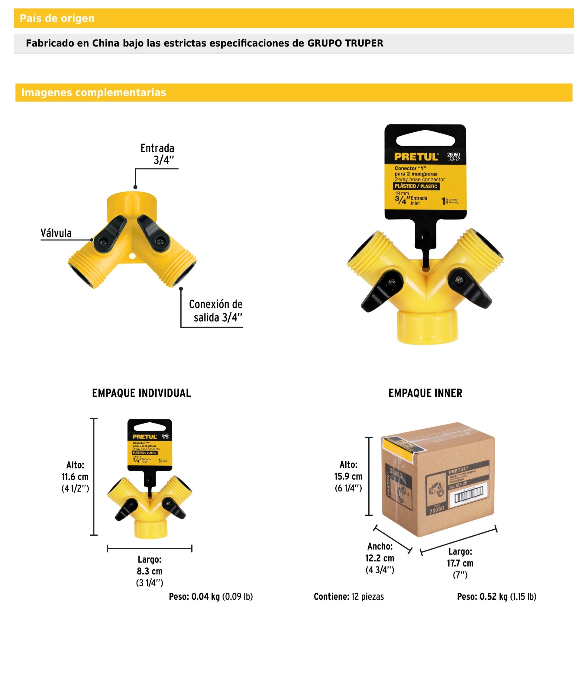 Este conector en forma de “Y” facilita la división del flujo de agua desde una sola fuente hacia dos salidas. Está fabricado en plástico resistente y cuenta con válvulas individuales en cada salida, lo que permite regular el flujo o cerrarlo por completo según las necesidades.