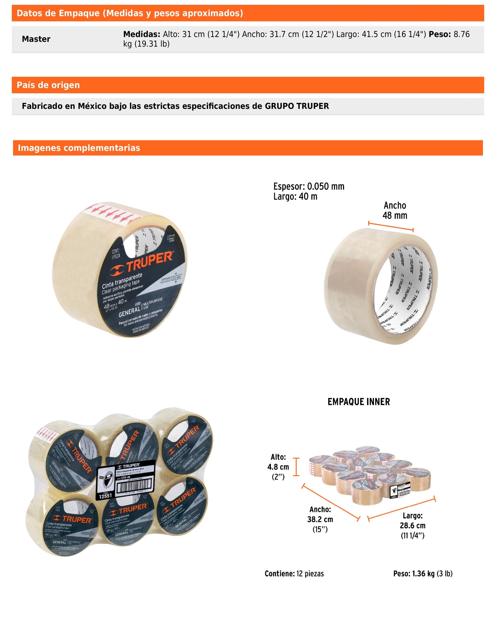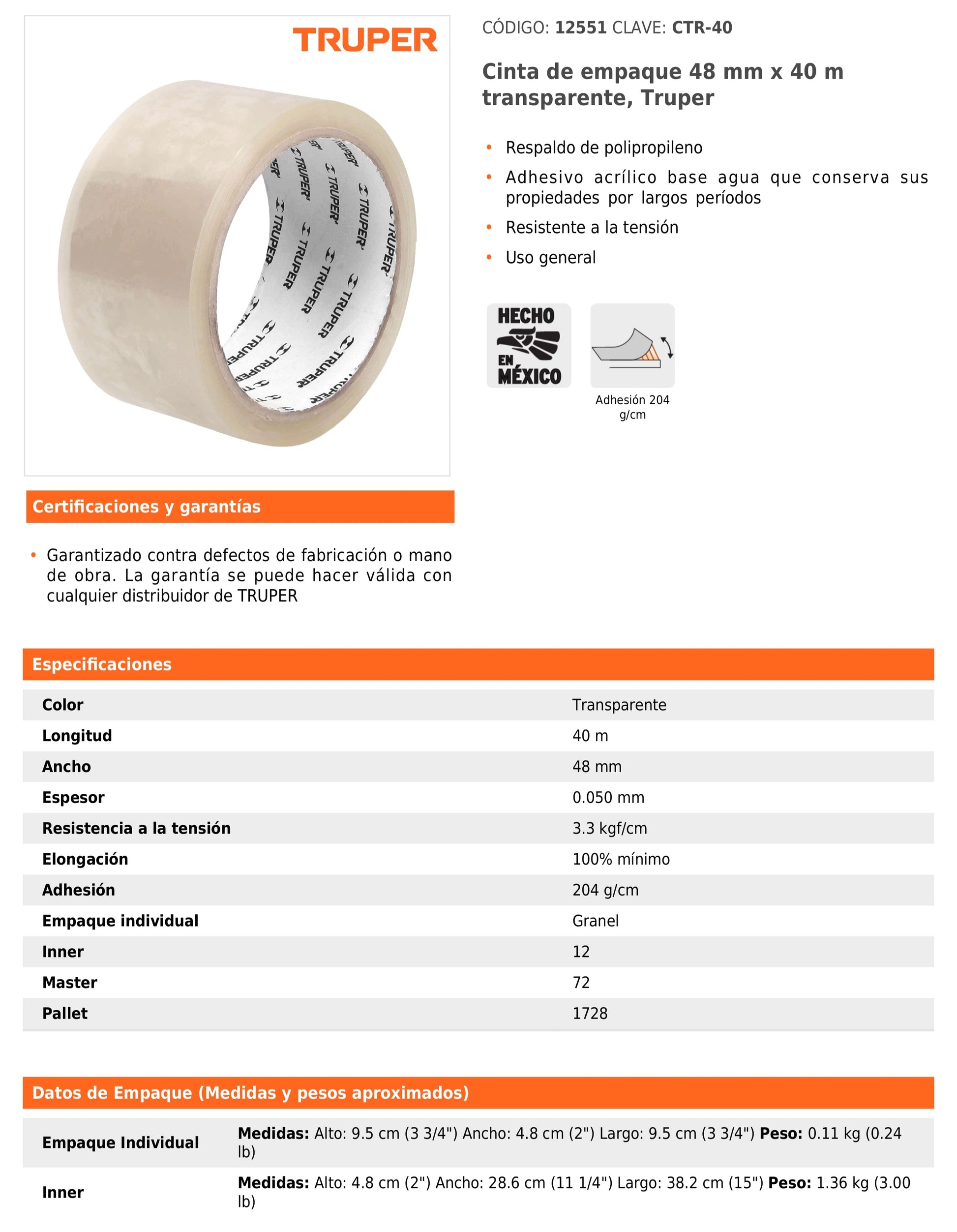 La cinta de empaque Truper de 2" x 40 m cuenta con respaldo de polipropileno y adhesivo acrílico base agua, ideal para uso general.