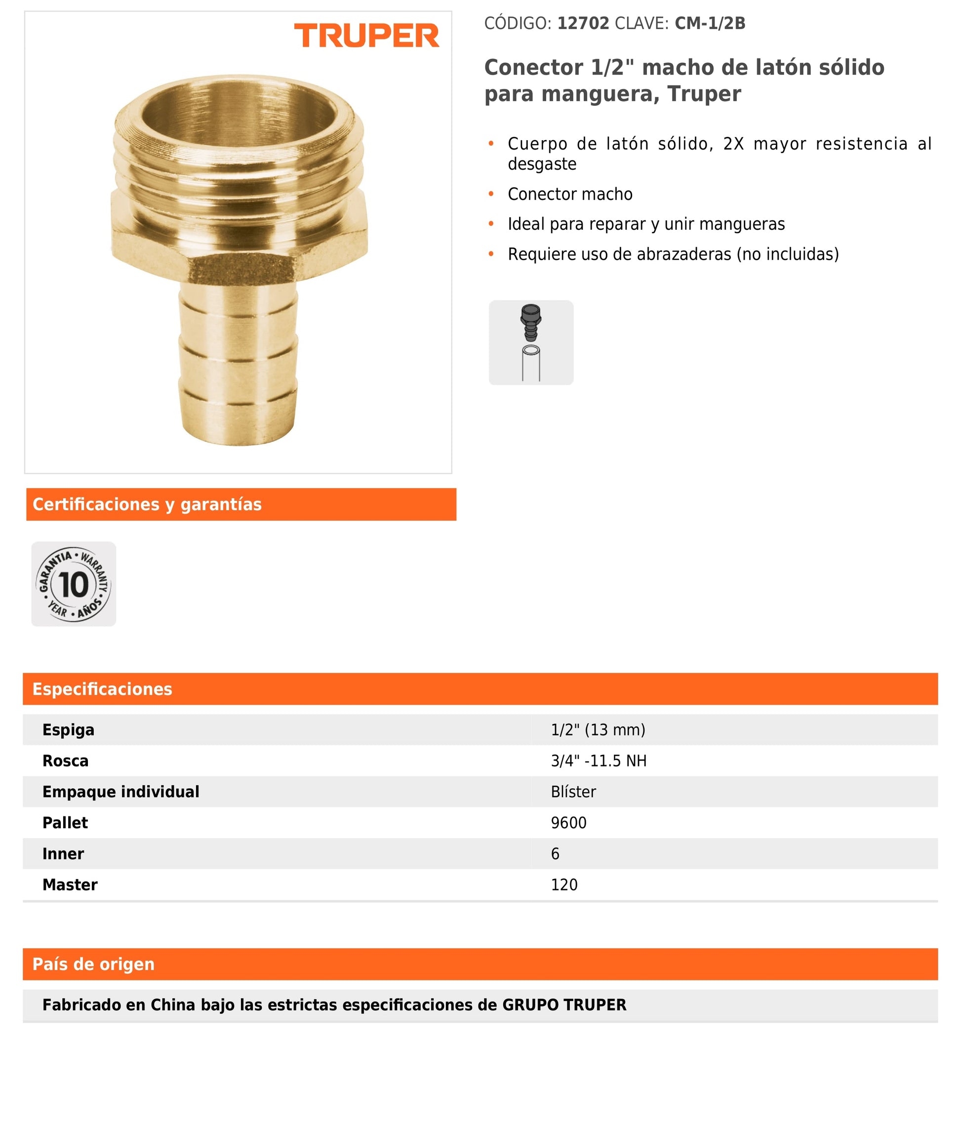 Conector macho para manguera de 1/2", fabricado en latón sólido que garantiza una vida útil prolongada. Su construcción robusta ofrece el doble de resistencia al desgaste frente a modelos convencionales, ideal para reparaciones o uniones duraderas.