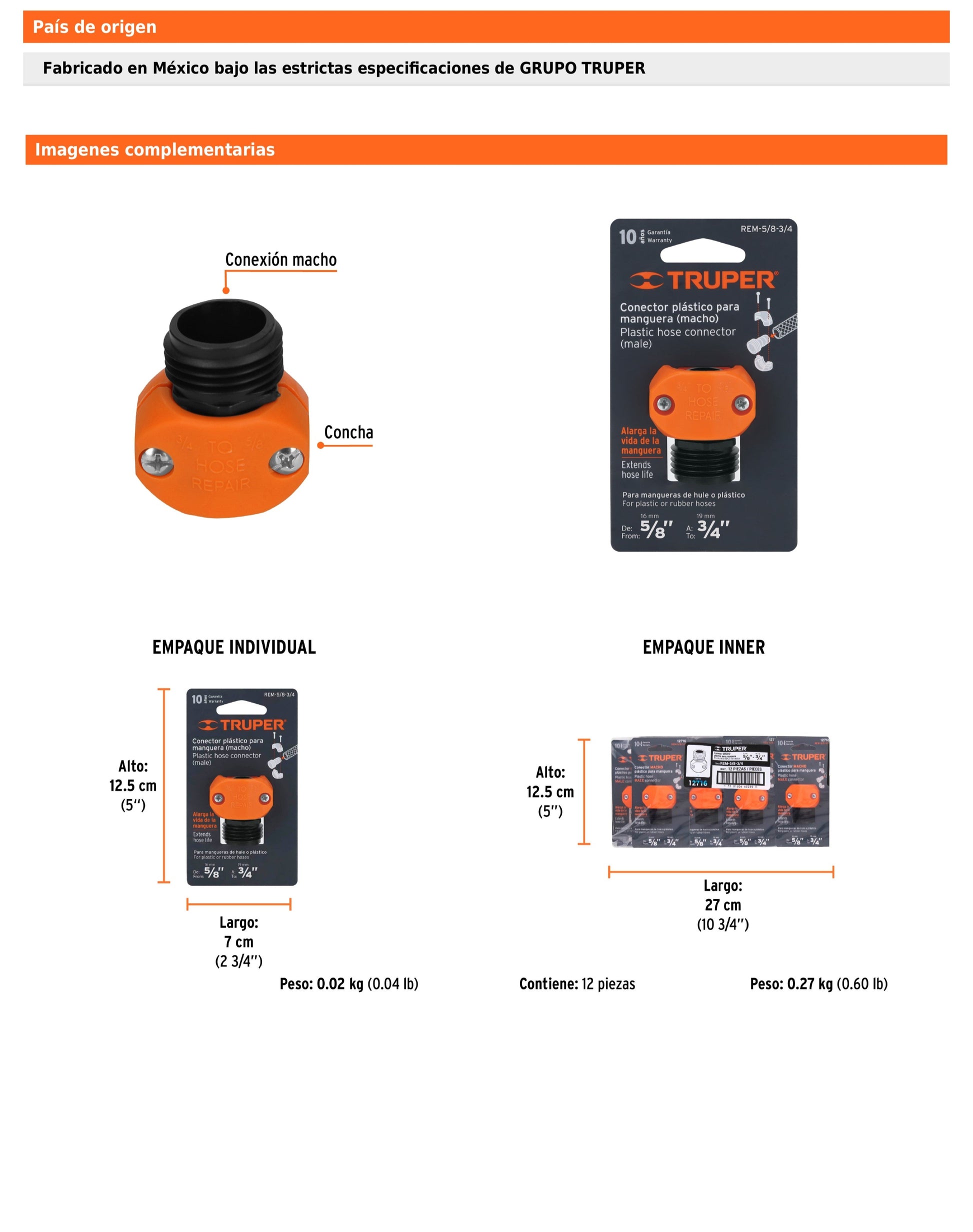 Diseñado para prolongar la vida útil de tus mangueras, este conector macho está fabricado en ABS resistente a impactos, lo que garantiza durabilidad en condiciones de uso frecuente. Su estructura facilita una conexión segura y confiable en instalaciones de jardinería y uso doméstico.