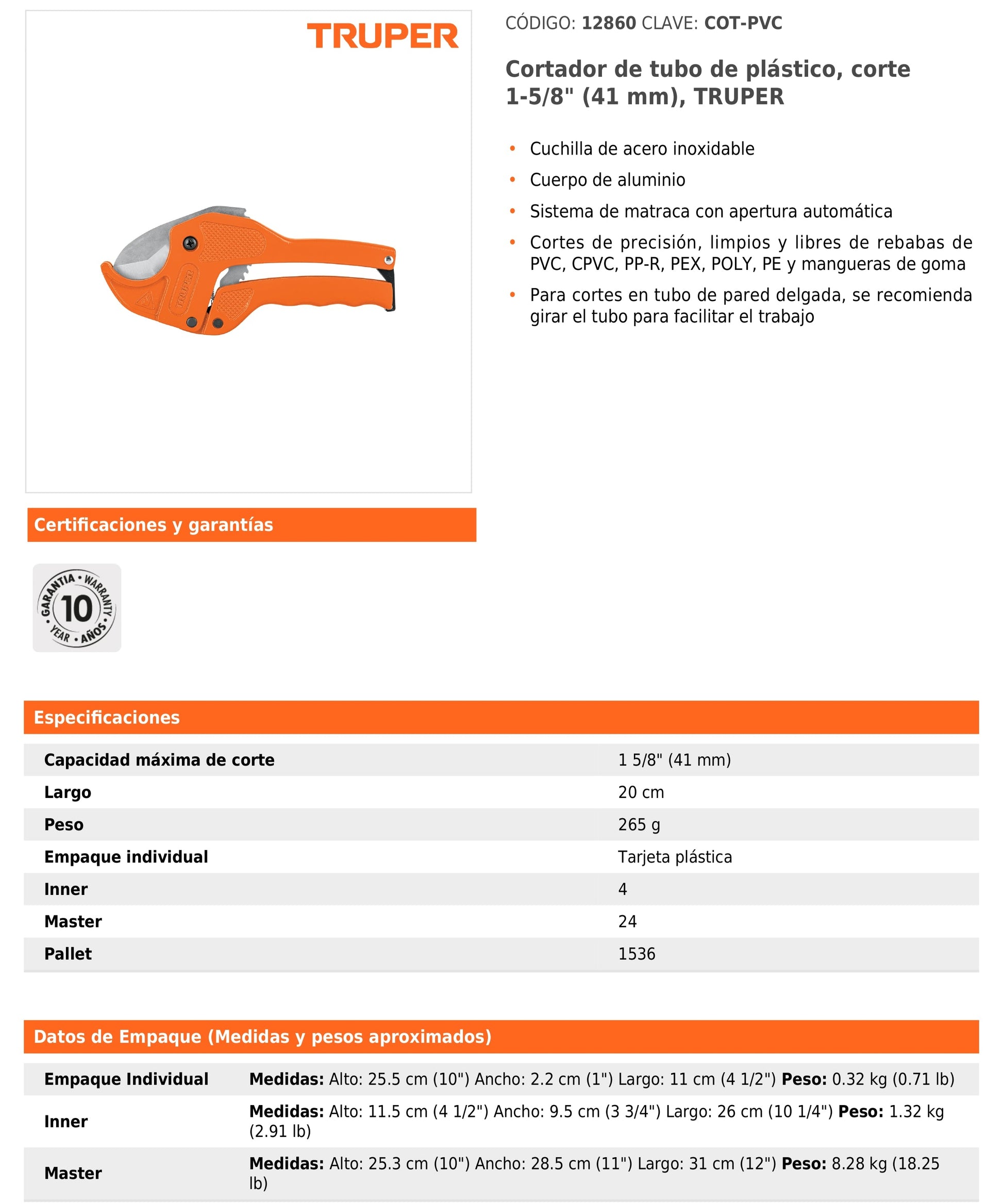 Este cortador Truper permite realizar cortes limpios y sin rebabas en tubos de PVC, CPVC, PP-R, PEX, POLY, PE y mangueras de goma.
