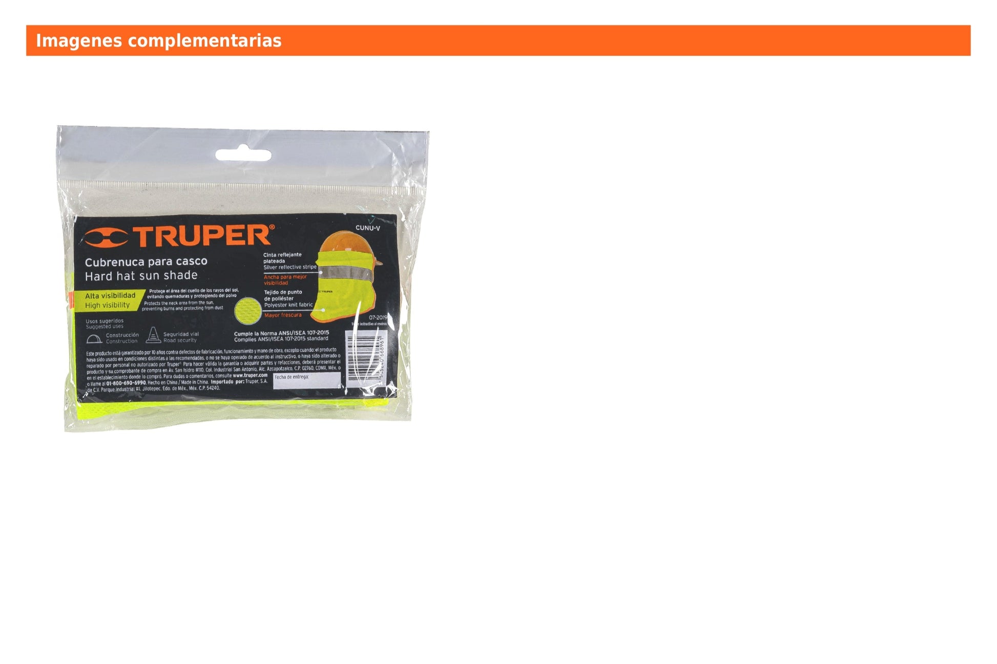 Se fija al casco mediante sistema hook and loop, es lavable y compatible con múltiples modelos de cascos industriales. Cumple con la norma ANSI/ISEA 107-2015.