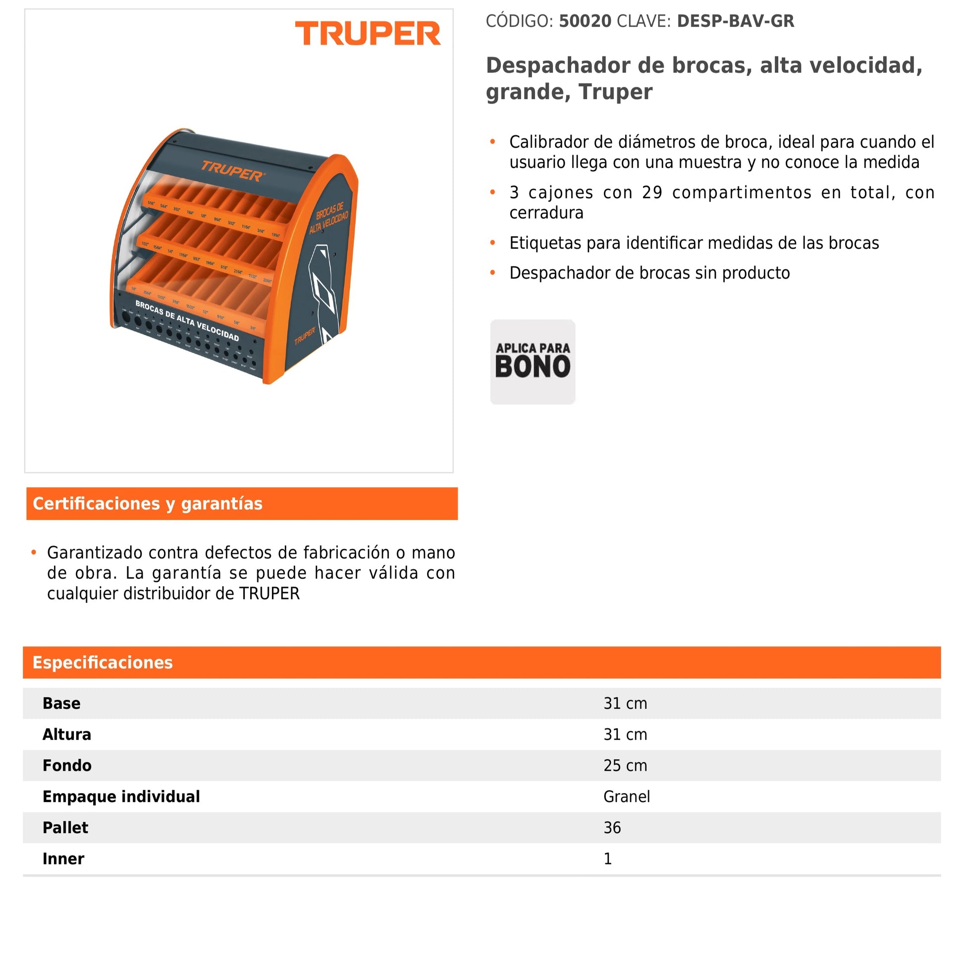 Este despachador de brocas está diseñado para organizar y dispensar brocas de alta velocidad de forma segura y eficiente. Cuenta con un calibrador de diámetros ideal para identificar medidas cuando el usuario no las conoce.